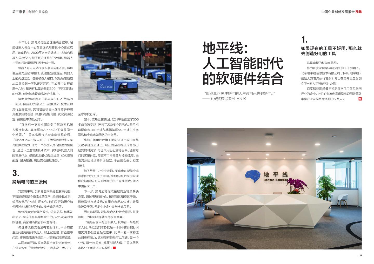 14 .第三章节 | 创新企业案例 中国企业创新发展报告 2018 1. 地平线: 今年9月,菜鸟又与圆通速递联合宣布,超 级机器人分拨中心在圆通杭州转运中心正式启 如果现有的工具不好用,那么就 用。高峰期内,2000平方米的场地内,350台机 去创造好用的工具 人工智能时代 器人昼夜作业,每天可分拣超50万包裹,机器人 三天的行驶里程足以绕地球一圈。 这是典型的科学家思维。 机器人可以自动根据包裹流向的不同,将包 作为百度深度学习研究院(IDL)创始人, 的软硬件结合 裹运到对应区域格口。到达指定位置后,机器人 北京地平线信息技术有限公司(下称:地平线) 上的托盘竖起,包裹被倒入格口,然后顺着通道 创始人兼首席执行官余凯博士在离开百度后创 从二层滑到一层包裹装运区,完成整个过程仅 立了一家人工智能芯片公司。 需十几秒。每天有批量去往近300个不同目的地 百度和谷歌是最早将深度学习用在互联网 的包裹,就被这套设备高效分拣集中。 “那些真正关注软件的人应该自己去做硬件。” 行业的企业,它们的专家也是最早意识到计算效 这也是今年5月31日菜鸟宣布的IoT战略的 —图灵奖获得者Alan K 率是行业发展巨大瓶颈的少数人。 一部分,目前正联合行业一起推进IoT技术在物 流行业的应用,实现包括机器人在内的多种物 流要素实时在线,并进行智能调度,优化资源配 全球寻找仓库。 置,提高效率降低成本。 如今,菜鸟已在美国、欧洲等地推出了300 “菜 鸟 有一 支 专 业 团 队专 门 解 决 多 机 器 多条物流专线,连接了230多个跨境仓,希望搭 人调 度 技 术,其 实 质与A l p haG o下棋 是 同 一 建面向未来的全球包裹运输网络、全球供应链 个 问 题。” 菜 鸟高 级 技 术 专家 李 建 军介 绍, 网络和全球末端网络的三张网。 “AlphaGo能击败人类,在于极强的预见性。菜 比如在阿里巴巴旗下面向全球市场的在线 鸟的算法能力,让每一个机器人具有极强的预见 交易平台速卖通上,现在的全程物流信息都已 性,通过人工智能加IoT技术,实现多机器人同 经实时可见了,再也不用担心货物丢失。还有专 时密集作业,提前规划最优搬运线路,优化资源 门的客服体系,商家不用再分散对接物流商。由 配置,避免碰撞,高效完成搬运任务。 “ 物流原因导致的纠纷退款,平台还会提供相应 赔付。 3. 除了帮助中小企业出海,菜鸟也在帮助全球 商家的好货加速进中国,比如新近上线的全球 跨境电商的三张网 供应链服务,可以到商家的生产源头接货,运达 中国各大口岸。 对菜鸟来说,创新的逻辑就是要解决问题, 下一步,菜鸟还将继续拓展商业物流解决 不管是提高整个物流业的效率,还是降低成本, 方案,通过布局海外仓、拓展海运和空运干线、 或是改善用户体验,而如今,他们又开始研究如 搭建海外末端设施,在重点市场加快推进智能 何通过创新解决买全球、卖全球的问题。 物流骨干网,帮助中小企业参与全球贸易。 传统跨境物流链路很长、环节又多,包裹发 而在这期间,能够整合各种社会资源,并按 出去了,物流信息经常是脱节的,没办法实时跟 照统一的规则运作就显得极为重要。 踪包裹,商家和消费者都只能等待。 “菜鸟目前只有三千多人,其中有一半是技 传 统跨境物流也没有客服体系,中小商家 术人员,所以我们本身就是一个协同的网络,网 遇到问题往往找不到人,加上配送慢、体验差等 络究竟怎么建立起效应来,比单一的一家物流 问题,传统物流无法满足中小商家的跨境贸易。 公司更有张力,这些没有经验可以借鉴,每一个 从两年前开始,菜鸟就联合商业物流伙伴, 业务,每一步探索,都要创新去做。”菜鸟网络 在全球各地开通物流专线,并且多次升级,并在 市场公关负责人牛智敬说。 24 . . 25