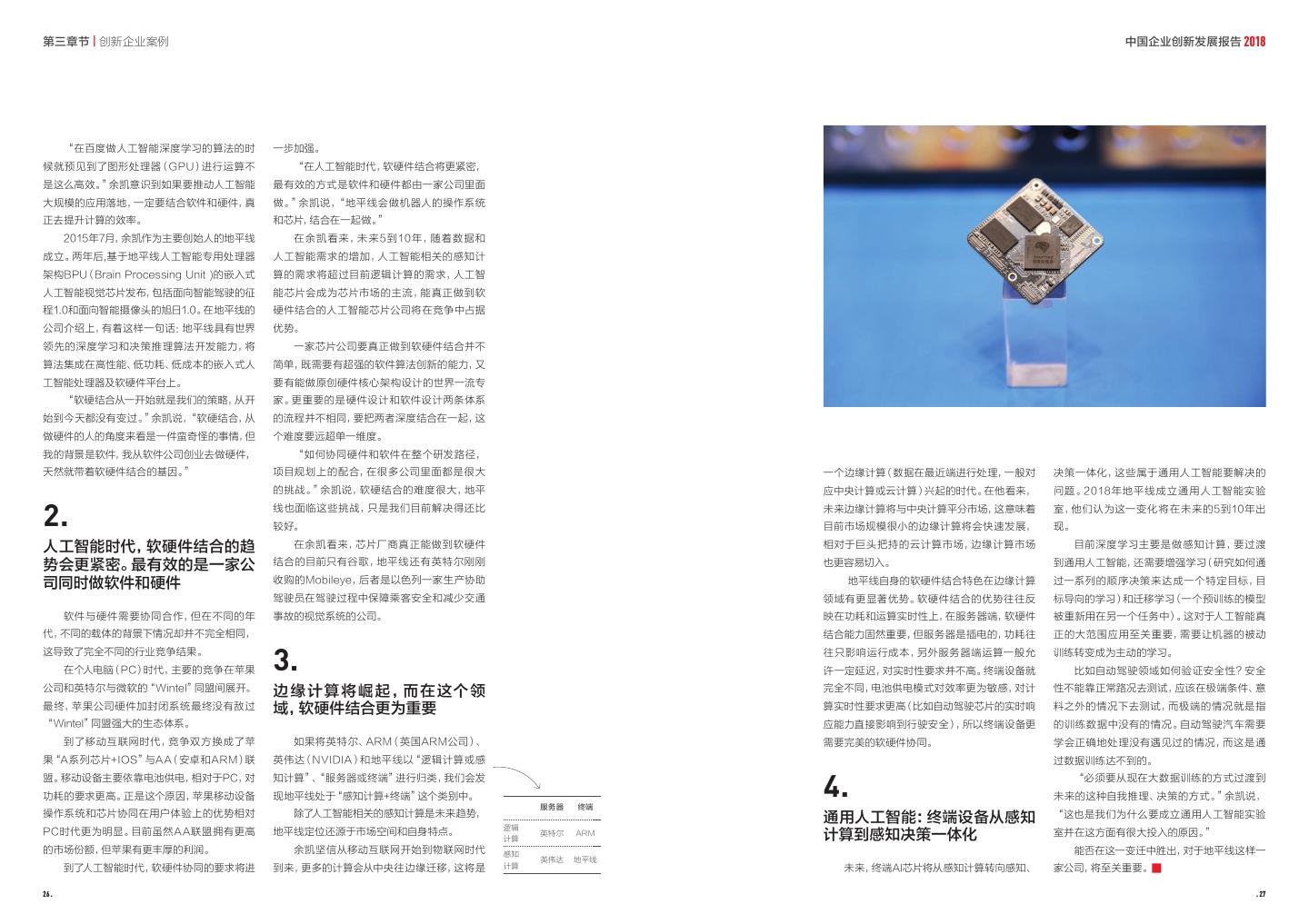 15 .第三章节 | 创新企业案例 中国企业创新发展报告 2018 “在百度做人工智能深度学习的算法的时 一步加强。 候就预见到了图形处理器(GPU)进行运算不 “在人工智能时代,软硬件结合将更紧密, 是这么高效。”余凯意识到如果要推动人工智能 最有效的方式是软件和硬件都由一家公司里面 大规模的应用落地,一定要结合软件和硬件,真 做。”余凯说, “地平线会做机器人的操作系统 正去提升计算的效率。 和芯片,结合在一起做。” 2015年7月,余凯作为主要创始人的地平线 在 余凯 看来,未 来5 到10 年,随着数 据和 成立。两年后,基于地平线人工智能专用处理器 人工智能需求的增加,人工智能相关的感知计 架构BPU(Brain Processing Unit )的嵌入式 算的需求将超过目前逻辑计算的需求,人工智 人工智能视觉芯片发布,包括面向智能驾驶的征 能芯片会成为芯片市场的主流,能真正做到软 程1.0和面向智能摄像头的旭日1.0。在地平线的 硬件结合的人工智能芯片公司将在竞争中占据 公司介绍上,有着这样一句话:地平线具有世界 优 势。 领先的深度学习和决策推理算法开发能力,将 一家芯片公司要真正做到软硬件结合并不 算法集成在高性能、低功耗、低成本的嵌入式人 简单,既需要有超强的软件算法创新的能力,又 工智能处理器及软硬件平台上。 要有能做原创硬件核心架构设计的世界一流专 “软硬结合从一开始就是我们的策略,从开 家。更重要的是硬件设计和软件设计两条体系 始到今天都没有变过。”余凯说, “软硬结合,从 的流程并不相同,要把两者深度结合在一起,这 做硬件的人的角度来看是一件蛮奇怪的事情,但 个难度要远超单一维度。 我的背景是软件,我从软件公司创业去做硬件, “如何协同硬件和软件在整个研发路径, 天然就带着软硬件结合的基因。” 项目规划上的配合,在很多公司里面都是很大 一个边缘计算(数据在最近端进行处理,一般对 决策一体化,这些属于通用人工智能要解决的 的挑战。”余凯说,软硬结合的难度很大,地平 应中央计算或云计算)兴起的时代。在他看来, 问题。2018 年地平 线成立 通 用人 工智能实 验 2. 线也面临这些挑战,只是我们目前解决得还比 较 好。 未来边缘计算将与中央计算平分市场,这意味着 目前市场规模很小的边缘计算将会快速发展, 室,他们认为这一变化 将在未来的5到10年出 现。 人工智能时代,软硬件结合的趋 在余凯 看来,芯片厂商真正能做到软硬件 相对于巨头把持的云计算市场,边缘计算市场 目前深度学习主要是做感知计算,要过渡 势会更紧密。最有效的是一家公 结合的目前只有谷歌,地平线还有英特尔刚刚 也更容易切入。 到通用人工智能,还需要增强学习(研究如何通 司同时做软件和硬件 收购的Mobileye,后者是以色列一家生产协助 地平线自身的软硬件结合特色在边缘计算 过一系列的顺序决策来达成一个特定目标,目 驾驶员在驾驶过程中保障乘客安全和减少交通 领域有更显著优势。软硬件结合的优势往往反 标导向的学习)和迁移学习(一个预训练的模型 软件与硬件需要协同合作,但在不同的年 事故的视觉系统的公司。 映在功耗和运算实时性上,在服务器端,软硬件 被重新用在另一个任务中)。这对于人工智能真 代,不同的载体的背景下情况却并不完全相同, 结合能力固然重要,但服务器是插电的,功耗往 正的大范围应用至关重要,需要让机器的被动 这导致了完全不同的行业竞争结果。 在个人电脑(PC)时代,主要的竞争在苹果 3. 往只影响运行成本,另外服务器端运算一般允 许一定延迟,对实时性要求并不高。终端设备就 训练转变成为主动的学习。 比如自动驾驶领域如何验证安全性?安全 公司和英特尔与微软的“Wintel”同盟间展开。 边 缘 计算 将 崛 起,而 在 这个 领 完全不同,电池供电模式对效率更为敏感,对计 性不能靠正常路况去测试,应该在极端条件、意 最终,苹果公司硬件加封闭系统最终没有敌过 域,软硬件结合更为重要 算实时性要求更高(比如自动驾驶芯片的实时响 料之外的情况下去测试,而极端的情况就是指 “Wintel”同盟强大的生态体系。 应能力直接影响到行驶安全),所以终端设备更 的训练数据中没有的情况。自动驾驶汽车需要 到了移动互联网时代,竞争双方换 成了苹 如果将英特尔、ARM(英国ARM公司)、 需要完美的软硬件协同。 学会正确地处理没有遇见过的情况,而这是通 果“A系列芯片+IOS”与A A(安卓和ARM)联 英伟达(NVIDIA)和地平线以“逻辑计算或感 过数据训练达不到的。 4. 盟。移动设备主要依靠电池供电,相对于PC,对 知计算”、 “服务器或终端”进行归类,我们会发 “必须要从现在大数据训练的方式过渡到 功耗的要求更高。正是这个原因,苹果移动设备 现地平线处于“感知计算+终端”这个类别中。 未来的这种自我推理、决策的方式。”余凯说, 服务器 终端 操作系统和芯片协同在用户体验上的优势相对 除了人工智能相关的感知计算是未来趋势, 通用人工智能:终端设备从感知 “这也是我们为什么要成立通用人工智能实验 逻辑 PC时代更为明显。目前虽然A A联盟拥有更高 地平线定位还源于市场空间和自身特点。 英特尔 ARM 计算到感知决策一体化 室并在这方面有很大投入的原因。” 计算 的市场份额,但苹果有更丰厚的利润。 余凯坚信从移动互联网开始到物联网时