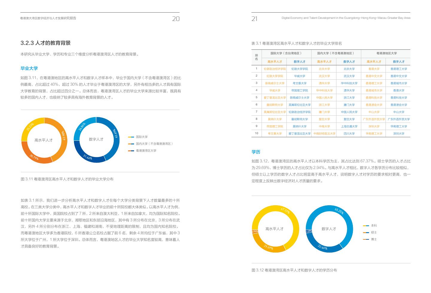 15 .粤港澳大湾区数字经济与人才发展研究报告 20 21 Digital Economy and Talent Development in the Guangdong- Hong Kong- Macau Greater Bay Area 3.2.3 人才的教育背景 表 3.1 粤港澳湾区高水平人才和数字人才的毕业大学排名 本研究从毕业大学、学历和专业三个维度分析粤港澳湾区人才的教育背景。 国际大学(含台湾地区) 国内大学(不含粤港澳地区) 粤港澳地区大学 排 名 高水平人才 数字人才 高水平人才 数字人才 高水平人才 数字人才 毕业大学 1 伦敦政治经济学院 伦敦大学学院 北京大学 北京大学 香港大学 香港理工大学 2 伦敦大学学院 华威大学 武汉大学 武汉大学 香港中文大学 香港中文大学 如图 3.11,在粤港澳地区的高水平人才和数字人才样本中,毕业于国内大学(不含粤港澳湾区)的比 3 新南威尔士大学 考文垂大学 清华大学 华中科技大学 香港理工大学 香港城市大学 例最高,占比超过 40%,超过 30% 的人才毕业于粤港澳湾区的大学,另外有相当多的人才具有国际 大学教育的背景,占比超过四分之一。总体而言,粤港澳湾区人才的毕业大学来源比较丰富,既具有 4 华威大学 帝国理工学院 华中科技大学 清华大学 香港城市大学 香港大学 较多的国内人才,也吸纳了较多具有海外教育背景的人才。 5 爱丁堡龙比亚大学 新南威尔士大学 中国人民大学 浙江大学 香港科技大学 香港科技大学 6 曼彻斯特大学 英属哥伦比亚大学 浙江大学 厦门大学 香港浸会大学 香港浸会大学 7 英属哥伦比亚大学 伦敦政治经济学院 厦门大学 中国人民大学 中山大学 中山大学 8 莫纳什大学 曼彻斯特大学 复旦大学 复旦大学 广东外语外贸大学 广东外语外贸大学 % % 9 帝国理工学院 莫纳什大学 中南大学 上海交通大学 深圳大学 华南理工大学 .86 .23 24 25 % 4 3. 9 8 % 4 3. 4 9 10 考文垂大学 爱丁堡龙比亚大学 中南财经政法大学 四川大学 华南理工大学 深圳大学 国际大学 高水平人才 数字人才 海外大学毕业(含台湾) 国内大学毕业(不含港粤澳地区) 国内大学(不含粤港澳湾区) 粤港澳地区大学毕业 粤港澳湾区大学 学历 30 31 .7 9 .6 4 % % 如图 3.12,粤港澳湾区的高水平人才以本科学历为主,其占比达到 67.37%。硕士学历的人才占比 为 29.69%,博士学历的人才占比仅为 2.94%。与高水平人才相比,数字人才各学历分布比较相似, 但硕士以上学历的数字人才占比明显高于高水平人才,说明数字人才对学历的要求相对更高,也一 图 3.11 粤港澳湾区高水平人才和数字人才的毕业大学分布 定程度上反映出数字经济对人才质量的要求。 如表 3.1 所示,我们进一步分析高水平人才和数字人才在每个大学分类背景下人才数量最多的十所 高校。在三类大学分类中,高水平人才和数字人才毕业的前十所院校都大体类似。以高水平人才为例, 67.3 65.2 7% 5% 前十所国际大学中,英国院校占到了 7 所,2 所来自澳大利亚,1 所来自加拿大,均为国际知名院校。 前十所国内大学主要来源于北京、湘鄂地区和东部沿海地区,其中有 3 所分布在北京,3 所分布在武 汉,另外 4 所分别分布在浙江、上海、福建和湖南,不受地理距离的限制,且均为国内知名院校。 本科 高水平人才 数字人才 2.94% 2.28% 而粤港澳地区大学多为香港院校,6 所香港公立名校占据了前 6 名,剩余 4 所均位于广东省,其中 3 硕士 所大学位于广州,1 所大学位于深圳。总体而言,粤港澳地区人才的毕业大学知名度较高,意味着人 博士 才具备良好的教育背景。 29 32 .6 9 % .4 6 % 图 3.12 粤港澳湾区高水平人才和数字人才的学历分布