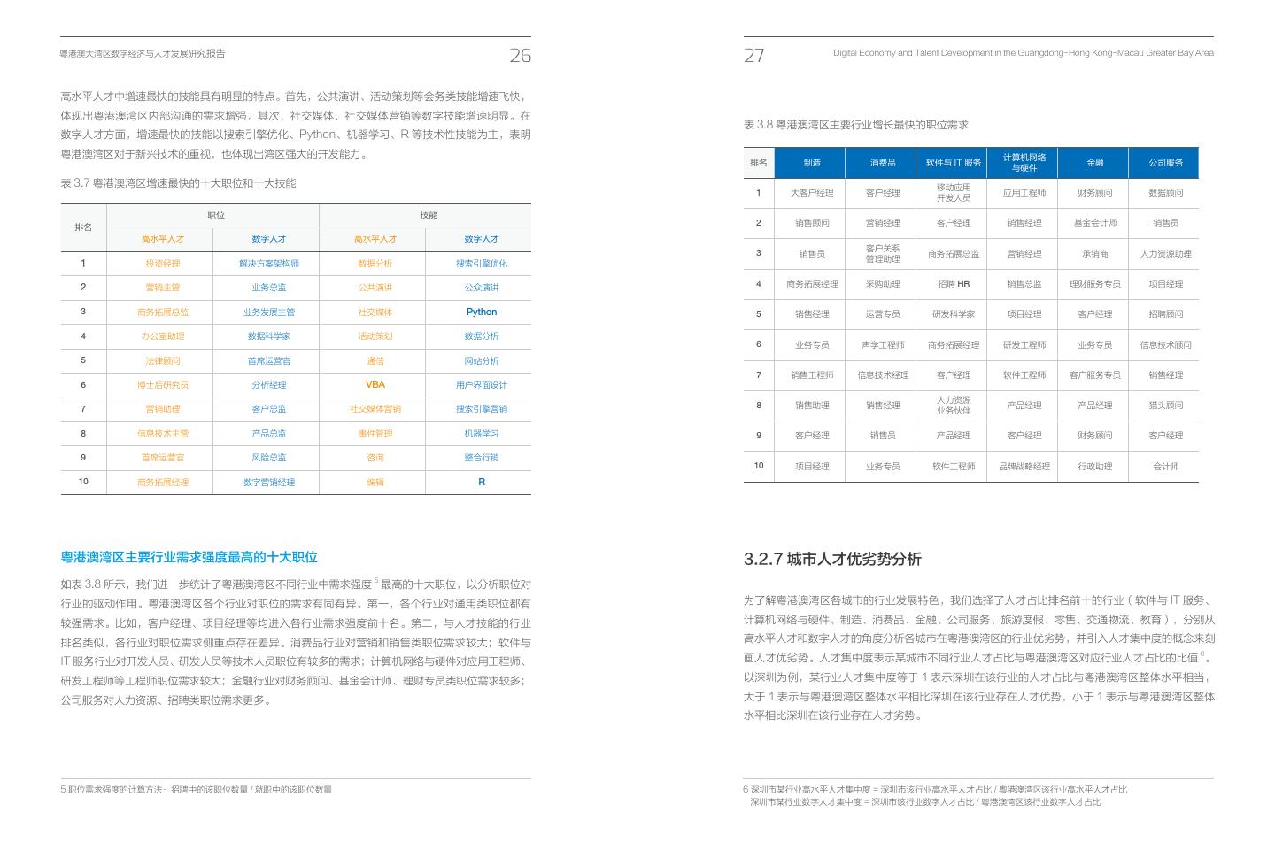 18 .粤港澳大湾区数字经济与人才发展研究报告 26 27 Digital Economy and Talent Development in the Guangdong- Hong Kong- Macau Greater Bay Area 高水平人才中增速最快的技能具有明显的特点。首先,公共演讲、活动策划等会务类技能增速飞快, 体现出粤港澳湾区内部沟通的需求增强。其次,社交媒体、社交媒体营销等数字技能增速明显。在 表 3.8 粤港澳湾区主要行业增长最快的职位需求 数字人才方面,增速最快的技能以搜索引擎优化、Python、机器学习、R 等技术性技能为主,表明 粤港澳湾区对于新兴技术的重视,也体现出湾区强大的开发能力。 计算机网络 排名 制造 消费品 软件与 IT 服务 金融 公司服务 与硬件 表 3.7 粤港澳湾区增速最快的十大职位和十大技能 移动应用 1 大客户经理 客户经理 应用工程师 财务顾问 数据顾问 开发人员 职位 技能 排名 2 销售顾问 营销经理 客户经理 销售经理 基金会计师 销售员 高水平人才 数字人才 高水平人才 数字人才 客户关系 3 销售员 商务拓展总监 营销经理 承销商 人力资源助理 管理助理 1 投资经理 解决方案架构师 数据分析 搜索引擎优化 2 营销主管 业务总监 公共演讲 公众演讲 4 商务拓展经理 采购助理 招聘 HR 销售总监 理财服务专员 项目经理 3 商务拓展总监 业务发展主管 社交媒体 Python 5 销售经理 运营专员 研发科学家 项目经理 客户经理 招聘顾问 4 办公室助理 数据科学家 活动策划 数据分析 6 业务专员 声学工程师 商务拓展经理 研发工程师 业务专员 信息技术顾问 5 法律顾问 首席运营官 通信 网站分析 7 销售工程师 信息技术经理 客户经理 软件工程师 客户服务专员 销售经理 6 博士后研究员 分析经理 VBA 用户界面设计 人力资源 7 营销助理 客户总监 社交媒体营销 搜索引擎营销 8 销售助理 销售经理 产品经理 产品经理 猎头顾问 业务伙伴 8 信息技术主管 产品总监 事件管理 机器学习 9 客户经理 销售员 产品经理 客户经理 财务顾问 客户经理 9 首席运营官 风险总监 咨询 整合行销 10 项目经理 业务专员 软件工程师 品牌战略经理 行政助理 会计师 10 商务拓展经理 数字营销经理 编辑 R 粤港澳湾区主要行业需求强度最高的十大职位 3.2.7 城市人才优劣势分析 如表 3.8 所示,我们进一步统计了粤港澳湾区不同行业中需求强度 5 最高的十大职位,以分析职位对 行业的驱动作用。粤港澳湾区各个行业对职位的需求有同有异。第一,各个行业对通用类职位都有 为了解粤港澳湾区各城市的行业发展特色,我们选择了人才占比排名前十的行业(软件与 IT 服务、 较强需求。比如,客户经理、项目经理等均进入各行业需求强度前十名。第二,与人才技能的行业 计算机网络与硬件、制造、消费品、金融、公司服务、旅游度假、零售、交通物流、教育),分别从 排名类似,各行业对职位需求侧重点存在差异。消费品行业对营销和销售类职位需求较大;软件与 高水平人才和数字人才的角度分析各城市在粤港澳湾区的行业优劣势,并引入人才集中度的概念来刻 IT 服务行业对开发人员、研发人员等技术人员职位有较多的需求;计算机网络与硬件对应用工程师、 画人才优劣势。人才集中度表示某城市不同行业人才占比与粤港澳湾区对应行业人才占比的比值 6。 研发工程师等工程师职位需求较大;金融行业对财务顾问、基金会计师、理财专员类职位需求较多; 以深圳为例,某行业人才集中度等于 1 表示深圳在该行业的人才占比与粤港澳湾区整体水平相当, 公司服务对人力资源、招聘类职位需求更多。 大于 1 表示与粤港澳湾区整体水平相比深圳在该行业存在人才优势,小于 1 表示与粤港澳湾区整体 水平相比深圳在该行业存在人才劣势。 5 职位需求强度的计算方法:招聘中的该职位数量 / 就职中的该职位数量 6 深圳市某行业高水平人才集中度 = 深圳市该行业高水平人才占比 / 粤港澳湾区该行业高水平人才占比 深圳市某行业数字人才集中度 = 深圳市该行业数字人才占比 / 粤港澳湾区该行业数字人才占比