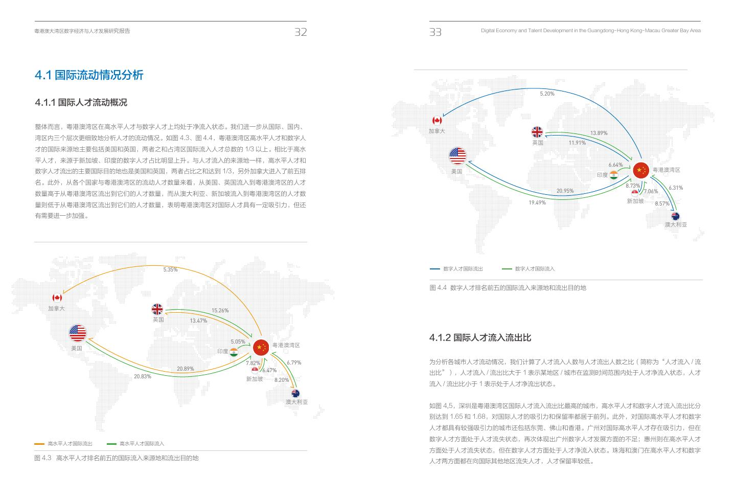 21 .粤港澳大湾区数字经济与人才发展研究报告 32 33 Digital Economy and Talent Development in the Guangdong- Hong Kong- Macau Greater Bay Area 4.1 国际流动情况分析 5.20% 4.1.1 国际人才流动概况 整体而言,粤港澳湾区在高水平人才与数字人才上均处于净流入状态。我们进一步从国际、国内、 加拿大 13.89% 湾区内三个层次更细致地分析人才的流动情况。如图 4.3、图 4.4,粤港澳湾区高水平人才和数字人 英国 11.91% 才的国际来源地主要包括美国和英国,两者之和占湾区国际流入人才总数的 1/3 以上。相比于高水 平人才,来源于新加坡、印度的数字人才占比明显上升。与人才流入的来源地一样,高水平人才和 6.64% 数字人才流出的主要国际目的地也是美国和英国,两者占比之和达到 1/3,另外加拿大进入了前五排 美国 粤港澳湾区 印度 名。此外,从各个国家与粤港澳湾区的流动人才数量来看,从美国、英国流入到粤港澳湾区的人才 8.73% 6.31% 20.95% 7.06% 数量高于从粤港澳湾区流出到它们的人才数量,而从澳大利亚、新加坡流入到粤港澳湾区的人才数 19.49% 新加坡 8.57% 量则低于从粤港澳湾区流出到它们的人才数量,表明粤港澳湾区对国际人才具有一定吸引力,但还 有需要进一步加强。 澳大利亚 5.35% 数字国际人才流出 数字人才国际流出 数字人才国际流入 数字国际人才流入 图 4.4 数字人才排名前五的国际流入来源地和流出目的地 加拿大 15.26% 英国 13.47% 5.05% 4.1.2 国际人才流入流出比 粤港澳湾区 美国 印度 7.82% 6.79% 为分析各城市人才流动情况,我们计算了人才流入人数与人才流出人数之比(简称为“人才流入 / 流 20.89% 6.47% 出比”),人才流入 / 流出比大于 1 表示某地区 / 城市在监测时间范围内处于人才净流入状态,人才 20.83% 新加坡 8.20% 流入 / 流出比小于 1 表示处于人才净流出状态。 澳大利亚 如图 4,5,深圳是粤港澳湾区国际人才流入流出比最高的城市,高水平人才和数字人才流入流出比分 别达到 1.65 和 1.68,对国际人才的吸引力和保留率都居于前列。此外,对国际高水平人才和数字 人才都具有较强吸引力的城市还包括东莞、佛山和香港。广州对国际高水平人才存在吸引力,但在 数字人才方面处于人才流失状态,再次体现出广州数字人才发展方面的不足;惠州则在高水平人才 高水平人才国际流出 高水平国际人才流出 高水平人才国际流入 高水平国际人才流入 方面处于人才流失状态,但在数字人才方面处于人才净流入状态。珠海和澳门在高水平人才和数字 图 4.3 高水平人才排名前五的国际流入来源地和流出目的地 人才两方面都在向国际其他地区流失人才,人才保留率较低。