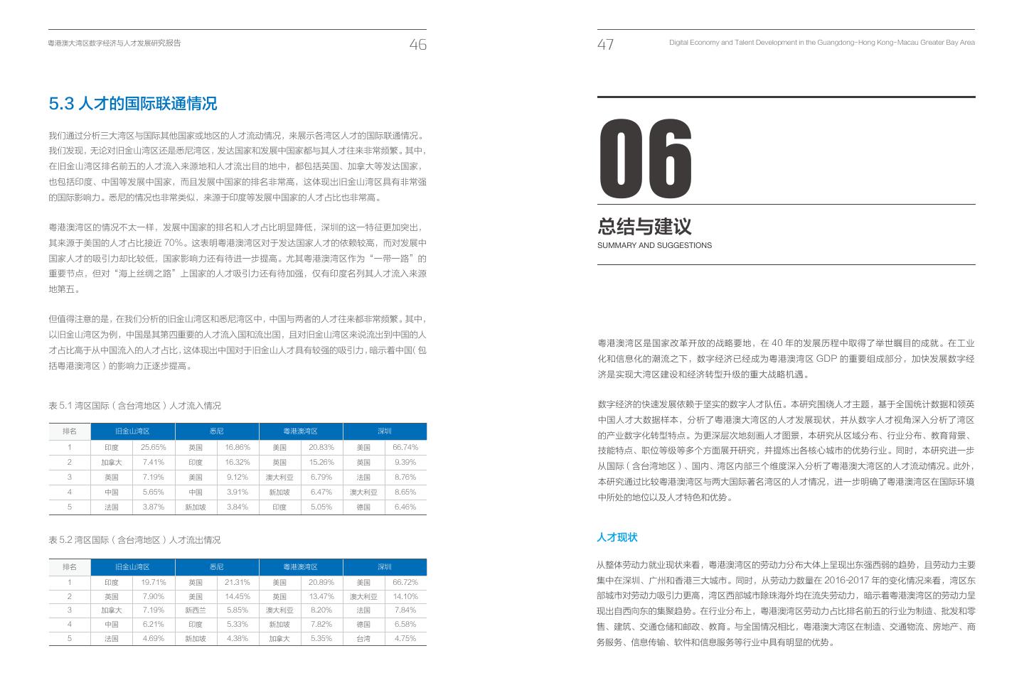28 .粤港澳大湾区数字经济与人才发展研究报告 46 47 Digital Economy and Talent Development in the Guangdong- Hong Kong- Macau Greater Bay Area 5.3 人才的国际联通情况 06 我们通过分析三大湾区与国际其他国家或地区的人才流动情况,来展示各湾区人才的国际联通情况。 我们发现,无论对旧金山湾区还是悉尼湾区,发达国家和发展中国家都与其人才往来非常频繁。其中, 在旧金山湾区排名前五的人才流入来源地和人才流出目的地中,都包括英国、加拿大等发达国家, 也包括印度、中国等发展中国家,而且发展中国家的排名非常高,这体现出旧金山湾区具有非常强 的国际影响力。悉尼的情况也非常类似,来源于印度等发展中国家的人才占比也非常高。 粤港澳湾区的情况不太一样,发展中国家的排名和人才占比明显降低,深圳的这一特征更加突出, 总结与建议 其来源于美国的人才占比接近 70%。这表明粤港澳湾区对于发达国家人才的依赖较高,而对发展中 SUMMARY AND SUGGESTIONS 国家人才的吸引力却比较低,国家影响力还有待进一步提高。尤其粤港澳湾区作为“一带一路”的 重要节点,但对“海上丝绸之路”上国家的人才吸引力还有待加强,仅有印度名列其人才流入来源 地第五。 但值得注意的是,在我们分析的旧金山湾区和悉尼湾区中,中国与两者的人才往来都非常频繁。其中, 以旧金山湾区为例,中国是其第四重要的人才流入国和流出国,且对旧金山湾区来说流出到中国的人 粤港澳湾区是国家改革开放的战略要地,在 40 年的发展历程中取得了举世瞩目的成就。在工业 才占比高于从中国流入的人才占比,这体现出中国对于旧金山人才具有较强的吸引力,暗示着中国(包 化和信息化的潮流之下,数字经济已经成为粤港澳湾区 GDP 的重要组成部分,加快发展数字经 括粤港澳湾区)的影响力正逐步提高。 济是实现大湾区建设和经济转型升级的重大战略机遇。 表 5.1 湾区国际(含台湾地区)人才流入情况 数字经济的快速发展依赖于坚实的数字人才队伍。本研究围绕人才主题,基于全国统计数据和领英 中国人才大数据样本,分析了粤港澳大湾区的人才发展现状,并从数字人才视角深入分析了湾区 排名 旧金山湾区 悉尼 粤港澳湾区 深圳 的产业数字化转型特点。为更深层次地刻画人才图景,本研究从区域分布、行业分布、教育背景、 1 印度 25.65% 英国 16.86% 美国 20.83% 美国 66.74% 技能特点、职位等级等多个方面展开研究,并提炼出各核心城市的优势行业。同时,本研究进一步 2 加拿大 7.41% 印度 16.32% 英国 15.26% 英国 9.39% 从国际(含台湾地区)、国内、湾区内部三个维度深入分析了粤港澳大湾区的人才流动情况。此外, 3 英国 7.19% 美国 9.12% 澳大利亚 6.79% 法国 8.76% 本研究通过比较粤港澳湾区与两大国际著名湾区的人才情况,进一步明确了粤港澳湾区在国际环境 4 中国 5.65% 中国 3.91% 新加坡 6.47% 澳大利亚 8.65% 中所处的地位以及人才特色和优势。 5 法国 3.87% 新加坡 3.84% 印度 5.05% 德国 6.46% 表 5.2 湾区国际(含台湾地区)人才流出情况 人才现状 排名 旧金山湾区 悉尼 粤港澳湾区 深圳 从整体劳动力就业现状来看,粤港澳湾区的劳动力分布大体上呈现出东强西弱的趋势,且劳动力主要 1 印度 19.71% 英国 21.31% 美国 20.89% 美国 66.72% 集中在深圳、广州和香港三大城市。同时,从劳动力数量在 2016-2017 年的变化情况来看,湾区东 2 英国 7.90% 美国 14.45% 英国 13.47% 澳大利亚 14.10% 部城市对劳动力吸引力更高,湾区西部城市除珠海外均在流失劳动力,暗示着粤港澳湾区的劳动力呈 3 加拿大 7.19% 新西兰 5.85% 澳大利亚 8.20% 法国 7.84% 现出自西向东的集聚趋势。在行业分布上,粤港澳湾区劳动力占比排名前五的行业为制造、批发和零 4 中国 6.21% 印度 5.33% 新加坡 7.82% 德国 6.58% 售、建筑、交通仓储和邮政、教育。与全国情况相比,粤港澳大湾区在制造、交通物流、房地产、商 5 法国 4.69% 新加坡 4.38% 加拿大 5.35% 台湾 4.75% 务服务、信息传输、软件和信息服务等行业中具有明显的优势。
