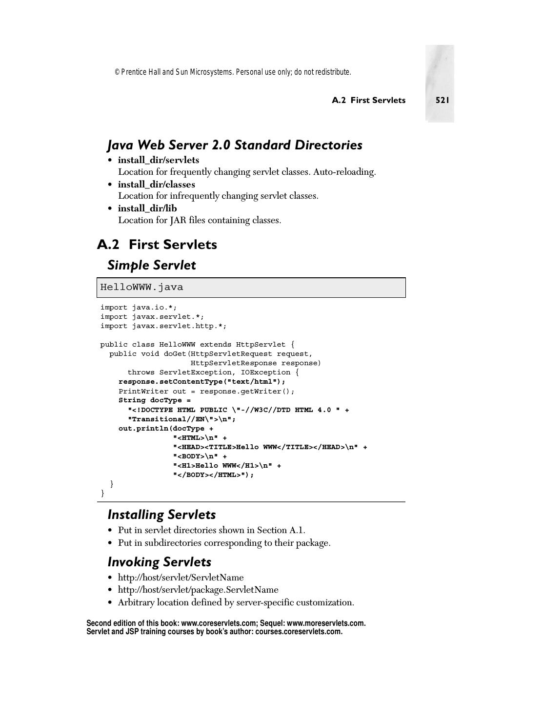 4 . © Prentice Hall and Sun Microsystems. Personal use only; do not redistribute. A.2 First Servlets 521 Java Web Server 2.0 Standard Directories • install_dir/servlets Location for frequently changing servlet classes. Auto-reloading. • install_dir/classes Location for infrequently changing servlet classes. • install_dir/lib Location for JAR files containing classes. A.2 First Servlets Simple Servlet HelloWWW.java import java.io.*; import javax.servlet.*; import javax.servlet.http.*; public class HelloWWW extends HttpServlet { public void doGet(HttpServletRequest request, HttpServletResponse response) throws ServletException, IOException { response.setContentType("text/html"); PrintWriter out = response.getWriter(); String docType = "<!DOCTYPE HTML PUBLIC \"-//W3C//DTD HTML 4.0 " + "Transitional//EN\">\n"; out.println(docType + "<HTML>\n" + "<HEAD><TITLE>Hello WWW</TITLE></HEAD>\n" + "<BODY>\n" + "<H1>Hello WWW</H1>\n" + "</BODY></HTML>"); } } Installing Servlets • Put in servlet directories shown in Section A.1. • Put in subdirectories corresponding to their package. Invoking Servlets • http://host/servlet/ServletName • http://host/servlet/package.ServletName • Arbitrary location defined by server-specific customization. Second edition of this book: www.coreservlets.com; Sequel: www.moreservlets.com. Servlet and JSP training courses by book’s author: courses.coreservlets.com.