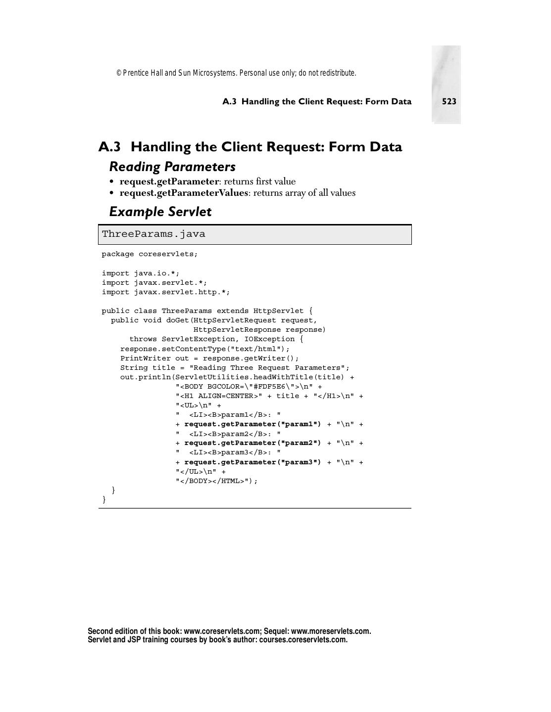 6 . © Prentice Hall and Sun Microsystems. Personal use only; do not redistribute. A.3 Handling the Client Request: Form Data 523 A.3 Handling the Client Request: Form Data Reading Parameters • request.getParameter: returns first value • request.getParameterValues: returns array of all values Example Servlet ThreeParams.java package coreservlets; import java.io.*; import javax.servlet.*; import javax.servlet.http.*; public class ThreeParams extends HttpServlet { public void doGet(HttpServletRequest request, HttpServletResponse response) throws ServletException, IOException { response.setContentType("text/html"); PrintWriter out = response.getWriter(); String title = "Reading Three Request Parameters"; out.println(ServletUtilities.headWithTitle(title) + "<BODY BGCOLOR=\"#FDF5E6\">\n" + "<H1 ALIGN=CENTER>" + title + "</H1>\n" + "<UL>\n" + " <LI><B>param1</B>: " + request.getParameter("param1") + "\n" + " <LI><B>param2</B>: " + request.getParameter("param2") + "\n" + " <LI><B>param3</B>: " + request.getParameter("param3") + "\n" + "</UL>\n" + "</BODY></HTML>"); } } Second edition of this book: www.coreservlets.com; Sequel: www.moreservlets.com. Servlet and JSP training courses by book’s author: courses.coreservlets.com.