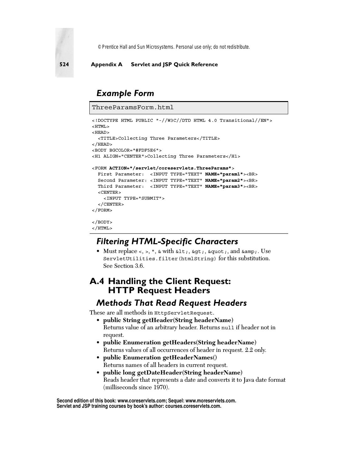 7 . © Prentice Hall and Sun Microsystems. Personal use only; do not redistribute. 524 Appendix A Servlet and JSP Quick Reference Example Form ThreeParamsForm.html <!DOCTYPE HTML PUBLIC "-//W3C//DTD HTML 4.0 Transitional//EN"> <HTML> <HEAD> <TITLE>Collecting Three Parameters</TITLE> </HEAD> <BODY BGCOLOR="#FDF5E6"> <H1 ALIGN="CENTER">Collecting Three Parameters</H1> <FORM ACTION="/servlet/coreservlets.ThreeParams"> First Parameter: <INPUT TYPE="TEXT" NAME="param1"><BR> Second Parameter: <INPUT TYPE="TEXT" NAME="param2"><BR> Third Parameter: <INPUT TYPE="TEXT" NAME="param3"><BR> <CENTER> <INPUT TYPE="SUBMIT"> </CENTER> </FORM> </BODY> </HTML> Filtering HTML-Specific Characters • Must replace <, >, ", & with <, >, ", and &. Use ServletUtilities.filter(htmlString) for this substitution. See Section 3.6. A.4 Handling the Client Request: HTTP Request Headers Methods That Read Request Headers These are all methods in HttpServletRequest. • public String getHeader(String headerName) Returns value of an arbitrary header. Returns null if header not in request. • public Enumeration getHeaders(String headerName) Returns values of all occurrences of header in request. 2.2 only. • public Enumeration getHeaderNames() Returns names of all headers in current request. • public long getDateHeader(String headerName) Reads header that represents a date and converts it to Java date format (milliseconds since 1970). Second edition of this book: www.coreservlets.com; Sequel: www.moreservlets.com. Servlet and JSP training courses by book’s author: courses.coreservlets.com.