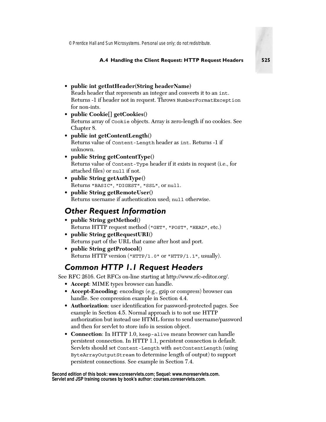 8 . © Prentice Hall and Sun Microsystems. Personal use only; do not redistribute. A.4 Handling the Client Request: HTTP Request Headers 525 • public int getIntHeader(String headerName) Reads header that represents an integer and converts it to an int. Returns -1 if header not in request. Throws NumberFormatException for non-ints. • public Cookie[] getCookies() Returns array of Cookie objects. Array is zero-length if no cookies. See Chapter 8. • public int getContentLength() Returns value of Content-Length header as int. Returns -1 if unknown. • public String getContentType() Returns value of Content-Type header if it exists in request (i.e., for attached files) or null if not. • public String getAuthType() Returns "BASIC", "DIGEST", "SSL", or null. • public String getRemoteUser() Returns username if authentication used; null otherwise. Other Request Information • public String getMethod() Returns HTTP request method ("GET", "POST", "HEAD", etc.) • public String getRequestURI() Returns part of the URL that came after host and port. • public String getProtocol() Returns HTTP version ("HTTP/1.0" or "HTTP/1.1", usually). Common HTTP 1.1 Request Headers See RFC 2616. Get RFCs on-line starting at http://www.rfc-editor.org/. • Accept: MIME types browser can handle. • Accept-Encoding: encodings (e.g., gzip or compress) browser can handle. See compression example in Section 4.4. • Authorization: user identification for password-protected pages. See example in Section 4.5. Normal approach is to not use HTTP authorization but instead use HTML forms to send username/password and then for servlet to store info in session object. • Connection: In HTTP 1.0, keep-alive means browser can handle persistent connection. In HTTP 1.1, persistent connection is default. Servlets should set Content-Length with setContentLength (using ByteArrayOutputStream to determine length of output) to support persistent connections. See example in Section 7.4. Second edition of this book: www.coreservlets.com; Sequel: www.moreservlets.com. Servlet and JSP training courses by book’s author: courses.coreservlets.com.