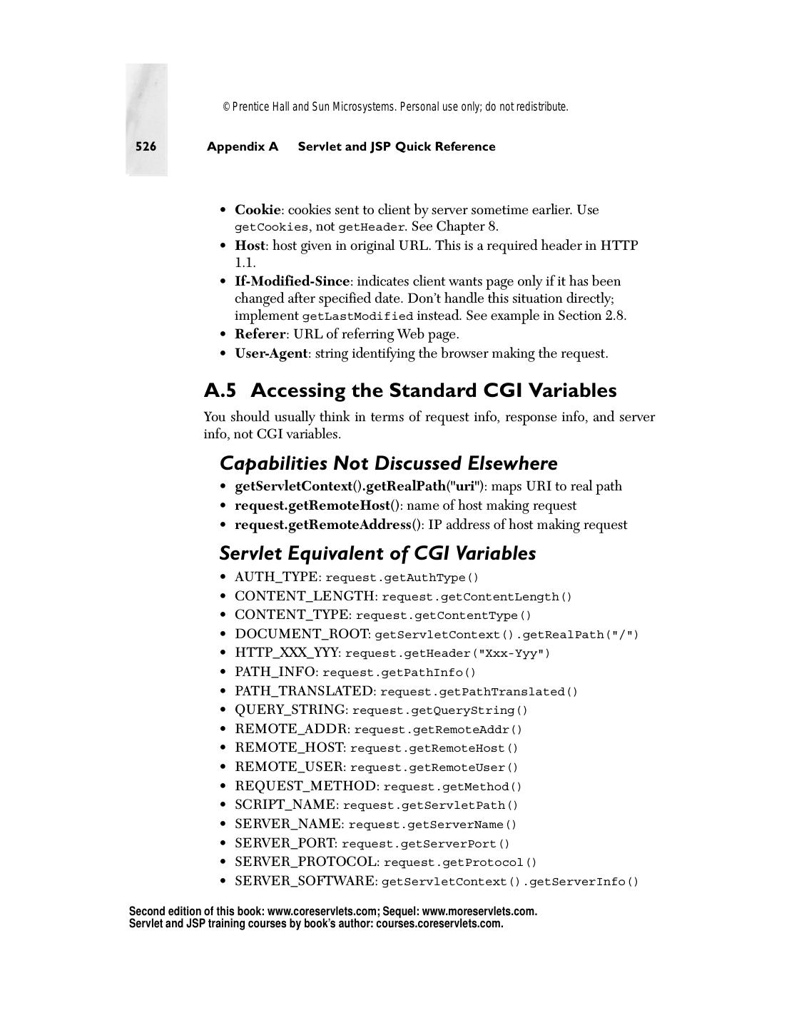 9 . © Prentice Hall and Sun Microsystems. Personal use only; do not redistribute. 526 Appendix A Servlet and JSP Quick Reference • Cookie: cookies sent to client by server sometime earlier. Use getCookies, not getHeader. See Chapter 8. • Host: host given in original URL. This is a required header in HTTP 1.1. • If-Modified-Since: indicates client wants page only if it has been changed after specified date. Don’t handle this situation directly; implement getLastModified instead. See example in Section 2.8. • Referer: URL of referring Web page. • User-Agent: string identifying the browser making the request. A.5 Accessing the Standard CGI Variables You should usually think in terms of request info, response info, and server info, not CGI variables. Capabilities Not Discussed Elsewhere • getServletContext().getRealPath("uri"): maps URI to real path • request.getRemoteHost(): name of host making request • request.getRemoteAddress(): IP address of host making request Servlet Equivalent of CGI Variables • AUTH_TYPE: request.getAuthType() • CONTENT_LENGTH: request.getContentLength() • CONTENT_TYPE: request.getContentType() • DOCUMENT_ROOT: getServletContext().getRealPath("/") • HTTP_XXX_YYY: request.getHeader("Xxx-Yyy") • PATH_INFO: request.getPathInfo() • PATH_TRANSLATED: request.getPathTranslated() • QUERY_STRING: request.getQueryString() • REMOTE_ADDR: request.getRemoteAddr() • REMOTE_HOST: request.getRemoteHost() • REMOTE_USER: request.getRemoteUser() • REQUEST_METHOD: request.getMethod() • SCRIPT_NAME: request.getServletPath() • SERVER_NAME: request.getServerName() • SERVER_PORT: request.getServerPort() • SERVER_PROTOCOL: request.getProtocol() • SERVER_SOFTWARE: getServletContext().getServerInfo() Second edition of this book: www.coreservlets.com; Sequel: www.moreservlets.com. Servlet and JSP training courses by book’s author: courses.coreservlets.com.