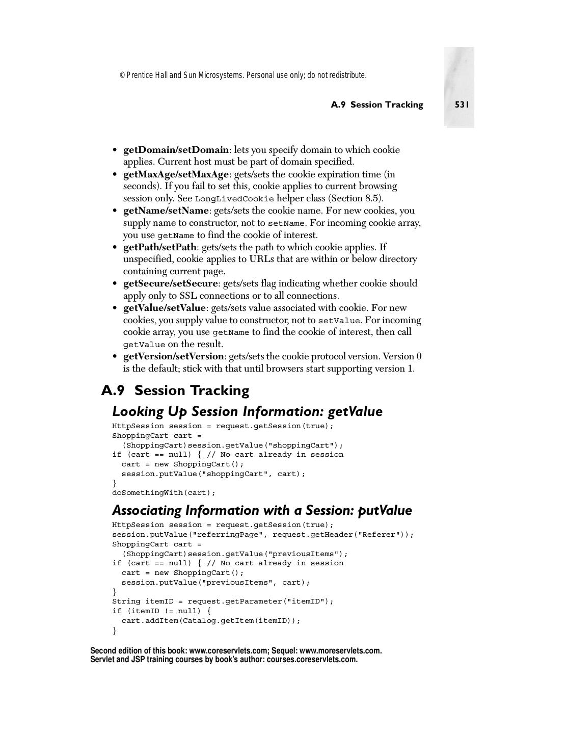 14 . © Prentice Hall and Sun Microsystems. Personal use only; do not redistribute. A.9 Session Tracking 531 • getDomain/setDomain: lets you specify domain to which cookie applies. Current host must be part of domain specified. • getMaxAge/setMaxAge: gets/sets the cookie expiration time (in seconds). If you fail to set this, cookie applies to current browsing session only. See LongLivedCookie helper class (Section 8.5). • getName/setName: gets/sets the cookie name. For new cookies, you supply name to constructor, not to setName. For incoming cookie array, you use getName to find the cookie of interest. • getPath/setPath: gets/sets the path to which cookie applies. If unspecified, cookie applies to URLs that are within or below directory containing current page. • getSecure/setSecure: gets/sets flag indicating whether cookie should apply only to SSL connections or to all connections. • getValue/setValue: gets/sets value associated with cookie. For new cookies, you supply value to constructor, not to setValue. For incoming cookie array, you use getName to find the cookie of interest, then call getValue on the result. • getVersion/setVersion: gets/sets the cookie protocol version. Version 0 is the default; stick with that until browsers start supporting version 1. A.9 Session Tracking Looking Up Session Information: getValue HttpSession session = request.getSession(true); ShoppingCart cart = (ShoppingCart)session.getValue("shoppingCart"); if (cart == null) { // No cart already in session cart = new ShoppingCart(); session.putValue("shoppingCart", cart); } doSomethingWith(cart); Associating Information with a Session: putValue HttpSession session = request.getSession(true); session.putValue("referringPage", request.getHeader("Referer")); ShoppingCart cart = (ShoppingCart)session.getValue("previousItems"); if (cart == null) { // No cart already in session cart = new ShoppingCart(); session.putValue("previousItems", cart); } String itemID = request.getParameter("itemID"); if (itemID != null) { cart.addItem(Catalog.getItem(itemID)); } Second edition of this book: www.coreservlets.com; Sequel: www.moreservlets.com. Servlet and JSP training courses by book’s author: courses.coreservlets.com.