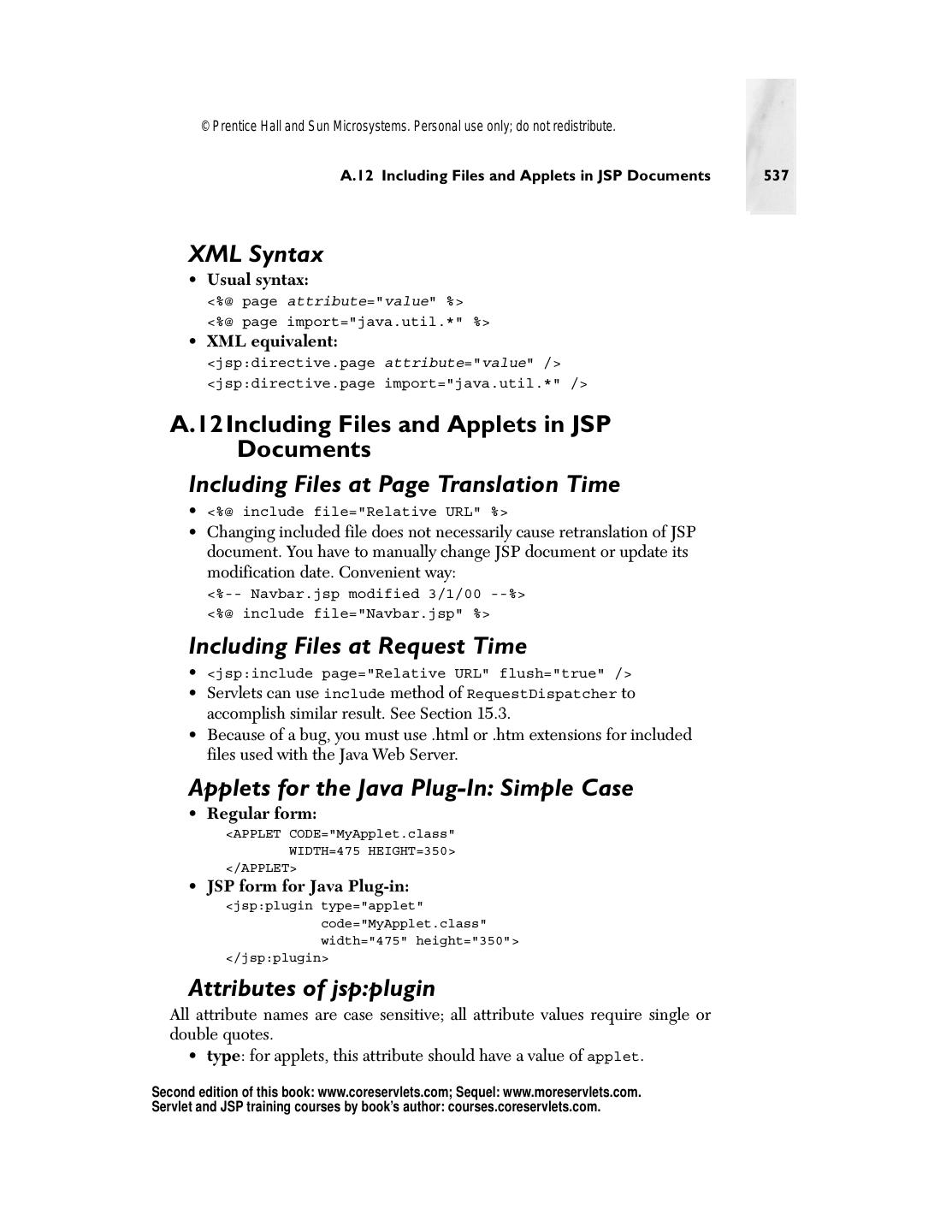 20 . © Prentice Hall and Sun Microsystems. Personal use only; do not redistribute. A.12 Including Files and Applets in JSP Documents 537 XML Syntax • Usual syntax: <%@ page attribute="value" %> <%@ page import="java.util.*" %> • XML equivalent: <jsp:directive.page attribute="value" /> <jsp:directive.page import="java.util.*" /> A.12Including Files and Applets in JSP Documents Including Files at Page Translation Time • <%@ include file="Relative URL" %> • Changing included file does not necessarily cause retranslation of JSP document. You have to manually change JSP document or update its modification date. Convenient way: <%-- Navbar.jsp modified 3/1/00 --%> <%@ include file="Navbar.jsp" %> Including Files at Request Time • <jsp:include page="Relative URL" flush="true" /> • Servlets can use include method of RequestDispatcher to accomplish similar result. See Section 15.3. • Because of a bug, you must use .html or .htm extensions for included files used with the Java Web Server. Applets for the Java Plug-In: Simple Case • Regular form: <APPLET CODE="MyApplet.class" WIDTH=475 HEIGHT=350> </APPLET> • JSP form for Java Plug-in: <jsp:plugin type="applet" code="MyApplet.class" width="475" height="350"> </jsp:plugin> Attributes of jsp:plugin All attribute names are case sensitive; all attribute values require single or double quotes. • type: for applets, this attribute should have a value of applet. Second edition of this book: www.coreservlets.com; Sequel: www.moreservlets.com. Servlet and JSP training courses by book’s author: courses.coreservlets.com.