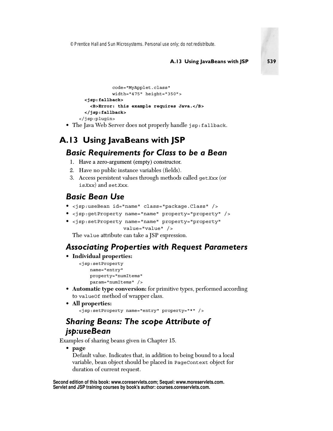 22 . © Prentice Hall and Sun Microsystems. Personal use only; do not redistribute. A.13 Using JavaBeans with JSP 539 code="MyApplet.class" width="475" height="350"> <jsp:fallback> <B>Error: this example requires Java.</B> </jsp:fallback> </jsp:plugin> • The Java Web Server does not properly handle jsp:fallback. A.13 Using JavaBeans with JSP Basic Requirements for Class to be a Bean 1. Have a zero-argument (empty) constructor. 2. Have no public instance variables (fields). 3. Access persistent values through methods called getXxx (or isXxx) and setXxx. Basic Bean Use • <jsp:useBean id="name" class="package.Class" /> • <jsp:getProperty name="name" property="property" /> • <jsp:setProperty name="name" property="property" value="value" /> The value attribute can take a JSP expression. Associating Properties with Request Parameters • Individual properties: <jsp:setProperty name="entry" property="numItems" param="numItems" /> • Automatic type conversion: for primitive types, performed according to valueOf method of wrapper class. • All properties: <jsp:setProperty name="entry" property="*" /> Sharing Beans: The scope Attribute of jsp:useBean Examples of sharing beans given in Chapter 15. • page Default value. Indicates that, in addition to being bound to a local variable, bean object should be placed in PageContext object for duration of current request. Second edition of this book: www.coreservlets.com; Sequel: www.moreservlets.com. Servlet and JSP training courses by book’s author: courses.coreservlets.com.