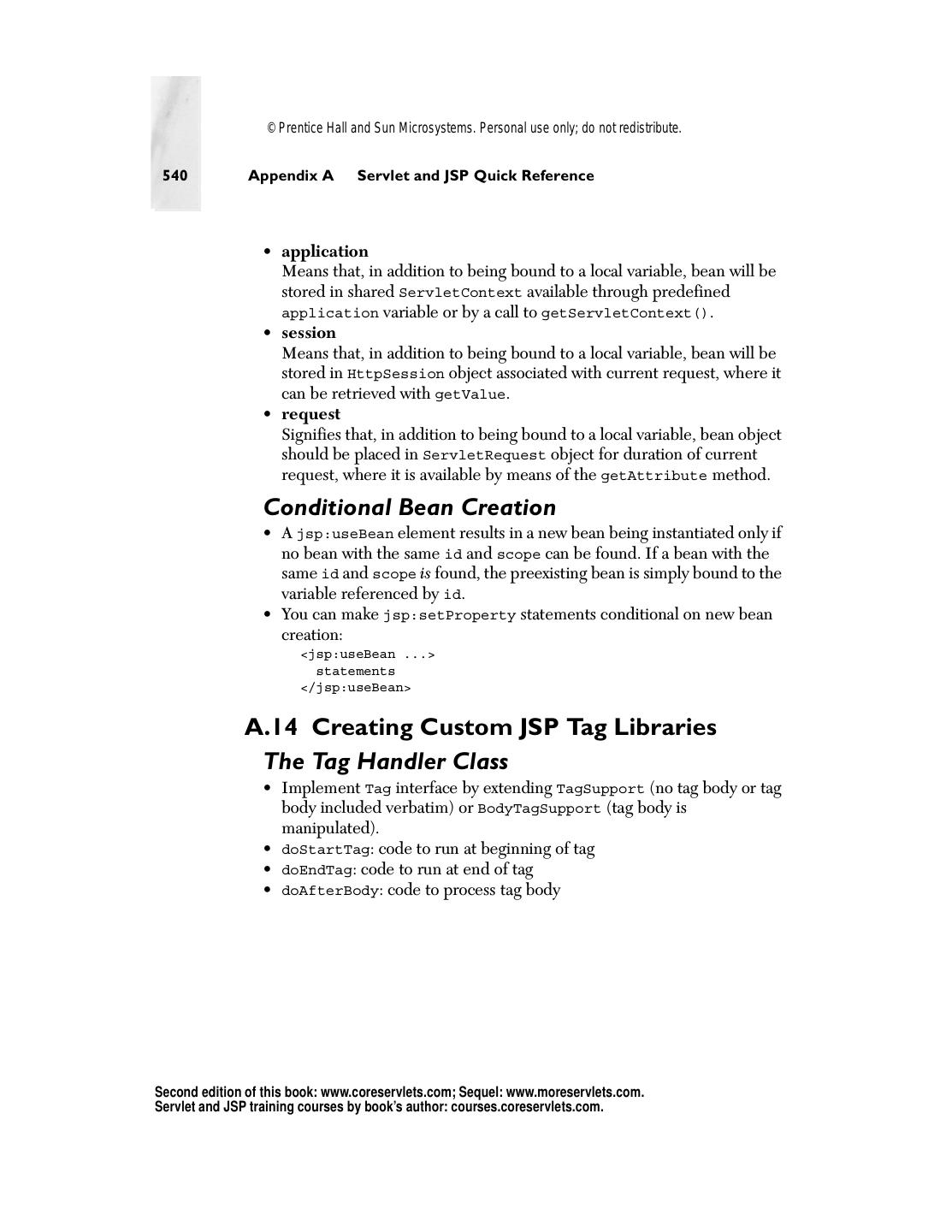 23 . © Prentice Hall and Sun Microsystems. Personal use only; do not redistribute. 540 Appendix A Servlet and JSP Quick Reference • application Means that, in addition to being bound to a local variable, bean will be stored in shared ServletContext available through predefined application variable or by a call to getServletContext(). • session Means that, in addition to being bound to a local variable, bean will be stored in HttpSession object associated with current request, where it can be retrieved with getValue. • request Signifies that, in addition to being bound to a local variable, bean object should be placed in ServletRequest object for duration of current request, where it is available by means of the getAttribute method. Conditional Bean Creation • A jsp:useBean element results in a new bean being instantiated only if no bean with the same id and scope can be found. If a bean with the same id and scope is found, the preexisting bean is simply bound to the variable referenced by id. • You can make jsp:setProperty statements conditional on new bean creation: <jsp:useBean ...> statements </jsp:useBean> A.14 Creating Custom JSP Tag Libraries The Tag Handler Class • Implement Tag interface by extending TagSupport (no tag body or tag body included verbatim) or BodyTagSupport (tag body is manipulated). • doStartTag: code to run at beginning of tag • doEndTag: code to run at end of tag • doAfterBody: code to process tag body Second edition of this book: www.coreservlets.com; Sequel: www.moreservlets.com. Servlet and JSP training courses by book’s author: courses.coreservlets.com.