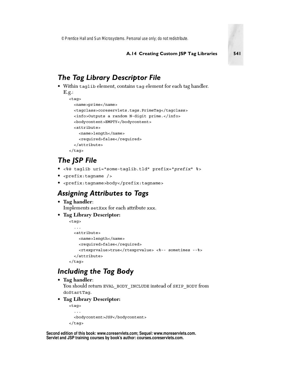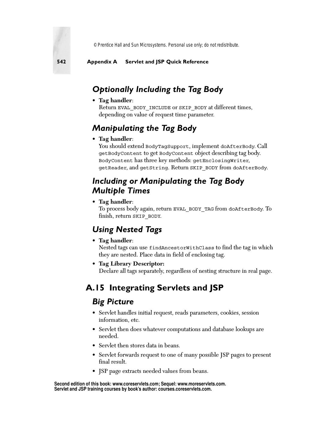 25 . © Prentice Hall and Sun Microsystems. Personal use only; do not redistribute. 542 Appendix A Servlet and JSP Quick Reference Optionally Including the Tag Body • Tag handler: Return EVAL_BODY_INCLUDE or SKIP_BODY at different times, depending on value of request time parameter. Manipulating the Tag Body • Tag handler: You should extend BodyTagSupport, implement doAfterBody. Call getBodyContent to get BodyContent object describing tag body. BodyContent has three key methods: getEnclosingWriter, getReader, and getString. Return SKIP_BODY from doAfterBody. Including or Manipulating the Tag Body Multiple Times • Tag handler: To process body again, return EVAL_BODY_TAG from doAfterBody. To finish, return SKIP_BODY. Using Nested Tags • Tag handler: Nested tags can use findAncestorWithClass to find the tag in which they are nested. Place data in field of enclosing tag. • Tag Library Descriptor: Declare all tags separately, regardless of nesting structure in real page. A.15 Integrating Servlets and JSP Big Picture • Servlet handles initial request, reads parameters, cookies, session information, etc. • Servlet then does whatever computations and database lookups are needed. • Servlet then stores data in beans. • Servlet forwards request to one of many possible JSP pages to present final result. • JSP page extracts needed values from beans. Second edition of this book: www.coreservlets.com; Sequel: www.moreservlets.com. Servlet and JSP training courses by book’s author: courses.coreservlets.com.