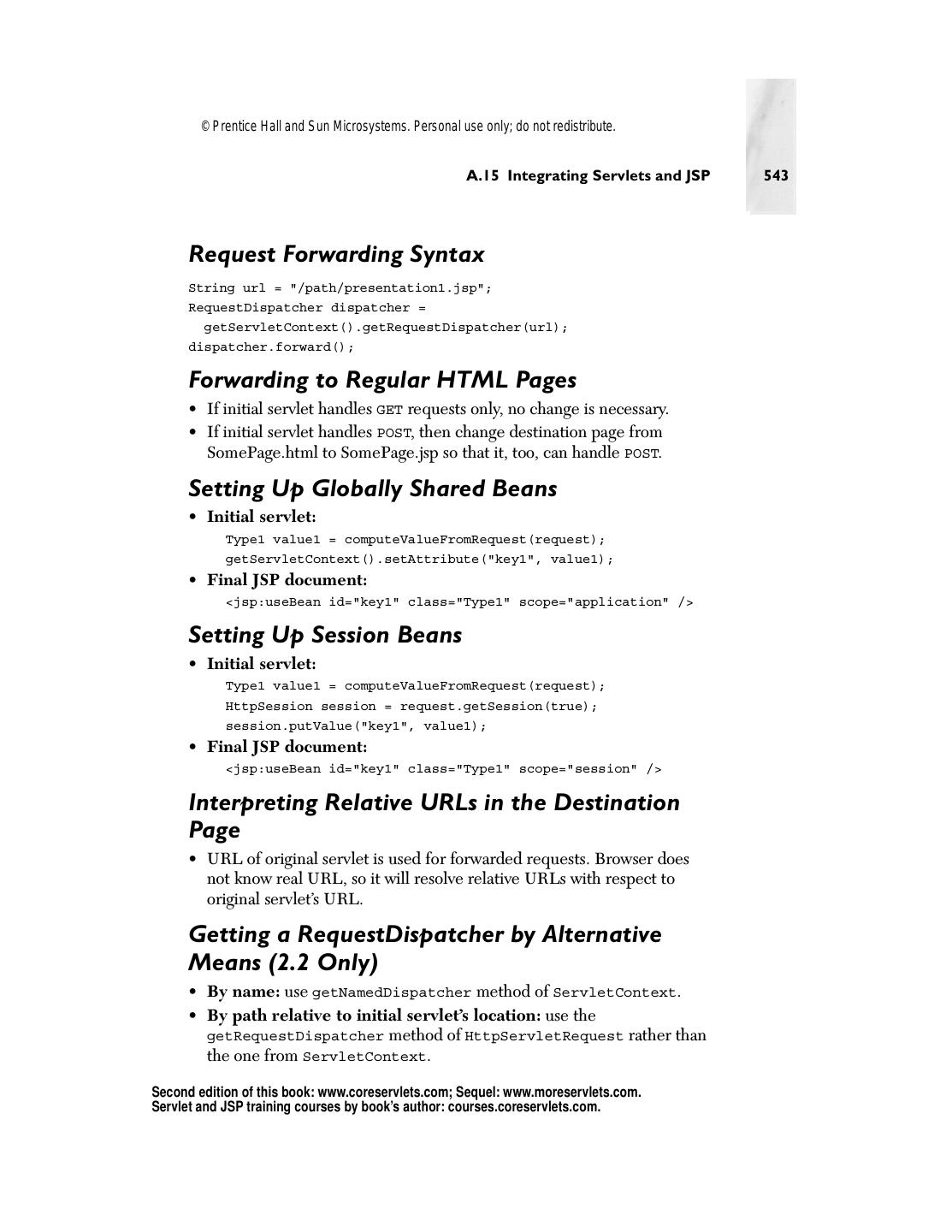26 . © Prentice Hall and Sun Microsystems. Personal use only; do not redistribute. A.15 Integrating Servlets and JSP 543 Request Forwarding Syntax String url = "/path/presentation1.jsp"; RequestDispatcher dispatcher = getServletContext().getRequestDispatcher(url); dispatcher.forward(); Forwarding to Regular HTML Pages • If initial servlet handles GET requests only, no change is necessary. • If initial servlet handles POST, then change destination page from SomePage.html to SomePage.jsp so that it, too, can handle POST. Setting Up Globally Shared Beans • Initial servlet: Type1 value1 = computeValueFromRequest(request); getServletContext().setAttribute("key1", value1); • Final JSP document: <jsp:useBean id="key1" class="Type1" scope="application" /> Setting Up Session Beans • Initial servlet: Type1 value1 = computeValueFromRequest(request); HttpSession session = request.getSession(true); session.putValue("key1", value1); • Final JSP document: <jsp:useBean id="key1" class="Type1" scope="session" /> Interpreting Relative URLs in the Destination Page • URL of original servlet is used for forwarded requests. Browser does not know real URL, so it will resolve relative URLs with respect to original servlet’s URL. Getting a RequestDispatcher by Alternative Means (2.2 Only) • By name: use getNamedDispatcher method of ServletContext. • By path relative to initial servlet’s location: use the getRequestDispatcher method of HttpServletRequest rather than the one from ServletContext. Second edition of this book: www.coreservlets.com; Sequel: www.moreservlets.com. Servlet and JSP training courses by book’s author: courses.coreservlets.com.