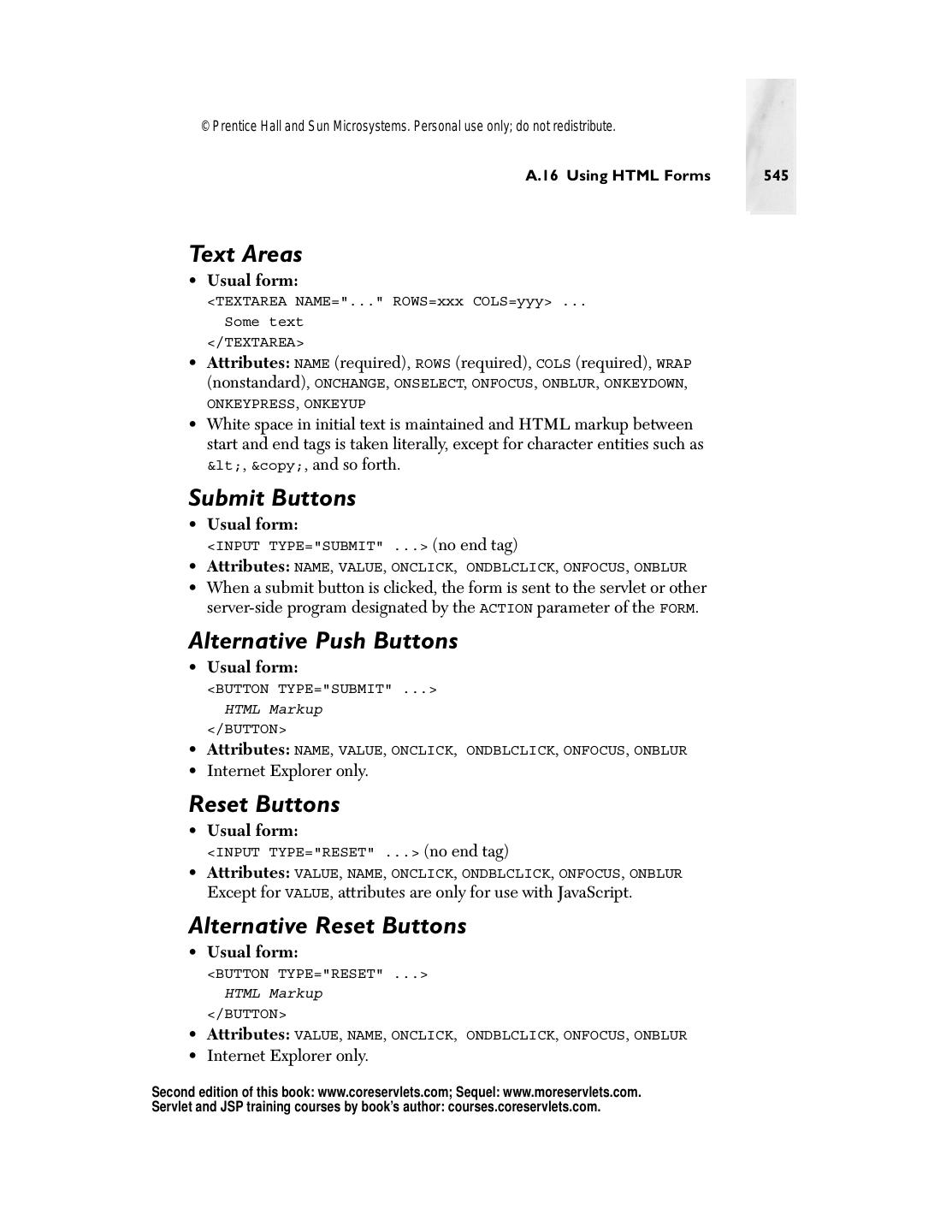 28 . © Prentice Hall and Sun Microsystems. Personal use only; do not redistribute. A.16 Using HTML Forms 545 Text Areas • Usual form: <TEXTAREA NAME="..." ROWS=xxx COLS=yyy> ... Some text </TEXTAREA> • Attributes: NAME (required), ROWS (required), COLS (required), WRAP (nonstandard), ONCHANGE, ONSELECT, ONFOCUS, ONBLUR, ONKEYDOWN, ONKEYPRESS, ONKEYUP • White space in initial text is maintained and HTML markup between start and end tags is taken literally, except for character entities such as <, ©, and so forth. Submit Buttons • Usual form: <INPUT TYPE="SUBMIT" ...> (no end tag) • Attributes: NAME, VALUE, ONCLICK, ONDBLCLICK, ONFOCUS, ONBLUR • When a submit button is clicked, the form is sent to the servlet or other server-side program designated by the ACTION parameter of the FORM. Alternative Push Buttons • Usual form: <BUTTON TYPE="SUBMIT" ...> HTML Markup </BUTTON> • Attributes: NAME, VALUE, ONCLICK, ONDBLCLICK, ONFOCUS, ONBLUR • Internet Explorer only. Reset Buttons • Usual form: <INPUT TYPE="RESET" ...> (no end tag) • Attributes: VALUE, NAME, ONCLICK, ONDBLCLICK, ONFOCUS, ONBLUR Except for VALUE, attributes are only for use with JavaScript. Alternative Reset Buttons • Usual form: <BUTTON TYPE="RESET" ...> HTML Markup </BUTTON> • Attributes: VALUE, NAME, ONCLICK, ONDBLCLICK, ONFOCUS, ONBLUR • Internet Explorer only. Second edition of this book: www.coreservlets.com; Sequel: www.moreservlets.com. Servlet and JSP training courses by book’s author: courses.coreservlets.com.