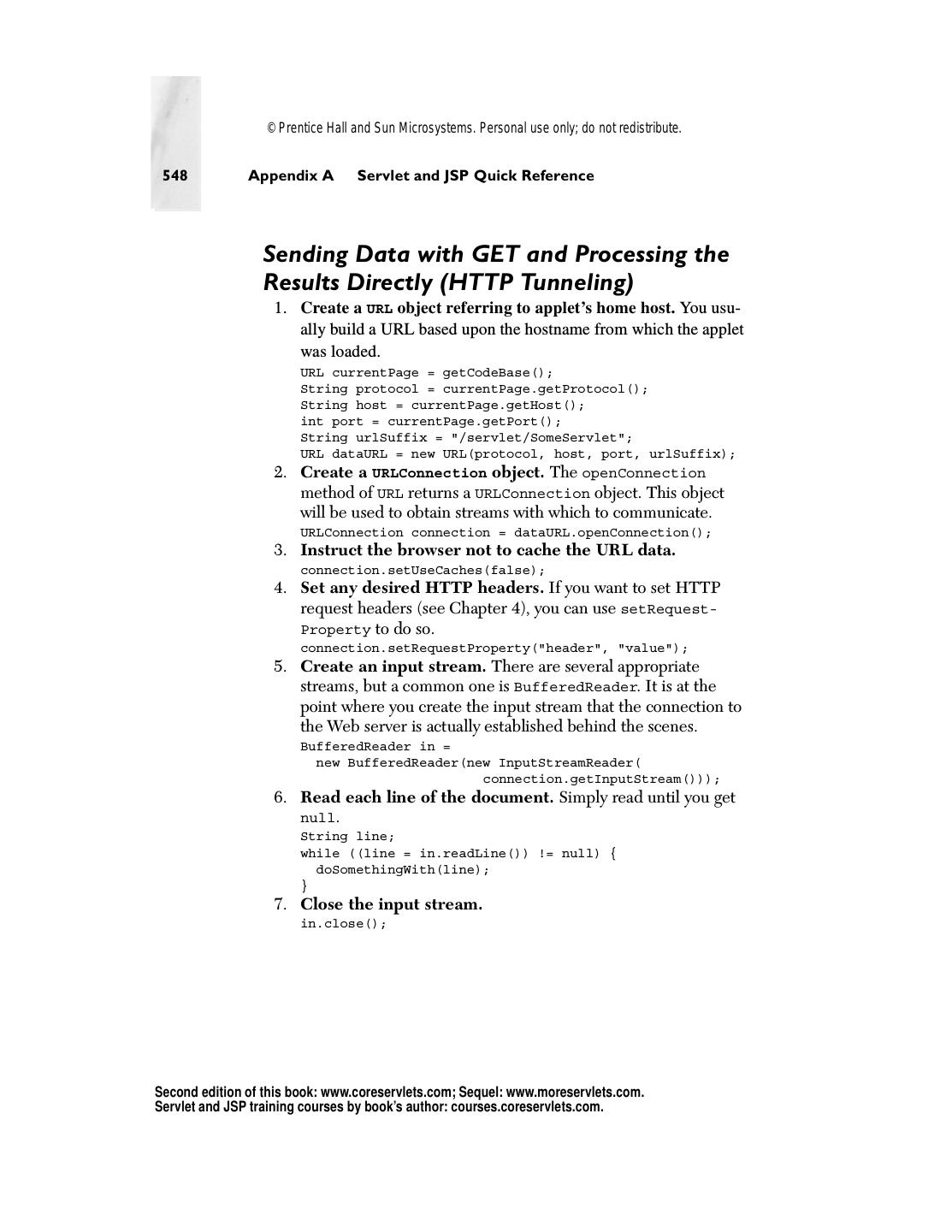 5 . © Prentice Hall and Sun Microsystems. Personal use only; do not redistribute. 522 Appendix A Servlet and JSP Quick Reference Servlet Life Cycle • public void init() throws ServletException, public void init(ServletConfig config) throws ServletException Executed once when the servlet is first loaded. Not called for each request. Use getInitParameter to read initialization parameters. • public void service(HttpServletRequest request, public void service(HttpServletResponse response) throws ServletException, IOException Called in a new thread by server for each request. Dispatches to doGet, doPost, etc. Do not override this method! • public void doGet(HttpServletRequest request, public void doGet(HttpServletResponse response) throws ServletException, IOException Handles GET requests. Override to provide your behavior. • public void doPost(HttpServletRequest request, public void doPost(HttpServletResponse response) throws ServletException, IOException Handles POST requests. Override to provide your behavior. If you want GET and POST to act identically, call doGet here. • doPut, doTrace, doDelete, etc. Handles the uncommon HTTP requests of PUT, TRACE, etc. • public void destroy() Called when server deletes servlet instance. Not called after each request. • public long getLastModified(HttpServletRequest request) Called by server when client sends conditional GET due to cached copy. See Section 2.8. • SingleThreadModel If this interface implemented, causes server to avoid concurrent invocations. Second edition of this book: www.coreservlets.com; Sequel: www.moreservlets.com. Servlet and JSP training courses by book’s author: courses.coreservlets.com.
