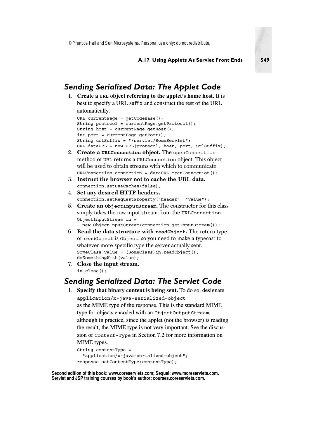 16 . © Prentice Hall and Sun Microsystems. Personal use only; do not redistribute. A.10 JSP Scripting Elements 533 Encoding URLs In case servlet is using URL rewriting to implement session tracking, you should give the system a chance to encode the URLs. • Regular URLs String originalURL = someRelativeOrAbsoluteURL; String encodedURL = response.encodeURL(originalURL); out.println("<A HREF=\"" + encodedURL + "\">...</A>"); • Redirect URLs String originalURL = someURL; // Relative URL OK in 2.2 String encodedURL = response.encodeRedirectURL(originalURL); response.sendRedirect(encodedURL); A.10 JSP Scripting Elements Types of Scripting Elements • Expressions: <%= expression %> Evaluated and inserted into servlet’s output. You can also use <jsp:expression> expression </jsp:expression> • Scriptlets: <% code %> Inserted into servlet's _jspService method (called by service). You can also use <jsp:scriptlet> code </jsp:scriptlet> • Declarations: <%! code %> Inserted into body of servlet class, outside of any existing methods. You can also use <jsp:declaration> code </jsp:declaration> Template Text • Use <\% to get <% in output. • <%-- JSP Comment --%> • <!-- HTML Comment --> • All other non-JSP-specific text passed through to output page. Predefined Variables Implicit objects automatically available in expressions and scriptlets (not dec- larations). • request: the HttpServletRequest associated with request. Second edition of this book: www.coreservlets.com; Sequel: www.moreservlets.com. Servlet and JSP training courses by book’s author: courses.coreservlets.com.