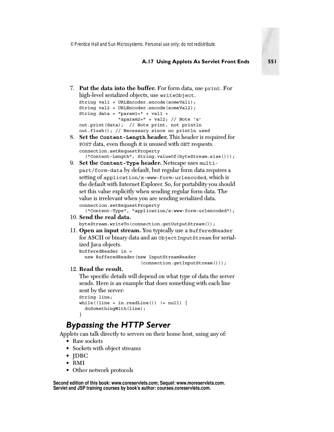 11 . © Prentice Hall and Sun Microsystems. Personal use only; do not redistribute. 528 Appendix A Servlet and JSP Quick Reference • 401 (Unauthorized): Browser tried to access password-protected page without proper Authorization header. See example in Section 4.5. • 404 (Not Found): No such page. Servlets should use sendError to set this header. See example in Section 6.3. A.7 Generating the Server Response: HTTP Response Headers Setting Arbitrary Headers These are methods in HttpServletResponse. Set response headers before you send any document content to browser. • public void setHeader(String headerName, String headerValue) Sets an arbitrary header. • public void setDateHeader(String headerName, long milliseconds) Converts milliseconds since 1970 to a date string in GMT format. • public void setIntHeader(String headerName, int headerValue) Prevents need to convert int to String before calling setHeader. • addHeader, addDateHeader, addIntHeader Adds new occurrence of header instead of replacing. 2.2 only. Setting Common Headers • setContentType: Sets the Content-Type header. Servlets almost always use this. See Table 7.1 for the most common MIME types. • setContentLength: Sets the Content-Length header. Used for persistent HTTP connections. Use ByteArrayOutputStream to buffer document before sending it, to determine size. See Section 7.4 for an example. • addCookie: Adds a value to the Set-Cookie header. See Chapter 8. • sendRedirect: Sets the Location header (plus changes status code). See example in Section 6.3. Common HTTP 1.1 Response Headers • Allow: the request methods server supports. Automatically set by the default service method when servlet receives OPTIONS requests. • Cache-Control: A no-cache value prevents browsers from caching results. Send Pragma header with same value in case browser only understands HTTP 1.0. • Content-Encoding: the way document is encoded. Browser reverses this encoding before handling document. Servlets must confirm that Second edition of this book: www.coreservlets.com; Sequel: www.moreservlets.com. Servlet and JSP training courses by book’s author: courses.coreservlets.com.