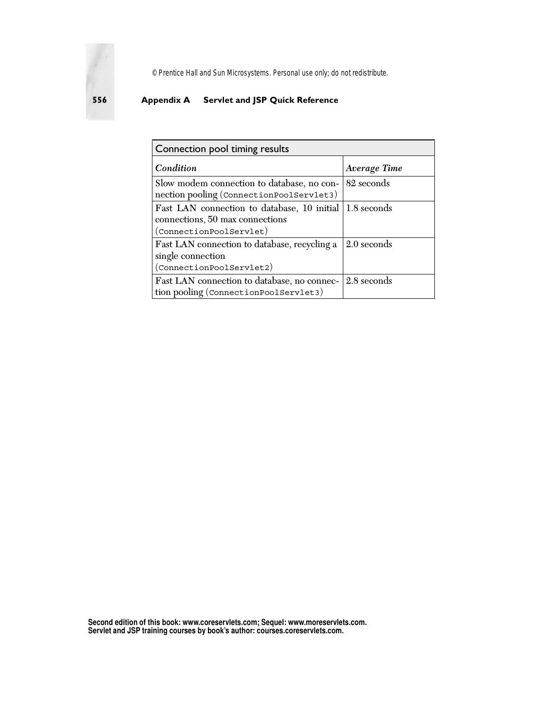 3 . © Prentice Hall and Sun Microsystems. Personal use only; do not redistribute. 520 Appendix A Servlet and JSP Quick Reference • JSWDK: http://java.sun.com/products/servlet/download.html • JRun: http://www.allaire.com/products/jrun/ • ServletExec: http://newatlanta.com/ • LiteWebServer: http://www.gefionsoftware.com/ • Java Web Server: http://www.sun.com/software/jwebserver/try/ Documentation • http://java.sun.com/products/jsp/download.html • http://java.sun.com/products/servlet/2.2/javadoc/ • http://www.java.sun.com/j2ee/j2sdkee/techdocs/api/ Servlet Compilation: CLASSPATH Entries Note: if you use Tomcat 3.2 or 4.x, see updated information at • The servlet classes (usually in install_dir/lib/servlet.jar) • The JSP classes (usually in install_dir/lib/jsp.jar, ...jspengine.jar, or ...jasper.jar) http://archive.coreservlets.com/Using-Tomcat.html • The top-level directory of servlet installation directory (e.g., install_dir/webpages/WEB-INF/classes) Tomcat 3.0 Standard Directories • install_dir/webpages/WEB-INF/classes Standard location for servlet classes. • install_dir/classes Alternate location for servlet classes. • install_dir/lib Location for JAR files containing classes. Tomcat 3.1 Standard Directories • install_dir/webapps/ROOT/WEB-INF/classes Standard location for servlet classes. • install_dir/classes Alternate location for servlet classes. • install_dir/lib Location for JAR files containing classes. JSWDK 1.0.1 Standard Directories • install_dir/webpages/WEB-INF/servlets Standard location for servlet classes. • install_dir/classes Alternate location for servlet classes. • install_dir/lib Location for JAR files containing classes. Second edition of this book: www.coreservlets.com; Sequel: www.moreservlets.com. Servlet and JSP training courses by book’s author: courses.coreservlets.com.