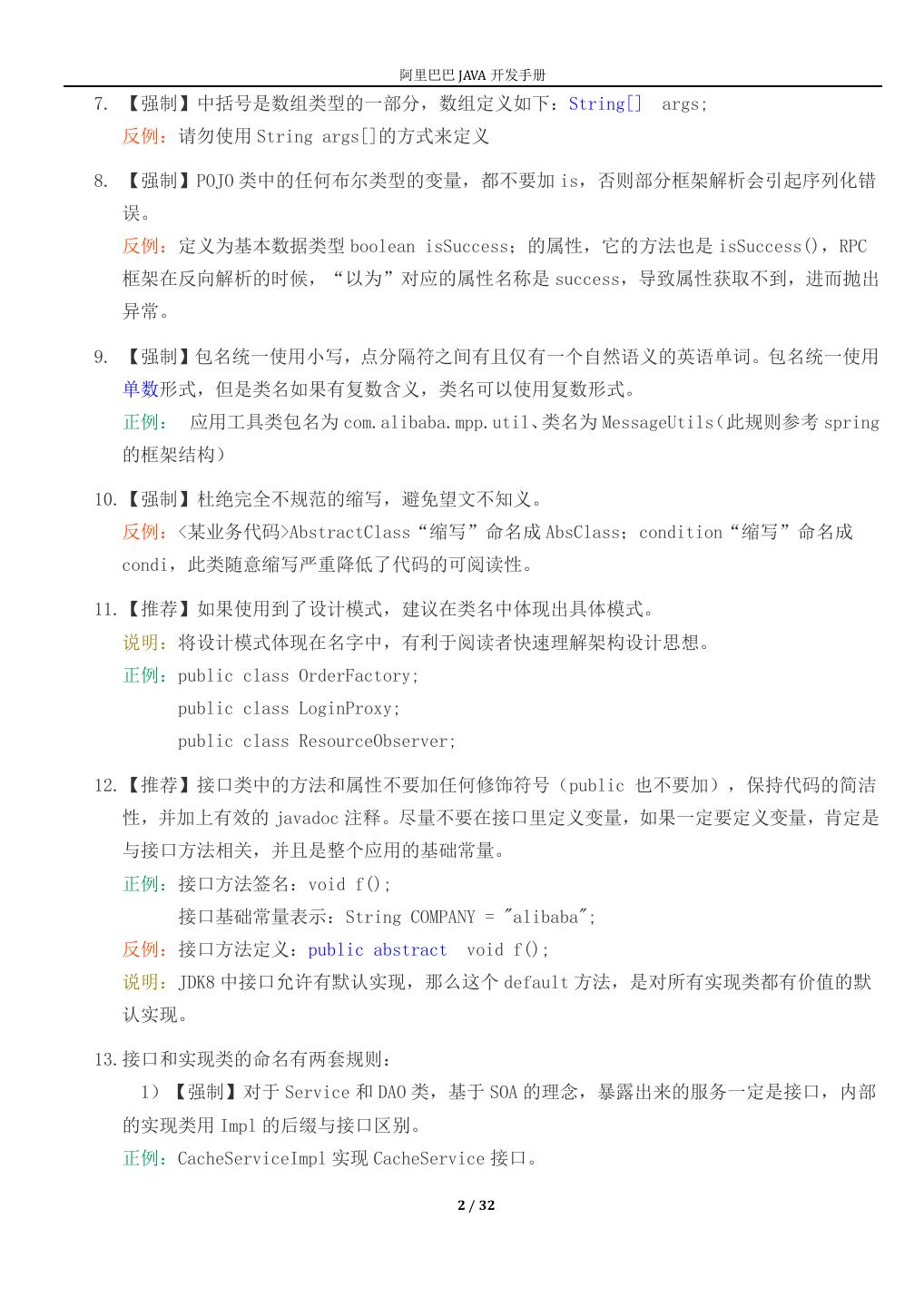 2 . 阿里巴巴 JAVA 开发手册 7. 【强制】中括号是数组类型的一部分,数组定义如下:String[] args; 反例:请勿使用 String args[]的方式来定义 8. 【强制】POJO 类中的任何布尔类型的变量,都不要加 is,否则部分框架解析会引起序列化错 误。 反例:定义为基本数据类型 boolean isSuccess;的属性,它的方法也是 isSuccess(),RPC 框架在反向解析的时候,“以为”对应的属性名称是 success,导致属性获取不到,进而抛出 异常。 9. 【强制】包名统一使用小写,点分隔符之间有且仅有一个自然语义的英语单词。包名统一使用 单数形式,但是类名如果有复数含义,类名可以使用复数形式。 正例: 应用工具类包名为 com.alibaba.mpp.util、类名为 MessageUtils(此规则参考 spring 的框架结构) 10.【强制】杜绝完全不规范的缩写,避免望文不知义。 反例:<某业务代码>AbstractClass“缩写”命名成 AbsClass;condition“缩写”命名成 condi,此类随意缩写严重降低了代码的可阅读性。 11.【推荐】如果使用到了设计模式,建议在类名中体现出具体模式。 说明:将设计模式体现在名字中,有利于阅读者快速理解架构设计思想。 正例:public class OrderFactory; public class LoginProxy; public class ResourceObserver; 12.【推荐】接口类中的方法和属性不要加任何修饰符号(public 也不要加),保持代码的简洁 性,并加上有效的 javadoc 注释。尽量不要在接口里定义变量,如果一定要定义变量,肯定是 与接口方法相关,并且是整个应用的基础常量。 正例:接口方法签名:void f(); 接口基础常量表示:String COMPANY = "alibaba"; 反例:接口方法定义:public abstract void f(); 说明:JDK8 中接口允许有默认实现,那么这个 default 方法,是对所有实现类都有价值的默 认实现。 13.接口和实现类的命名有两套规则: 1)【强制】对于 Service 和 DAO 类,基于 SOA 的理念,暴露出来的服务一定是接口,内部 的实现类用 Impl 的后缀与接口区别。 正例:CacheServiceImpl 实现 CacheService 接口。 2 / 32
