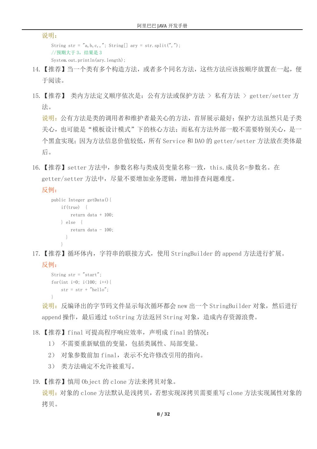8 . 阿里巴巴 JAVA 开发手册 说明: String str = "a,b,c,,"; String[] ary = str.split(","); //预期大于 3,结果是 3 System.out.println(ary.length); 14.【推荐】当一个类有多个构造方法,或者多个同名方法,这些方法应该按顺序放置在一起,便 于阅读。 15.【推荐】 类内方法定义顺序依次是:公有方法或保护方法 > 私有方法 > getter/setter 方 法。 说明:公有方法是类的调用者和维护者最关心的方法,首屏展示最好;保护方法虽然只是子类 关心,也可能是“模板设计模式”下的核心方法;而私有方法外部一般不需要特别关心,是一 个黑盒实现;因为方法信息价值较低,所有 Service 和 DAO 的 getter/setter 方法放在类体最 后。 16.【推荐】setter 方法中,参数名称与类成员变量名称一致,this.成员名=参数名。在 getter/setter 方法中,尽量不要增加业务逻辑,增加排查问题难度。 反例: public Integer getData(){ if(true) { return data + 100; } else { return data - 100; } } 17.【推荐】循环体内,字符串的联接方式,使用 StringBuilder 的 append 方法进行扩展。 反例: String str = "start"; for(int i=0; i<100; i++){ str = str + "hello"; } 说明:反编译出的字节码文件显示每次循环都会 new 出一个 StringBuilder 对象,然后进行 append 操作,最后通过 toString 方法返回 String 对象,造成内存资源浪费。 18.【推荐】final 可提高程序响应效率,声明成 final 的情况: 1) 不需要重新赋值的变量,包括类属性、局部变量。 2) 对象参数前加 final,表示不允许修改引用的指向。 3) 类方法确定不允许被重写。 19.【推荐】慎用 Object 的 clone 方法来拷贝对象。 说明:对象的 clone 方法默认是浅拷贝,若想实现深拷贝需要重写 clone 方法实现属性对象的 拷贝。 8 / 32