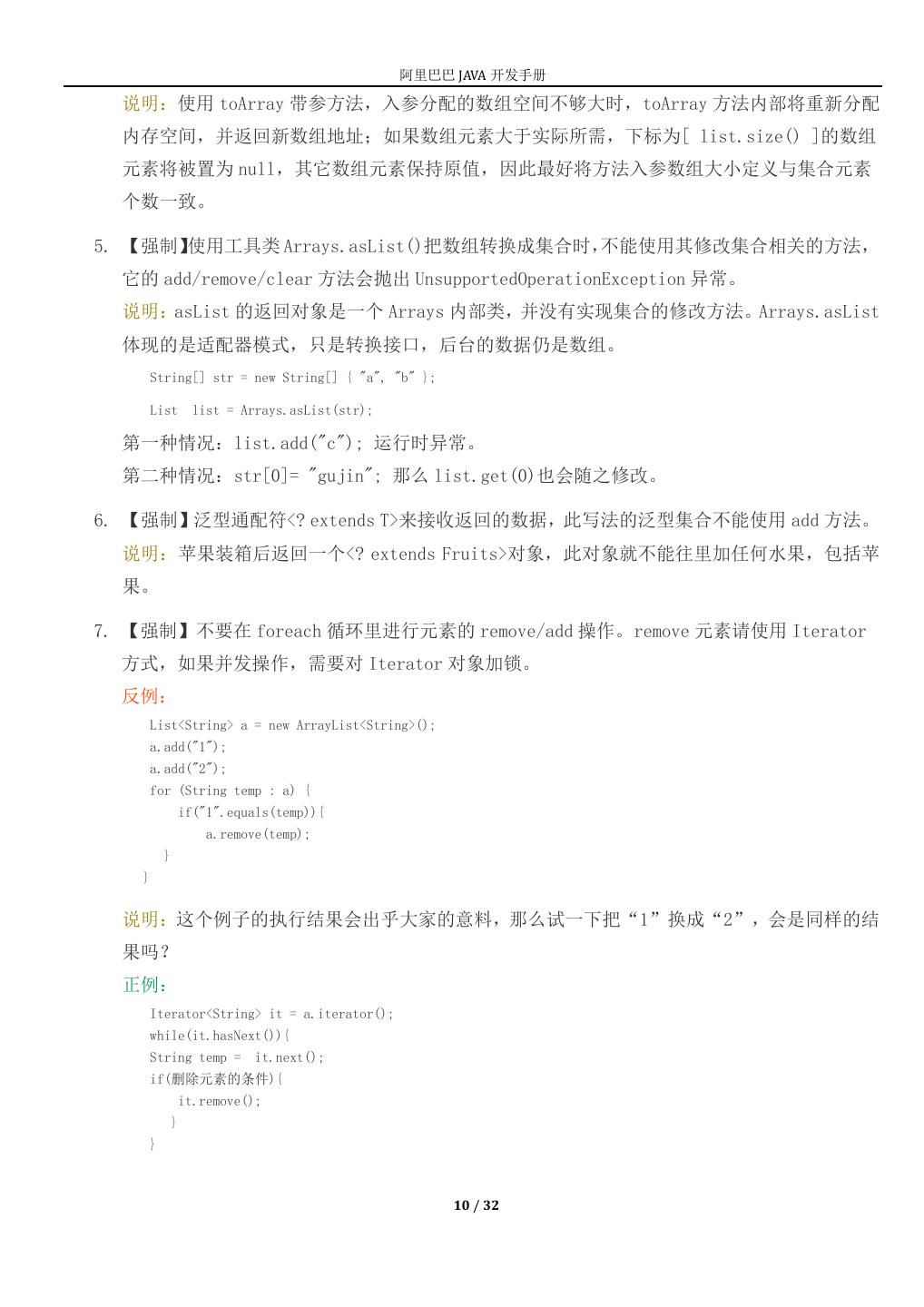 10 . 阿里巴巴 JAVA 开发手册 说明:使用 toArray 带参方法,入参分配的数组空间不够大时,toArray 方法内部将重新分配 内存空间,并返回新数组地址;如果数组元素大于实际所需,下标为[ list.size() ]的数组 元素将被置为 null,其它数组元素保持原值,因此最好将方法入参数组大小定义与集合元素 个数一致。 5. 【强制】使用工具类 Arrays.asList()把数组转换成集合时,不能使用其修改集合相关的方法, 它的 add/remove/clear 方法会抛出 UnsupportedOperationException 异常。 说明:asList 的返回对象是一个 Arrays 内部类,并没有实现集合的修改方法。Arrays.asList 体现的是适配器模式,只是转换接口,后台的数据仍是数组。 String[] str = new String[] { "a", "b" }; List list = Arrays.asList(str); 第一种情况:list.add("c"); 运行时异常。 第二种情况:str[0]= "gujin"; 那么 list.get(0)也会随之修改。 6. 【强制】泛型通配符<? extends T>来接收返回的数据,此写法的泛型集合不能使用 add 方法。 说明:苹果装箱后返回一个<? extends Fruits>对象,此对象就不能往里加任何水果,包括苹 果。 7. 【强制】不要在 foreach 循环里进行元素的 remove/add 操作。remove 元素请使用 Iterator 方式,如果并发操作,需要对 Iterator 对象加锁。 反例: List<String> a = new ArrayList<String>(); a.add("1"); a.add("2"); for (String temp : a) { if("1".equals(temp)){ a.remove(temp); } } 说明:这个例子的执行结果会出乎大家的意料,那么试一下把“1”换成“2”,会是同样的结 果吗? 正例: Iterator<String> it = a.iterator(); while(it.hasNext()){ String temp = it.next(); if(删除元素的条件){ it.remove(); } } 10 / 32