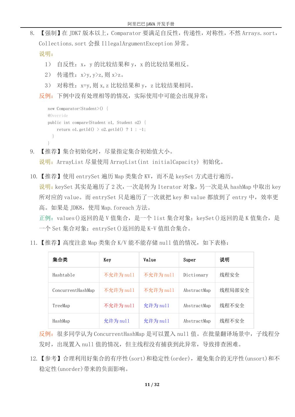 11 . 阿里巴巴 JAVA 开发手册 8. 【强制】在 JDK7 版本以上,Comparator 要满足自反性,传递性,对称性,不然 Arrays.sort, Collections.sort 会报 IllegalArgumentException 异常。 说明: 1) 自反性:x,y 的比较结果和 y,x 的比较结果相反。 2) 传递性:x>y,y>z,则 x>z。 3) 对称性:x=y,则 x,z 比较结果和 y,z 比较结果相同。 反例:下例中没有处理相等的情况,实际使用中可能会出现异常: new Comparator<Student>() { @Override public int compare(Student o1, Student o2) { return o1.getId() > o2.getId() ? 1 : -1; } } 9. 【推荐】集合初始化时,尽量指定集合初始值大小。 说明:ArrayList 尽量使用 ArrayList(int initialCapacity) 初始化。 10.【推荐】使用 entrySet 遍历 Map 类集合 KV,而不是 keySet 方式进行遍历。 说明:keySet 其实是遍历了 2 次,一次是转为 Iterator 对象,另一次是从 hashMap 中取出 key 所对应的 value。而 entrySet 只是遍历了一次就把 key 和 value 都放到了 entry 中,效率更 高。如果是 JDK8,使用 Map.foreach 方法。 正例:values()返回的是 V 值集合,是一个 list 集合对象;keySet()返回的是 K 值集合,是 一个 Set 集合对象;entrySet()返回的是 K-V 值组合集合。 11.【推荐】高度注意 Map 类集合 K/V 能不能存储 null 值的情况,如下表格: 集合类 Key Value Super 说明 Hashtable 不允许为 null 不允许为 null Dictionary 线程安全 ConcurrentHashMap 不允许为 null 不允许为 null AbstractMap 线程局部安全 TreeMap 不允许为 null 允许为 null AbstractMap 线程不安全 HashMap 允许为 null 允许为 null AbstractMap 线程不安全 反例:很多同学认为 ConcurrentHashMap 是可以置入 null 值。在批量翻译场景中,子线程分 发时,出现置入 null 值的情况,但主线程没有捕获到此异常,导致排查困难。 12.【参考】合理利用好集合的有序性(sort)和稳定性(order),避免集合的无序性(unsort)和不 稳定性(unorder)带来的负面影响。 11 / 32