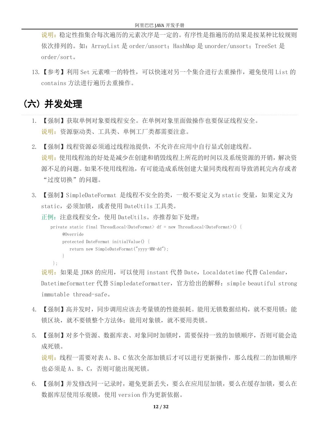 12 . 阿里巴巴 JAVA 开发手册 说明:稳定性指集合每次遍历的元素次序是一定的。有序性是指遍历的结果是按某种比较规则 依次排列的。如:ArrayList 是 order/unsort;HashMap 是 unorder/unsort;TreeSet 是 order/sort。 13.【参考】利用 Set 元素唯一的特性,可以快速对另一个集合进行去重操作,避免使用 List 的 contains 方法进行遍历去重操作。 (六) 并发处理 1. 【强制】获取单例对象要线程安全。在单例对象里面做操作也要保证线程安全。 说明:资源驱动类、工具类、单例工厂类都需要注意。 2. 【强制】线程资源必须通过线程池提供,不允许在应用中自行显式创建线程。 说明:使用线程池的好处是减少在创建和销毁线程上所花的时间以及系统资源的开销,解决资 源不足的问题。如果不使用线程池,有可能造成系统创建大量同类线程而导致消耗完内存或者 “过度切换”的问题。 3. 【强制】SimpleDateFormat 是线程不安全的类,一般不要定义为 static 变量,如果定义为 static,必须加锁,或者使用 DateUtils 工具类。 正例:注意线程安全,使用 DateUtils。亦推荐如下处理: private static final ThreadLocal<DateFormat> df = new ThreadLocal<DateFormat>() { @Override protected DateFormat initialValue() { return new SimpleDateFormat("yyyy-MM-dd"); } }; 说明:如果是 JDK8 的应用,可以使用 instant 代替 Date,Localdatetime 代替 Calendar, Datetimeformatter 代替 Simpledateformatter,官方给出的解释:simple beautiful strong immutable thread-safe。 4. 【强制】高并发时,同步调用应该去考量锁的性能损耗。能用无锁数据结构,就不要用锁;能 锁区块,就不要锁整个方法体;能用对象锁,就不要用类锁。 5. 【强制】对多个资源、数据库表、对象同时加锁时,需要保持一致的加锁顺序,否则可能会造 成死锁。 说明:线程一需要对表 A、B、C 依次全部加锁后才可以进行更新操作,那么线程二的加锁顺序 也必须是 A、B、C,否则可能出现死锁。 6. 【强制】并发修改同一记录时,避免更新丢失,要么在应用层加锁,要么在缓存加锁,要么在 数据库层使用乐观锁,使用 version 作为更新依据。 12 / 32