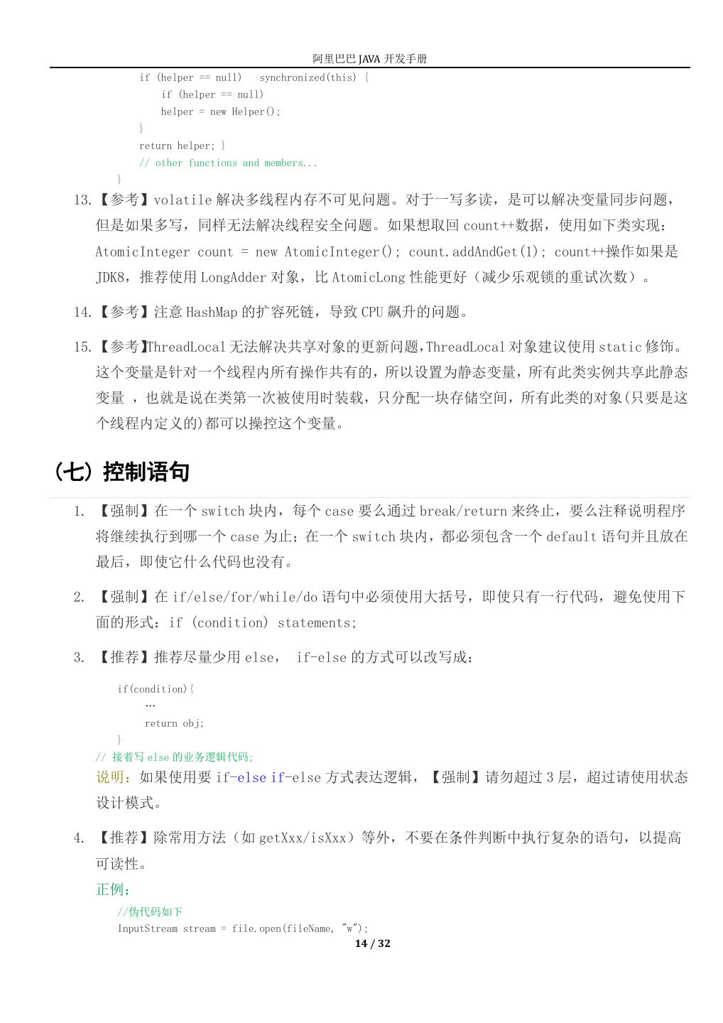 14 . 阿里巴巴 JAVA 开发手册 if (helper == null) synchronized(this) { if (helper == null) helper = new Helper(); } return helper; } // other functions and members... } 13.【参考】volatile 解决多线程内存不可见问题。对于一写多读,是可以解决变量同步问题, 但是如果多写,同样无法解决线程安全问题。如果想取回 count++数据,使用如下类实现: AtomicInteger count = new AtomicInteger(); count.addAndGet(1); count++操作如果是 JDK8,推荐使用 LongAdder 对象,比 AtomicLong 性能更好(减少乐观锁的重试次数)。 14.【参考】注意 HashMap 的扩容死链,导致 CPU 飙升的问题。 15.【参考】 ThreadLocal 无法解决共享对象的更新问题,ThreadLocal 对象建议使用 static 修饰。 这个变量是针对一个线程内所有操作共有的,所以设置为静态变量,所有此类实例共享此静态 变量 ,也就是说在类第一次被使用时装载,只分配一块存储空间,所有此类的对象(只要是这 个线程内定义的)都可以操控这个变量。 (七) 控制语句 1. 【强制】在一个 switch 块内,每个 case 要么通过 break/return 来终止,要么注释说明程序 将继续执行到哪一个 case 为止;在一个 switch 块内,都必须包含一个 default 语句并且放在 最后,即使它什么代码也没有。 2. 【强制】在 if/else/for/while/do 语句中必须使用大括号,即使只有一行代码,避免使用下 面的形式:if (condition) statements; 3. 【推荐】推荐尽量少用 else, if-else 的方式可以改写成: if(condition){ … return obj; } // 接着写 else 的业务逻辑代码; 说明:如果使用要 if-else if-else 方式表达逻辑,【强制】请勿超过 3 层,超过请使用状态 设计模式。 4. 【推荐】除常用方法(如 getXxx/isXxx)等外,不要在条件判断中执行复杂的语句,以提高 可读性。 正例: //伪代码如下 InputStream stream = file.open(fileName, "w"); 14 / 32