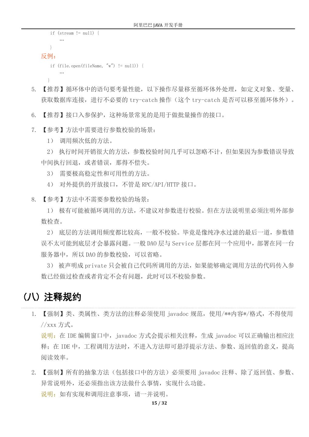 15 . 阿里巴巴 JAVA 开发手册 if (stream != null) { … } 反例: if (file.open(fileName, "w") != null)) { … } 5. 【推荐】循环体中的语句要考量性能,以下操作尽量移至循环体外处理,如定义对象、变量、 获取数据库连接,进行不必要的 try-catch 操作(这个 try-catch 是否可以移至循环体外)。 6. 【推荐】接口入参保护,这种场景常见的是用于做批量操作的接口。 7. 【参考】方法中需要进行参数校验的场景: 1) 调用频次低的方法。 2) 执行时间开销很大的方法,参数校验时间几乎可以忽略不计,但如果因为参数错误导致 中间执行回退,或者错误,那得不偿失。 3) 需要极高稳定性和可用性的方法。 4) 对外提供的开放接口,不管是 RPC/API/HTTP 接口。 8. 【参考】方法中不需要参数校验的场景: 1) 极有可能被循环调用的方法,不建议对参数进行校验。但在方法说明里必须注明外部参 数检查。 2) 底层的方法调用频度都比较高,一般不校验。毕竟是像纯净水过滤的最后一道,参数错 误不太可能到底层才会暴露问题。一般 DAO 层与 Service 层都在同一个应用中,部署在同一台 服务器中,所以 DAO 的参数校验,可以省略。 3) 被声明成 private 只会被自己代码所调用的方法,如果能够确定调用方法的代码传入参 数已经做过检查或者肯定不会有问题,此时可以不校验参数。 (八) 注释规约 1. 【强制】类、类属性、类方法的注释必须使用 javadoc 规范,使用/**内容*/格式,不得使用 //xxx 方式。 说明:在 IDE 编辑窗口中,javadoc 方式会提示相关注释,生成 javadoc 可以正确输出相应注 释;在 IDE 中,工程调用方法时,不进入方法即可悬浮提示方法、参数、返回值的意义,提高 阅读效率。 2. 【强制】所有的抽象方法(包括接口中的方法)必须要用 javadoc 注释、除了返回值、参数、 异常说明外,还必须指出该方法做什么事情,实现什么功能。 说明:如有实现和调用注意事项,请一并说明。 15 / 32