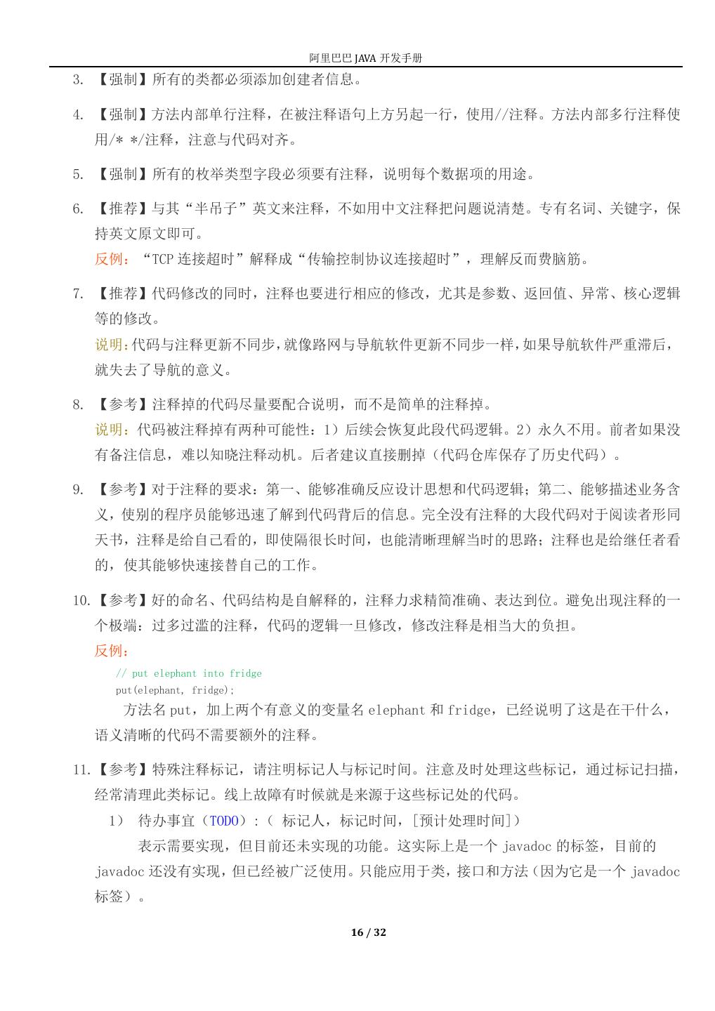 16 . 阿里巴巴 JAVA 开发手册 3. 【强制】所有的类都必须添加创建者信息。 4. 【强制】方法内部单行注释,在被注释语句上方另起一行,使用//注释。方法内部多行注释使 用/* */注释,注意与代码对齐。 5. 【强制】所有的枚举类型字段必须要有注释,说明每个数据项的用途。 6. 【推荐】与其“半吊子”英文来注释,不如用中文注释把问题说清楚。专有名词、关键字,保 持英文原文即可。 反例:“TCP 连接超时”解释成“传输控制协议连接超时”,理解反而费脑筋。 7. 【推荐】代码修改的同时,注释也要进行相应的修改,尤其是参数、返回值、异常、核心逻辑 等的修改。 说明:代码与注释更新不同步,就像路网与导航软件更新不同步一样,如果导航软件严重滞后, 就失去了导航的意义。 8. 【参考】注释掉的代码尽量要配合说明,而不是简单的注释掉。 说明:代码被注释掉有两种可能性:1)后续会恢复此段代码逻辑。2)永久不用。前者如果没 有备注信息,难以知晓注释动机。后者建议直接删掉(代码仓库保存了历史代码)。 9. 【参考】对于注释的要求:第一、能够准确反应设计思想和代码逻辑;第二、能够描述业务含 义,使别的程序员能够迅速了解到代码背后的信息。完全没有注释的大段代码对于阅读者形同 天书,注释是给自己看的,即使隔很长时间,也能清晰理解当时的思路;注释也是给继任者看 的,使其能够快速接替自己的工作。 10.【参考】好的命名、代码结构是自解释的,注释力求精简准确、表达到位。避免出现注释的一 个极端:过多过滥的注释,代码的逻辑一旦修改,修改注释是相当大的负担。 反例: // put elephant into fridge put(elephant, fridge); 方法名 put,加上两个有意义的变量名 elephant 和 fridge,已经说明了这是在干什么, 语义清晰的代码不需要额外的注释。 11.【参考】特殊注释标记,请注明标记人与标记时间。注意及时处理这些标记,通过标记扫描, 经常清理此类标记。线上故障有时候就是来源于这些标记处的代码。 1) 待办事宜(TODO):( 标记人,标记时间,[预计处理时间]) 表示需要实现,但目前还未实现的功能。这实际上是一个 javadoc 的标签,目前的 javadoc 还没有实现,但已经被广泛使用。只能应用于类,接口和方法(因为它是一个 javadoc 标签)。 16 / 32