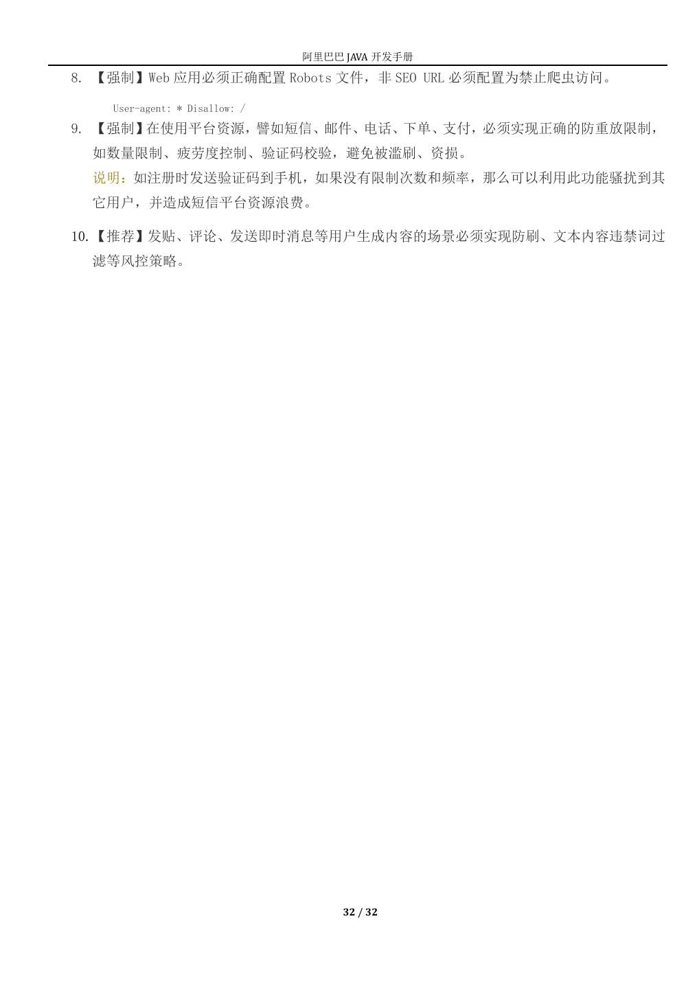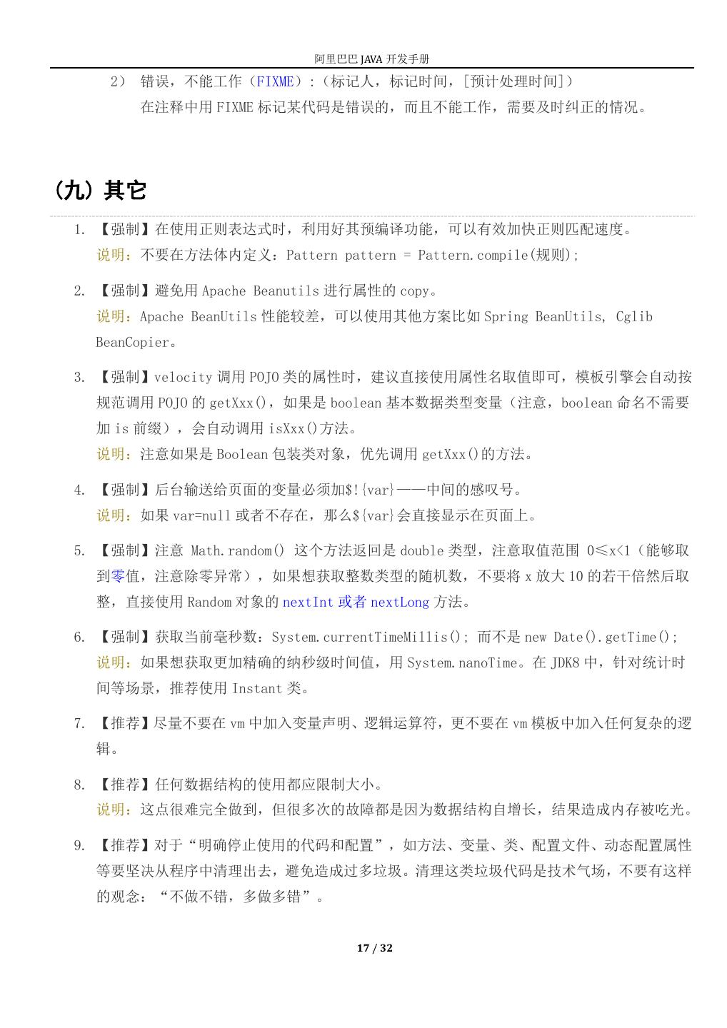 17 . 阿里巴巴 JAVA 开发手册 2) 错误,不能工作(FIXME):(标记人,标记时间,[预计处理时间]) 在注释中用 FIXME 标记某代码是错误的,而且不能工作,需要及时纠正的情况。 (九) 其它 1. 【强制】在使用正则表达式时,利用好其预编译功能,可以有效加快正则匹配速度。 说明:不要在方法体内定义:Pattern pattern = Pattern.compile(规则); 2. 【强制】避免用 Apache Beanutils 进行属性的 copy。 说明:Apache BeanUtils 性能较差,可以使用其他方案比如 Spring BeanUtils, Cglib BeanCopier。 3. 【强制】velocity 调用 POJO 类的属性时,建议直接使用属性名取值即可,模板引擎会自动按 规范调用 POJO 的 getXxx(),如果是 boolean 基本数据类型变量(注意,boolean 命名不需要 加 is 前缀),会自动调用 isXxx()方法。 说明:注意如果是 Boolean 包装类对象,优先调用 getXxx()的方法。 4. 【强制】后台输送给页面的变量必须加$!{var}——中间的感叹号。 说明:如果 var=null 或者不存在,那么${var}会直接显示在页面上。 5. 【强制】注意 Math.random() 这个方法返回是 double 类型,注意取值范围 0≤x<1(能够取 到零值,注意除零异常),如果想获取整数类型的随机数,不要将 x 放大 10 的若干倍然后取 整,直接使用 Random 对象的 nextInt 或者 nextLong 方法。 6. 【强制】获取当前毫秒数:System.currentTimeMillis(); 而不是 new Date().getTime(); 说明:如果想获取更加精确的纳秒级时间值,用 System.nanoTime。在 JDK8 中,针对统计时 间等场景,推荐使用 Instant 类。 7. 【推荐】尽量不要在 vm 中加入变量声明、逻辑运算符,更不要在 vm 模板中加入任何复杂的逻 辑。 8. 【推荐】任何数据结构的使用都应限制大小。 说明:这点很难完全做到,但很多次的故障都是因为数据结构自增长,结果造成内存被吃光。 9. 【推荐】对于“明确停止使用的代码和配置”,如方法、变量、类、配置文件、动态配置属性 等要坚决从程序中清理出去,避免造成过多垃圾。清理这类垃圾代码是技术气场,不要有这样 的观念:“不做不错,多做多错”。 17 / 32