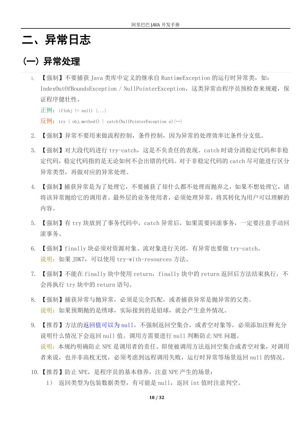 18 . 阿里巴巴 JAVA 开发手册 二、异常日志 (一) 异常处理 1. 【强制】不要捕获 Java 类库中定义的继承自 RuntimeException 的运行时异常类,如: IndexOutOfBoundsException / NullPointerException,这类异常由程序员预检查来规避,保 证程序健壮性。 正例:if(obj != null) {...} 反例:try { obj.method() } catch(NullPointerException e){…} 2. 【强制】异常不要用来做流程控制,条件控制,因为异常的处理效率比条件分支低。 3. 【强制】对大段代码进行 try-catch,这是不负责任的表现。catch 时请分清稳定代码和非稳 定代码,稳定代码指的是无论如何不会出错的代码。对于非稳定代码的 catch 尽可能进行区分 异常类型,再做对应的异常处理。 4. 【强制】捕获异常是为了处理它,不要捕获了却什么都不处理而抛弃之,如果不想处理它,请 将该异常抛给它的调用者。最外层的业务使用者,必须处理异常,将其转化为用户可以理解的 内容。 5. 【强制】有 try 块放到了事务代码中,catch 异常后,如果需要回滚事务,一定要注意手动回 滚事务。 6. 【强制】finally 块必须对资源对象、流对象进行关闭,有异常也要做 try-catch。 说明:如果 JDK7,可以使用 try-with-resources 方法。 7. 【强制】不能在 finally 块中使用 return,finally 块中的 return 返回后方法结束执行,不 会再执行 try 块中的 return 语句。 8. 【强制】捕获异常与抛异常,必须是完全匹配,或者捕获异常是抛异常的父类。 说明:如果预期抛的是绣球,实际接到的是铅球,就会产生意外情况。 9. 【推荐】方法的返回值可以为 null,不强制返回空集合,或者空对象等,必须添加注释充分 说明什么情况下会返回 null 值。调用方需要进行 null 判断防止 NPE 问题。 说明:本规约明确防止 NPE 是调用者的责任。即使被调用方法返回空集合或者空对象,对调用 者来说,也并非高枕无忧,必须考虑到远程调用失败,运行时异常等场景返回 null 的情况。 10.【推荐】防止 NPE,是程序员的基本修养,注意 NPE 产生的场景: 1) 返回类型为包装数据类型,有可能是 null,返回 int 值时注意判空。 18 / 32