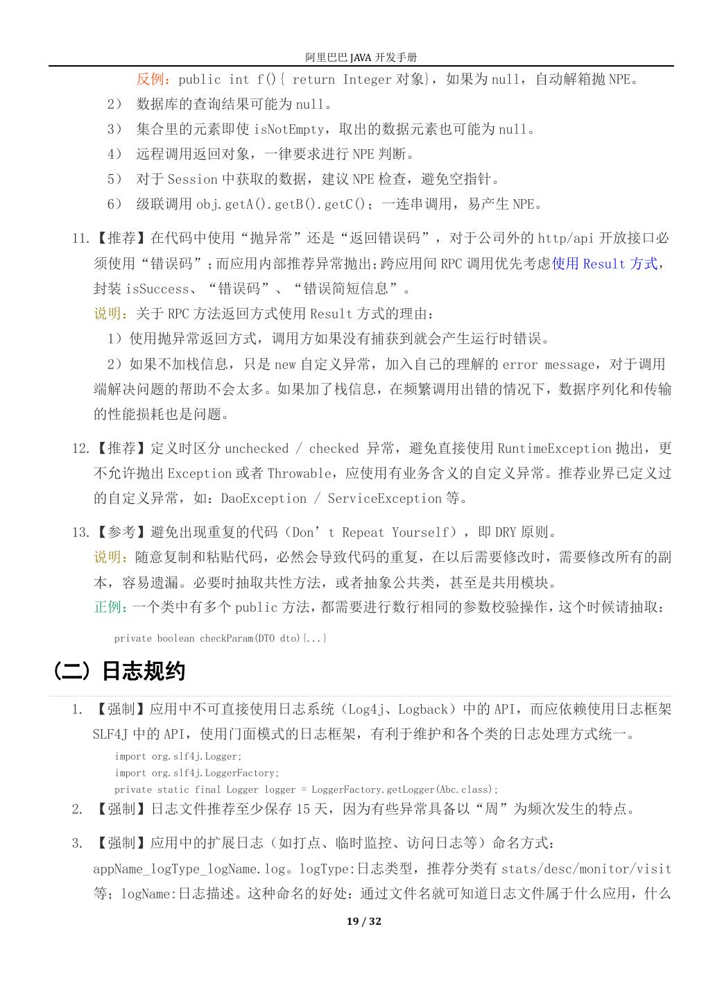 19 . 阿里巴巴 JAVA 开发手册 反例:public int f(){ return Integer 对象},如果为 null,自动解箱抛 NPE。 2) 数据库的查询结果可能为 null。 3) 集合里的元素即使 isNotEmpty,取出的数据元素也可能为 null。 4) 远程调用返回对象,一律要求进行 NPE 判断。 5) 对于 Session 中获取的数据,建议 NPE 检查,避免空指针。 6) 级联调用 obj.getA().getB().getC();一连串调用,易产生 NPE。 11.【推荐】在代码中使用“抛异常”还是“返回错误码”,对于公司外的 http/api 开放接口必 须使用“错误码”;而应用内部推荐异常抛出;跨应用间 RPC 调用优先考虑使用 Result 方式, 封装 isSuccess、“错误码”、“错误简短信息”。 说明:关于 RPC 方法返回方式使用 Result 方式的理由: 1)使用抛异常返回方式,调用方如果没有捕获到就会产生运行时错误。 2)如果不加栈信息,只是 new 自定义异常,加入自己的理解的 error message,对于调用 端解决问题的帮助不会太多。如果加了栈信息,在频繁调用出错的情况下,数据序列化和传输 的性能损耗也是问题。 12.【推荐】定义时区分 unchecked / checked 异常,避免直接使用 RuntimeException 抛出,更 不允许抛出 Exception 或者 Throwable,应使用有业务含义的自定义异常。推荐业界已定义过 的自定义异常,如:DaoException / ServiceException 等。 13.【参考】避免出现重复的代码(Don’t Repeat Yourself),即 DRY 原则。 说明:随意复制和粘贴代码,必然会导致代码的重复,在以后需要修改时,需要修改所有的副 本,容易遗漏。必要时抽取共性方法,或者抽象公共类,甚至是共用模块。 正例:一个类中有多个 public 方法,都需要进行数行相同的参数校验操作,这个时候请抽取: private boolean checkParam(DTO dto){...} (二) 日志规约 1. 【强制】应用中不可直接使用日志系统(Log4j、Logback)中的 API,而应依赖使用日志框架 SLF4J 中的 API,使用门面模式的日志框架,有利于维护和各个类的日志处理方式统一。 import org.slf4j.Logger; import org.slf4j.LoggerFactory; private static final Logger logger = LoggerFactory.getLogger(Abc.class); 2. 【强制】日志文件推荐至少保存 15 天,因为有些异常具备以“周”为频次发生的特点。 3. 【强制】应用中的扩展日志(如打点、临时监控、访问日志等)命名方式: appName_logType_logName.log。logType:日志类型,推荐分类有 stats/desc/monitor/visit 等;logName:日志描述。这种命名的好处:通过文件名就可知道日志文件属于什么应用,什么 19 / 32