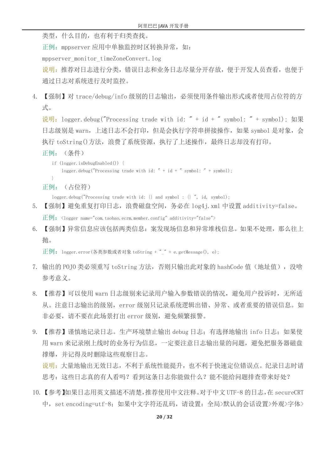 20 . 阿里巴巴 JAVA 开发手册 类型,什么目的,也有利于归类查找。 正例:mppserver 应用中单独监控时区转换异常,如: mppserver_monitor_timeZoneConvert.log 说明:推荐对日志进行分类,错误日志和业务日志尽量分开存放,便于开发人员查看,也便于 通过日志对系统进行及时监控。 4. 【强制】对 trace/debug/info 级别的日志输出,必须使用条件输出形式或者使用占位符的方 式。 说明:logger.debug("Processing trade with id: " + id + " symbol: " + symbol); 如果 日志级别是 warn,上述日志不会打印,但是会执行字符串拼接操作,如果 symbol 是对象,会 执行 toString()方法,浪费了系统资源,执行了上述操作,最终日志却没有打印。 正例:(条件) if (logger.isDebugEnabled()) { logger.debug("Processing trade with id: " + id + " symbol: " + symbol); } 正例:(占位符) logger.debug("Processing trade with id: {} and symbol : {} ", id, symbol); 5. 【强制】避免重复打印日志,浪费磁盘空间,务必在 log4j.xml 中设置 additivity=false。 正例:<logger name="com.taobao.ecrm.member.config" additivity="false"> 6. 【强制】异常信息应该包括两类信息:案发现场信息和异常堆栈信息。如果不处理,那么往上 抛。 正例:logger.error(各类参数或者对象 toString + "_" + e.getMessage(), e); 7. 输出的 POJO 类必须重写 toString 方法,否则只输出此对象的 hashCode 值(地址值),没啥 参考意义。 8. 【推荐】可以使用 warn 日志级别来记录用户输入参数错误的情况,避免用户投诉时,无所适 从。注意日志输出的级别,error 级别只记录系统逻辑出错、异常、或者重要的错误信息。如 非必要,请不要在此场景打出 error 级别,避免频繁报警。 9. 【推荐】谨慎地记录日志。生产环境禁止输出 debug 日志;有选择地输出 info 日志;如果使 用 warn 来记录刚上线时的业务行为信息,一定要注意日志输出量的问题,避免把服务器磁盘 撑爆,并记得及时删除这些观察日志。 说明:大量地输出无效日志,不利于系统性能提升,也不利于快速定位错误点。纪录日志时请 思考:这些日志真的有人看吗?看到这条日志你能做什么?能不能给问题排查带来好处? 10.【参考】如果日志用英文描述不清楚,推荐使用中文注释。对于中文 UTF-8 的日志,在 secureCRT 中,set encoding=utf-8;如果中文字符还乱码,请设置:全局>默认的会话设置>外观>字体> 20 / 32