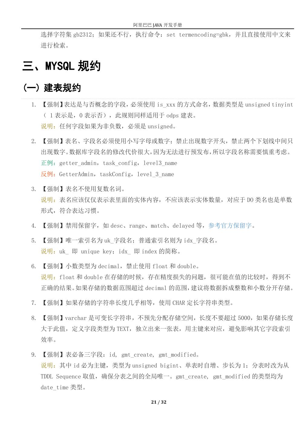 21 . 阿里巴巴 JAVA 开发手册 选择字符集 gb2312;如果还不行,执行命令:set termencoding=gbk,并且直接使用中文来 进行检索。 三、MYSQL 规约 (一) 建表规约 1. 【强制】表达是与否概念的字段,必须使用 is_xxx 的方式命名,数据类型是 unsigned tinyint ( 1 表示是,0 表示否),此规则同样适用于 odps 建表。 说明:任何字段如果为非负数,必须是 unsigned。 2. 【强制】表名、字段名必须使用小写字母或数字;禁止出现数字开头,禁止两个下划线中间只 出现数字。数据库字段名的修改代价很大,因为无法进行预发布,所以字段名称需要慎重考虑。 正例:getter_admin,task_config,level3_name 反例:GetterAdmin,taskConfig,level_3_name 3. 【强制】表名不使用复数名词。 说明:表名应该仅仅表示表里面的实体内容,不应该表示实体数量,对应于 DO 类名也是单数 形式,符合表达习惯。 4. 【强制】禁用保留字,如 desc、range、match、delayed 等,参考官方保留字。 5. 【强制】唯一索引名为 uk_字段名;普通索引名则为 idx_字段名。 说明:uk_ 即 unique key;idx_ 即 index 的简称。 6. 【强制】小数类型为 decimal,禁止使用 float 和 double。 说明:float 和 double 在存储的时候,存在精度损失的问题,很可能在值的比较时,得到不 正确的结果。如果存储的数据范围超过 decimal 的范围,建议将数据拆成整数和小数分开存储。 7. 【强制】如果存储的字符串长度几乎相等,使用 CHAR 定长字符串类型。 8. 【强制】varchar 是可变长字符串,不预先分配存储空间,长度不要超过 5000,如果存储长度 大于此值,定义字段类型为 TEXT,独立出来一张表,用主键来对应,避免影响其它字段索引 效率。 9. 【强制】表必备三字段:id, gmt_create, gmt_modified。 说明:其中 id 必为主键,类型为 unsigned bigint、单表时自增、步长为 1;分表时改为从 TDDL Sequence 取值,确保分表之间的全局唯一。gmt_create, gmt_modified 的类型均为 date_time 类型。 21 / 32