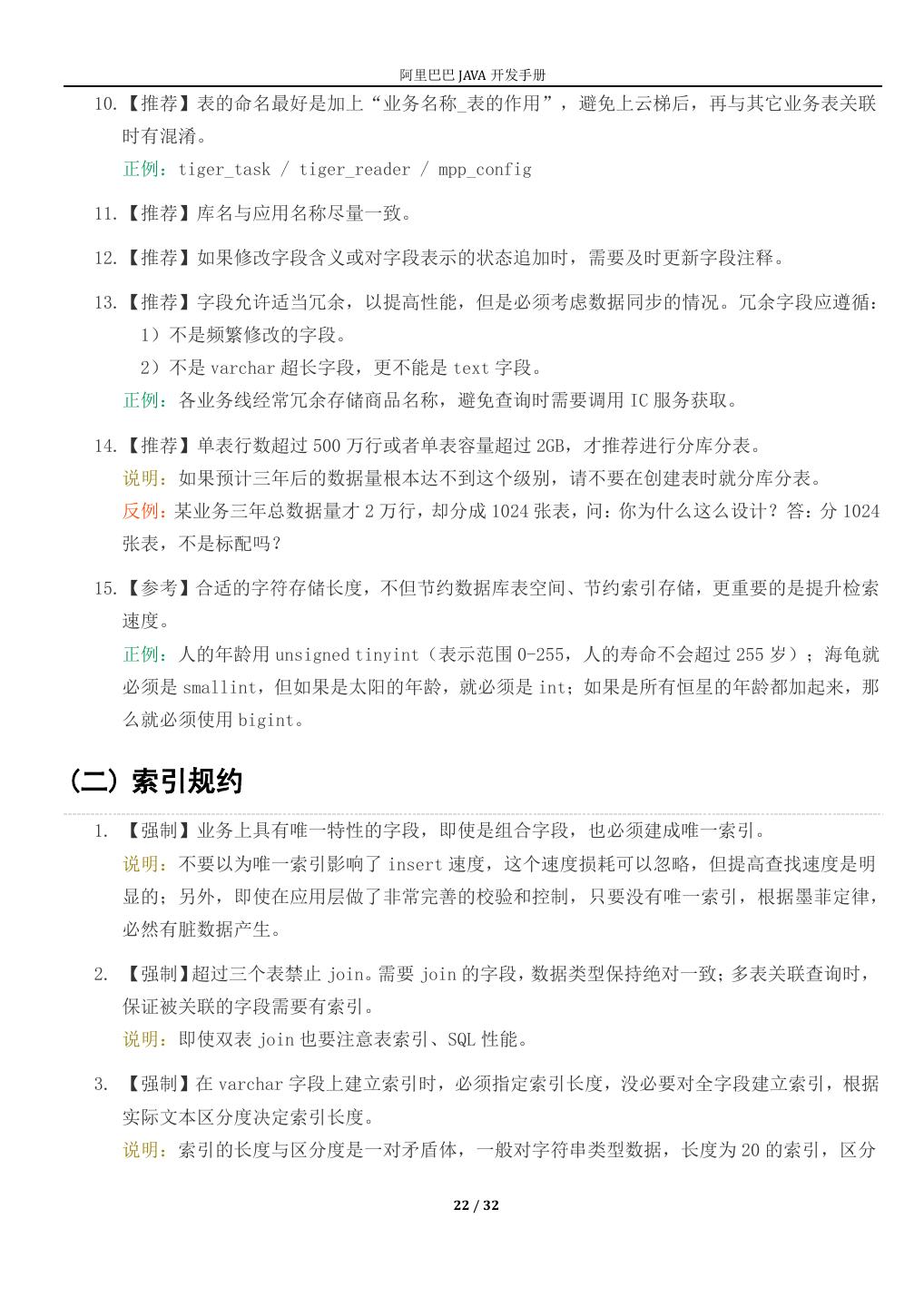 22 . 阿里巴巴 JAVA 开发手册 10.【推荐】表的命名最好是加上“业务名称_表的作用”,避免上云梯后,再与其它业务表关联 时有混淆。 正例:tiger_task / tiger_reader / mpp_config 11.【推荐】库名与应用名称尽量一致。 12.【推荐】如果修改字段含义或对字段表示的状态追加时,需要及时更新字段注释。 13.【推荐】字段允许适当冗余,以提高性能,但是必须考虑数据同步的情况。冗余字段应遵循: 1)不是频繁修改的字段。 2)不是 varchar 超长字段,更不能是 text 字段。 正例:各业务线经常冗余存储商品名称,避免查询时需要调用 IC 服务获取。 14.【推荐】单表行数超过 500 万行或者单表容量超过 2GB,才推荐进行分库分表。 说明:如果预计三年后的数据量根本达不到这个级别,请不要在创建表时就分库分表。 反例:某业务三年总数据量才 2 万行,却分成 1024 张表,问:你为什么这么设计?答:分 1024 张表,不是标配吗? 15.【参考】合适的字符存储长度,不但节约数据库表空间、节约索引存储,更重要的是提升检索 速度。 正例:人的年龄用 unsigned tinyint(表示范围 0-255,人的寿命不会超过 255 岁);海龟就 必须是 smallint,但如果是太阳的年龄,就必须是 int;如果是所有恒星的年龄都加起来,那 么就必须使用 bigint。 (二) 索引规约 1. 【强制】业务上具有唯一特性的字段,即使是组合字段,也必须建成唯一索引。 说明:不要以为唯一索引影响了 insert 速度,这个速度损耗可以忽略,但提高查找速度是明 显的;另外,即使在应用层做了非常完善的校验和控制,只要没有唯一索引,根据墨菲定律, 必然有脏数据产生。 2. 【强制】超过三个表禁止 join。需要 join 的字段,数据类型保持绝对一致;多表关联查询时, 保证被关联的字段需要有索引。 说明:即使双表 join 也要注意表索引、SQL 性能。 3. 【强制】在 varchar 字段上建立索引时,必须指定索引长度,没必要对全字段建立索引,根据 实际文本区分度决定索引长度。 说明:索引的长度与区分度是一对矛盾体,一般对字符串类型数据,长度为 20 的索引,区分 22 / 32