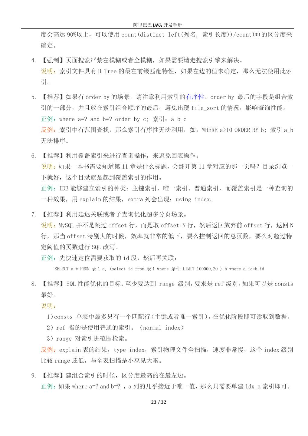23 . 阿里巴巴 JAVA 开发手册 度会高达 90%以上,可以使用 count(distinct left(列名, 索引长度))/count(*)的区分度来 确定。 4. 【强制】页面搜索严禁左模糊或者全模糊,如果需要请走搜索引擎来解决。 说明:索引文件具有 B-Tree 的最左前缀匹配特性,如果左边的值未确定,那么无法使用此索 引。 5. 【推荐】如果有 order by 的场景,请注意利用索引的有序性。order by 最后的字段是组合索 引的一部分,并且放在索引组合顺序的最后,避免出现 file_sort 的情况,影响查询性能。 正例:where a=? and b=? order by c; 索引:a_b_c 反例:索引中有范围查找,那么索引有序性无法利用,如:WHERE a>10 ORDER BY b; 索引 a_b 无法排序。 6. 【推荐】利用覆盖索引来进行查询操作,来避免回表操作。 说明:如果一本书需要知道第 11 章是什么标题,会翻开第 11 章对应的那一页吗?目录浏览一 下就好,这个目录就是起到覆盖索引的作用。 正例:IDB 能够建立索引的种类:主键索引、唯一索引、普通索引,而覆盖索引是一种查询的 一种效果,用 explain 的结果,extra 列会出现:using index. 7. 【推荐】利用延迟关联或者子查询优化超多分页场景。 说明:MySQL 并不是跳过 offset 行,而是取 offset+N 行,然后返回放弃前 offset 行,返回 N 行,那当 offset 特别大的时候,效率就非常的低下,要么控制返回的总页数,要么对超过特 定阈值的页数进行 SQL 改写。 正例:先快速定位需要获取的 id 段,然后再关联: SELECT a.* FROM 表 1 a, (select id from 表 1 where 条件 LIMIT 100000,20 ) b where a.id=b.id 8. 【推荐】 SQL 性能优化的目标:至少要达到 range 级别,要求是 ref 级别,如果可以是 consts 最好。 说明: 1)consts 单表中最多只有一个匹配行(主键或者唯一索引),在优化阶段即可读取到数据。 2)ref 指的是使用普通的索引。(normal index) 3)range 对索引进范围检索。 反例:explain 表的结果,type=index,索引物理文件全扫描,速度非常慢,这个 index 级别 比较 range 还低,与全表扫描是小巫见大巫。 9. 【推荐】建组合索引的时候,区分度最高的在最左边。 正例:如果 where a=? and b=? ,a 列的几乎接近于唯一值,那么只需要单建 idx_a 索引即可。 23 / 32
