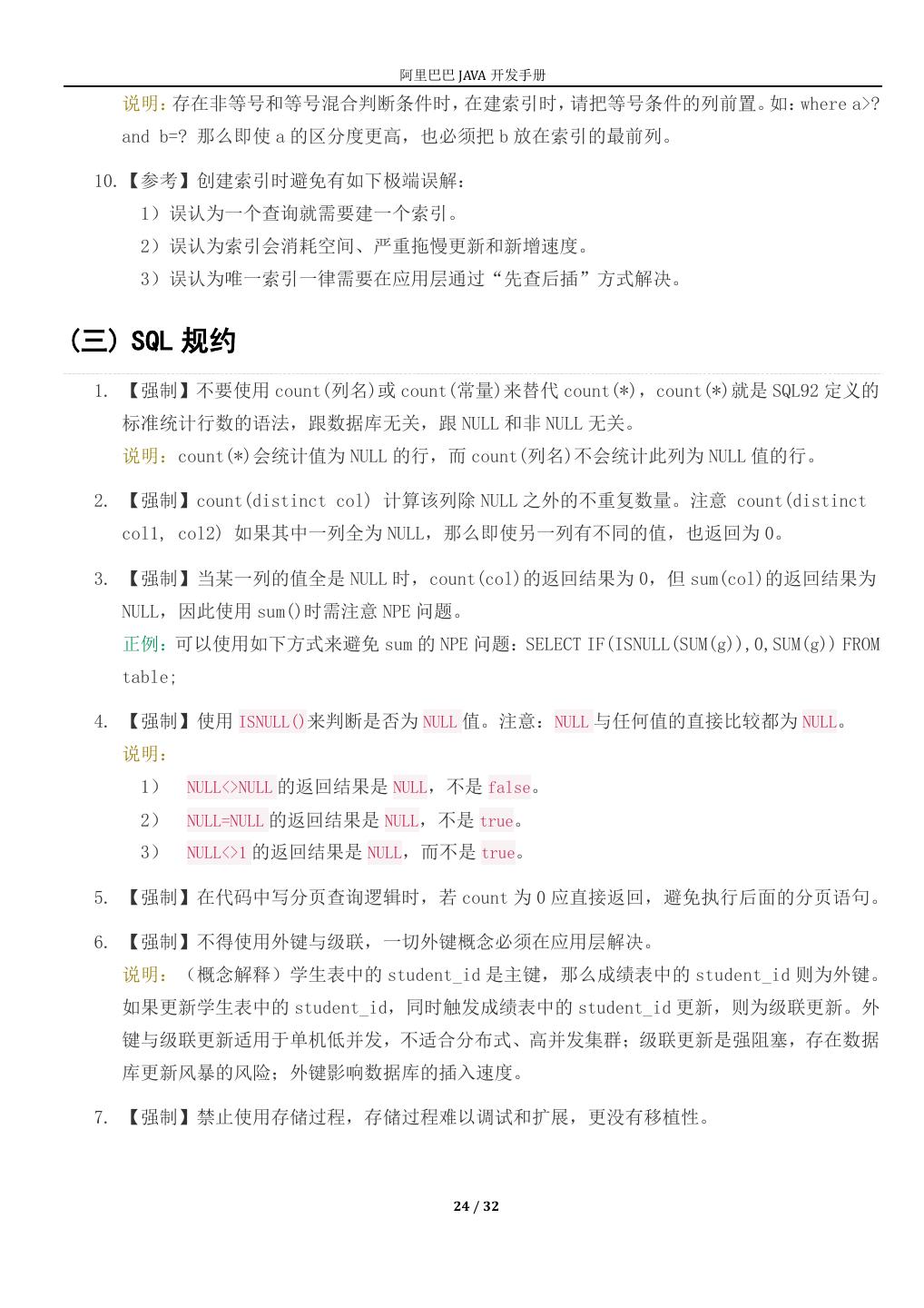 24 . 阿里巴巴 JAVA 开发手册 说明:存在非等号和等号混合判断条件时,在建索引时,请把等号条件的列前置。如:where a>? and b=? 那么即使 a 的区分度更高,也必须把 b 放在索引的最前列。 10.【参考】创建索引时避免有如下极端误解: 1)误认为一个查询就需要建一个索引。 2)误认为索引会消耗空间、严重拖慢更新和新增速度。 3)误认为唯一索引一律需要在应用层通过“先查后插”方式解决。 (三) SQL 规约 1. 【强制】不要使用 count(列名)或 count(常量)来替代 count(*),count(*)就是 SQL92 定义的 标准统计行数的语法,跟数据库无关,跟 NULL 和非 NULL 无关。 说明:count(*)会统计值为 NULL 的行,而 count(列名)不会统计此列为 NULL 值的行。 2. 【强制】count(distinct col) 计算该列除 NULL 之外的不重复数量。注意 count(distinct col1, col2) 如果其中一列全为 NULL,那么即使另一列有不同的值,也返回为 0。 3. 【强制】当某一列的值全是 NULL 时,count(col)的返回结果为 0,但 sum(col)的返回结果为 NULL,因此使用 sum()时需注意 NPE 问题。 正例:可以使用如下方式来避免 sum 的 NPE 问题:SELECT IF(ISNULL(SUM(g)),0,SUM(g)) FROM table; 4. 【强制】使用 ISNULL()来判断是否为 NULL 值。注意:NULL 与任何值的直接比较都为 NULL。 说明: 1) NULL<>NULL 的返回结果是 NULL,不是 false。 2) NULL=NULL 的返回结果是 NULL,不是 true。 3) NULL<>1 的返回结果是 NULL,而不是 true。 5. 【强制】在代码中写分页查询逻辑时,若 count 为 0 应直接返回,避免执行后面的分页语句。 6. 【强制】不得使用外键与级联,一切外键概念必须在应用层解决。 说明:(概念解释)学生表中的 student_id 是主键,那么成绩表中的 student_id 则为外键。 如果更新学生表中的 student_id,同时触发成绩表中的 student_id 更新,则为级联更新。外 键与级联更新适用于单机低并发,不适合分布式、高并发集群;级联更新是强阻塞,存在数据 库更新风暴的风险;外键影响数据库的插入速度。 7. 【强制】禁止使用存储过程,存储过程难以调试和扩展,更没有移植性。 24 / 32