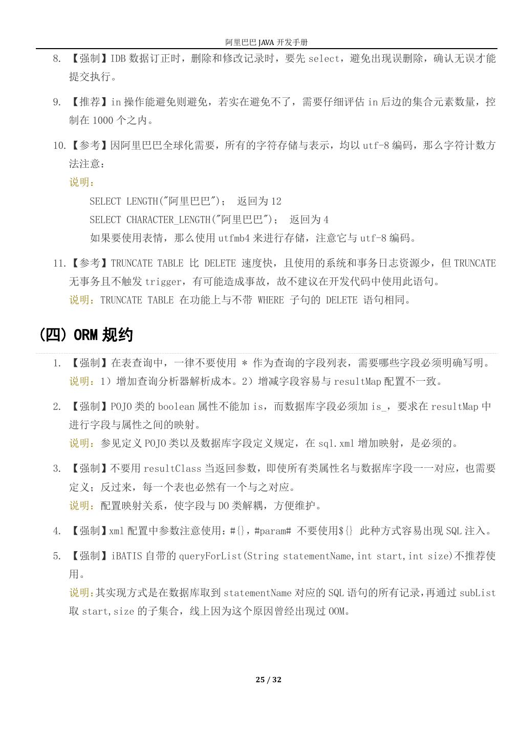 25 . 阿里巴巴 JAVA 开发手册 8. 【强制】IDB 数据订正时,删除和修改记录时,要先 select,避免出现误删除,确认无误才能 提交执行。 9. 【推荐】in 操作能避免则避免,若实在避免不了,需要仔细评估 in 后边的集合元素数量,控 制在 1000 个之内。 10.【参考】因阿里巴巴全球化需要,所有的字符存储与表示,均以 utf-8 编码,那么字符计数方 法注意: 说明: SELECT LENGTH("阿里巴巴"); 返回为 12 SELECT CHARACTER_LENGTH("阿里巴巴"); 返回为 4 如果要使用表情,那么使用 utfmb4 来进行存储,注意它与 utf-8 编码。 11.【参考】TRUNCATE TABLE 比 DELETE 速度快,且使用的系统和事务日志资源少,但 TRUNCATE 无事务且不触发 trigger,有可能造成事故,故不建议在开发代码中使用此语句。 说明:TRUNCATE TABLE 在功能上与不带 WHERE 子句的 DELETE 语句相同。 (四) ORM 规约 1. 【强制】在表查询中,一律不要使用 * 作为查询的字段列表,需要哪些字段必须明确写明。 说明:1)增加查询分析器解析成本。2)增减字段容易与 resultMap 配置不一致。 2. 【强制】POJO 类的 boolean 属性不能加 is,而数据库字段必须加 is_,要求在 resultMap 中 进行字段与属性之间的映射。 说明:参见定义 POJO 类以及数据库字段定义规定,在 sql.xml 增加映射,是必须的。 3. 【强制】不要用 resultClass 当返回参数,即使所有类属性名与数据库字段一一对应,也需要 定义;反过来,每一个表也必然有一个与之对应。 说明:配置映射关系,使字段与 DO 类解耦,方便维护。 4. 【强制】xml 配置中参数注意使用:#{},#param# 不要使用${} 此种方式容易出现 SQL 注入。 5. 【强制】iBATIS 自带的 queryForList(String statementName,int start,int size)不推荐使 用。 说明: 其实现方式是在数据库取到 statementName 对应的 SQL 语句的所有记录,再通过 subList 取 start,size 的子集合,线上因为这个原因曾经出现过 OOM。 25 / 32