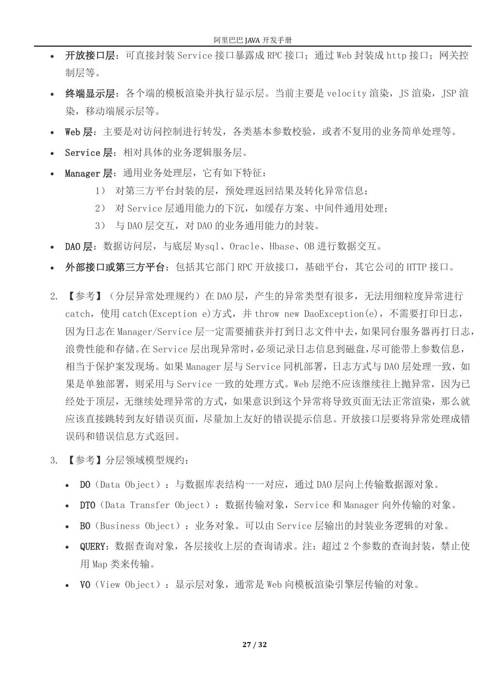 27 . 阿里巴巴 JAVA 开发手册 开放接口层:可直接封装 Service 接口暴露成 RPC 接口;通过 Web 封装成 http 接口;网关控 制层等。 终端显示层:各个端的模板渲染并执行显示层。当前主要是 velocity 渲染,JS 渲染,JSP 渲 染,移动端展示层等。 Web 层:主要是对访问控制进行转发,各类基本参数校验,或者不复用的业务简单处理等。 Service 层:相对具体的业务逻辑服务层。 Manager 层:通用业务处理层,它有如下特征: 1) 对第三方平台封装的层,预处理返回结果及转化异常信息; 2) 对 Service 层通用能力的下沉,如缓存方案、中间件通用处理; 3) 与 DAO 层交互,对 DAO 的业务通用能力的封装。 DAO 层:数据访问层,与底层 Mysql、Oracle、Hbase、OB 进行数据交互。 外部接口或第三方平台:包括其它部门 RPC 开放接口,基础平台,其它公司的 HTTP 接口。 2. 【参考】(分层异常处理规约)在 DAO 层,产生的异常类型有很多,无法用细粒度异常进行 catch,使用 catch(Exception e)方式,并 throw new DaoException(e),不需要打印日志, 因为日志在 Manager/Service 层一定需要捕获并打到日志文件中去,如果同台服务器再打日志, 浪费性能和存储。在 Service 层出现异常时,必须记录日志信息到磁盘,尽可能带上参数信息, 相当于保护案发现场。如果 Manager 层与 Service 同机部署,日志方式与 DAO 层处理一致,如 果是单独部署,则采用与 Service 一致的处理方式。Web 层绝不应该继续往上抛异常,因为已 经处于顶层,无继续处理异常的方式,如果意识到这个异常将导致页面无法正常渲染,那么就 应该直接跳转到友好错误页面,尽量加上友好的错误提示信息。开放接口层要将异常处理成错 误码和错误信息方式返回。 3. 【参考】分层领域模型规约: DO(Data Object):与数据库表结构一一对应,通过 DAO 层向上传输数据源对象。 DTO(Data Transfer Object):数据传输对象,Service 和 Manager 向外传输的对象。 BO(Business Object):业务对象。可以由 Service 层输出的封装业务逻辑的对象。 QUERY:数据查询对象,各层接收上层的查询请求。注:超过 2 个参数的查询封装,禁止使 用 Map 类来传输。 VO(View Object):显示层对象,通常是 Web 向模板渲染引擎层传输的对象。 27 / 32
