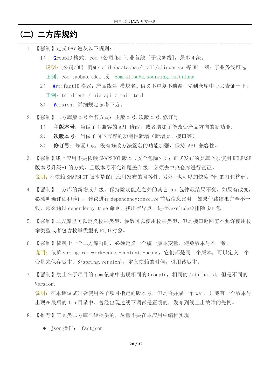28 . 阿里巴巴 JAVA 开发手册 (二) 二方库规约 1. 【强制】定义 GAV 遵从以下规则: 1) GroupID 格式:com.{公司/BU }.业务线.[子业务线],最多 4 级。 说明:{公司/BU} 例如:alibaba/taobao/tmall/aliexpress 等 BU 一级;子业务线可选。 正例:com.taobao.tddl 或 com.alibaba.sourcing.multilang 2) ArtifactID 格式:产品线名-模块名。语义不重复不遗漏,先到仓库中心去查证一下。 正例:tc-client / uic-api / tair-tool 3) Version:详细规定参考下方。 2. 【强制】二方库版本号命名方式:主版本号.次版本号.修订号 1) 主版本号:当做了不兼容的 API 修改,或者增加了能改变产品方向的新功能。 2) 次版本号:当做了向下兼容的功能性新增(新增类、接口等)。 3) 修订号:修复 bug,没有修改方法签名的功能加强,保持 API 兼容性。 3. 【强制】线上应用不要依赖 SNAPSHOT 版本(安全包除外);正式发布的类库必须使用 RELEASE 版本号升级+1 的方式,且版本号不允许覆盖升级,必须去中央仓库进行查证。 说明:不依赖 SNAPSHOT 版本是保证应用发布的幂等性。另外,也可以加快编译时的打包构建。 4. 【强制】二方库的新增或升级,保持除功能点之外的其它 jar 包仲裁结果不变。如果有改变, 必须明确评估和验证,建议进行 dependency:resolve 前后信息比对,如果仲裁结果完全不一 致,那么通过 dependency:tree 命令,找出差异点,进行<excludes>排除 jar 包。 5. 【强制】二方库里可以定义枚举类型,参数可以使用枚举类型,但是接口返回值不允许使用枚 举类型或者包含枚举类型的 POJO 对象。 6. 【强制】依赖于一个二方库群时,必须定义一个统一版本变量,避免版本号不一致。 说明:依赖 springframework-core,-context,-beans,它们都是同一个版本,可以定义一个 变量来保存版本:${spring.version},定义依赖的时候,引用该版本。 7. 【强制】禁止在子项目的 pom 依赖中出现相同的 GroupId,相同的 ArtifactId,但是不同的 Version。 说明:在本地调试时会使用各子项目指定的版本号,但是合并成一个 war,只能有一个版本号 出现在最后的 lib 目录中。曾经出现过线下调试是正确的,发布到线上出故障的先例。 8. 【推荐】工具类二方库已经提供的,尽量不要在本应用中编程实现。 json 操作: fastjson 28 / 32
