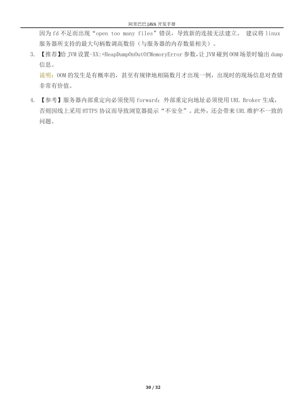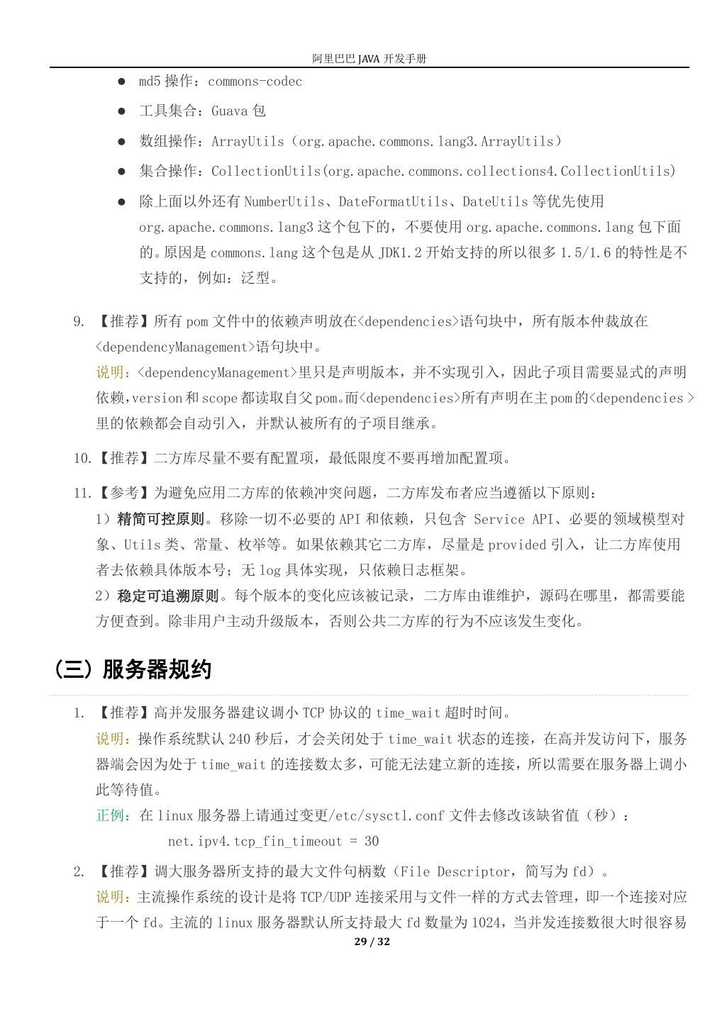 29 . 阿里巴巴 JAVA 开发手册 md5 操作:commons-codec 工具集合:Guava 包 数组操作:ArrayUtils(org.apache.commons.lang3.ArrayUtils) 集合操作:CollectionUtils(org.apache.commons.collections4.CollectionUtils) 除上面以外还有 NumberUtils、DateFormatUtils、DateUtils 等优先使用 org.apache.commons.lang3 这个包下的,不要使用 org.apache.commons.lang 包下面 的。原因是 commons.lang 这个包是从 JDK1.2 开始支持的所以很多 1.5/1.6 的特性是不 支持的,例如:泛型。 9. 【推荐】所有 pom 文件中的依赖声明放在<dependencies>语句块中,所有版本仲裁放在 <dependencyManagement>语句块中。 说明:<dependencyManagement>里只是声明版本,并不实现引入,因此子项目需要显式的声明 依赖, version 和 scope 都读取自父 pom。而<dependencies>所有声明在主 pom 的<dependencies > 里的依赖都会自动引入,并默认被所有的子项目继承。 10.【推荐】二方库尽量不要有配置项,最低限度不要再增加配置项。 11.【参考】为避免应用二方库的依赖冲突问题,二方库发布者应当遵循以下原则: 1)精简可控原则。移除一切不必要的 API 和依赖,只包含 Service API、必要的领域模型对 象、Utils 类、常量、枚举等。如果依赖其它二方库,尽量是 provided 引入,让二方库使用 者去依赖具体版本号;无 log 具体实现,只依赖日志框架。 2)稳定可追溯原则。每个版本的变化应该被记录,二方库由谁维护,源码在哪里,都需要能 方便查到。除非用户主动升级版本,否则公共二方库的行为不应该发生变化。 (三) 服务器规约 1. 【推荐】高并发服务器建议调小 TCP 协议的 time_wait 超时时间。 说明:操作系统默认 240 秒后,才会关闭处于 time_wait 状态的连接,在高并发访问下,服务 器端会因为处于 time_wait 的连接数太多,可能无法建立新的连接,所以需要在服务器上调小 此等待值。 正例:在 linux 服务器上请通过变更/etc/sysctl.conf 文件去修改该缺省值(秒): net.ipv4.tcp_fin_timeout = 30 2. 【推荐】调大服务器所支持的最大文件句柄数(File Descriptor,简写为 fd)。 说明:主流操作系统的设计是将 TCP/UDP 连接采用与文件一样的方式去管理,即一个连接对应 于一个 fd。主流的 linux 服务器默认所支持最大 fd 数量为 1024,当并发连接数很大时很容易 29 / 32