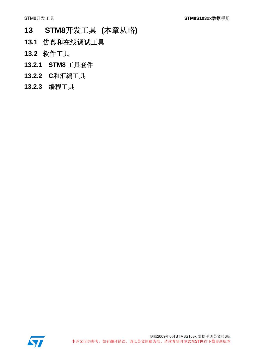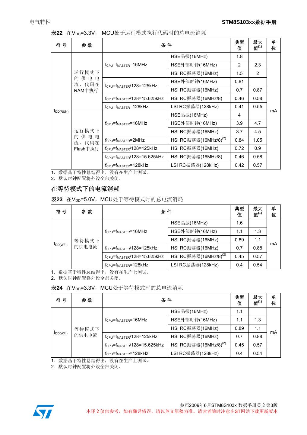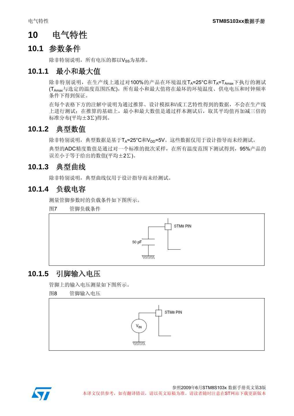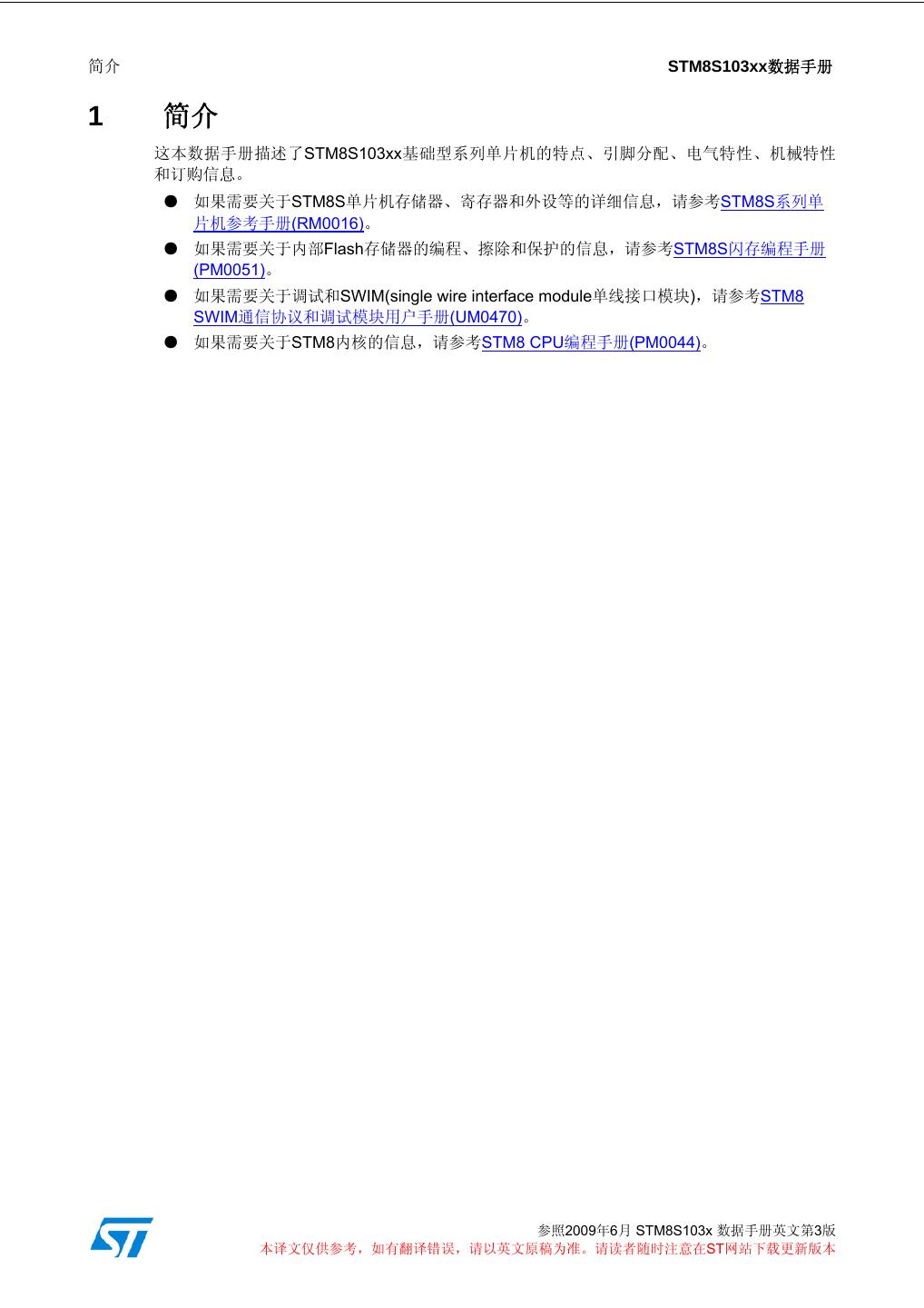 4 .简介 STM8S103xx数据手册 1 简介 这本数据手册描述了STM8S103xx基础型系列单片机的特点、引脚分配、电气特性、机械特性 和订购信息。 ● 如果需要关于STM8S单片机存储器、寄存器和外设等的详细信息,请参考STM8S系列单 片机参考手册(RM0016)。 ● 如果需要关于内部Flash存储器的编程、擦除和保护的信息,请参考STM8S闪存编程手册 (PM0051)。 ● 如果需要关于调试和SWIM(single wire interface module单线接口模块),请参考STM8 SWIM通信协议和调试模块用户手册(UM0470)。 ● 如果需要关于STM8内核的信息,请参考STM8 CPU编程手册(PM0044)。 参照2009年6月 STM8S103x 数据手册英文第3版 本译文仅供参考,如有翻译错误,请以英文原稿为准。请读者随时注意在ST网站下载更新版本