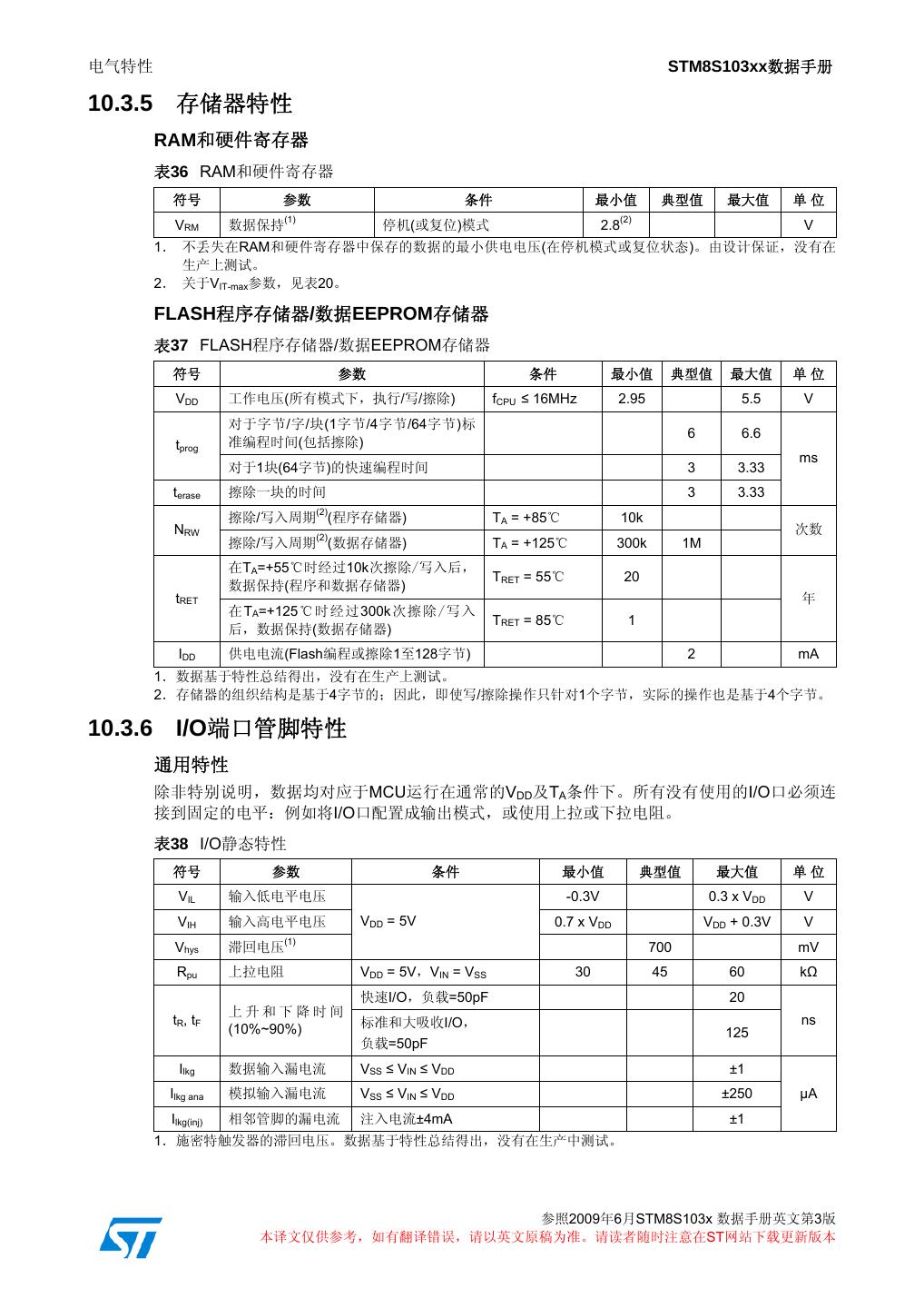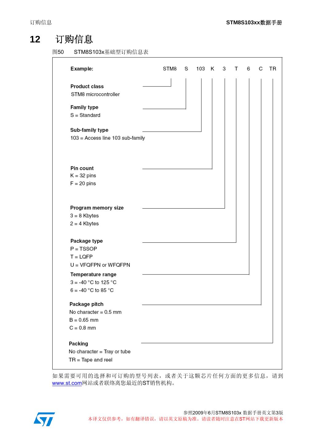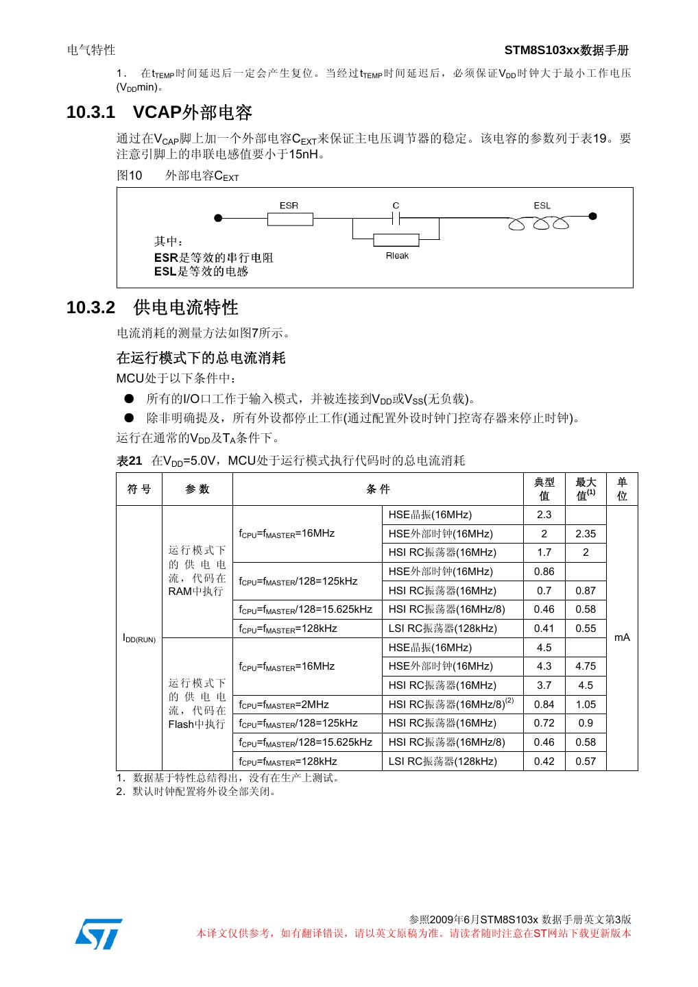4 .简介 STM8S103xx数据手册 1 简介 这本数据手册描述了STM8S103xx基础型系列单片机的特点、引脚分配、电气特性、机械特性 和订购信息。 ● 如果需要关于STM8S单片机存储器、寄存器和外设等的详细信息,请参考STM8S系列单 片机参考手册(RM0016)。 ● 如果需要关于内部Flash存储器的编程、擦除和保护的信息,请参考STM8S闪存编程手册 (PM0051)。 ● 如果需要关于调试和SWIM(single wire interface module单线接口模块),请参考STM8 SWIM通信协议和调试模块用户手册(UM0470)。 ● 如果需要关于STM8内核的信息,请参考STM8 CPU编程手册(PM0044)。 参照2009年6月 STM8S103x 数据手册英文第3版 本译文仅供参考,如有翻译错误,请以英文原稿为准。请读者随时注意在ST网站下载更新版本