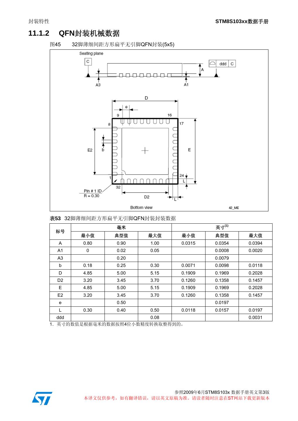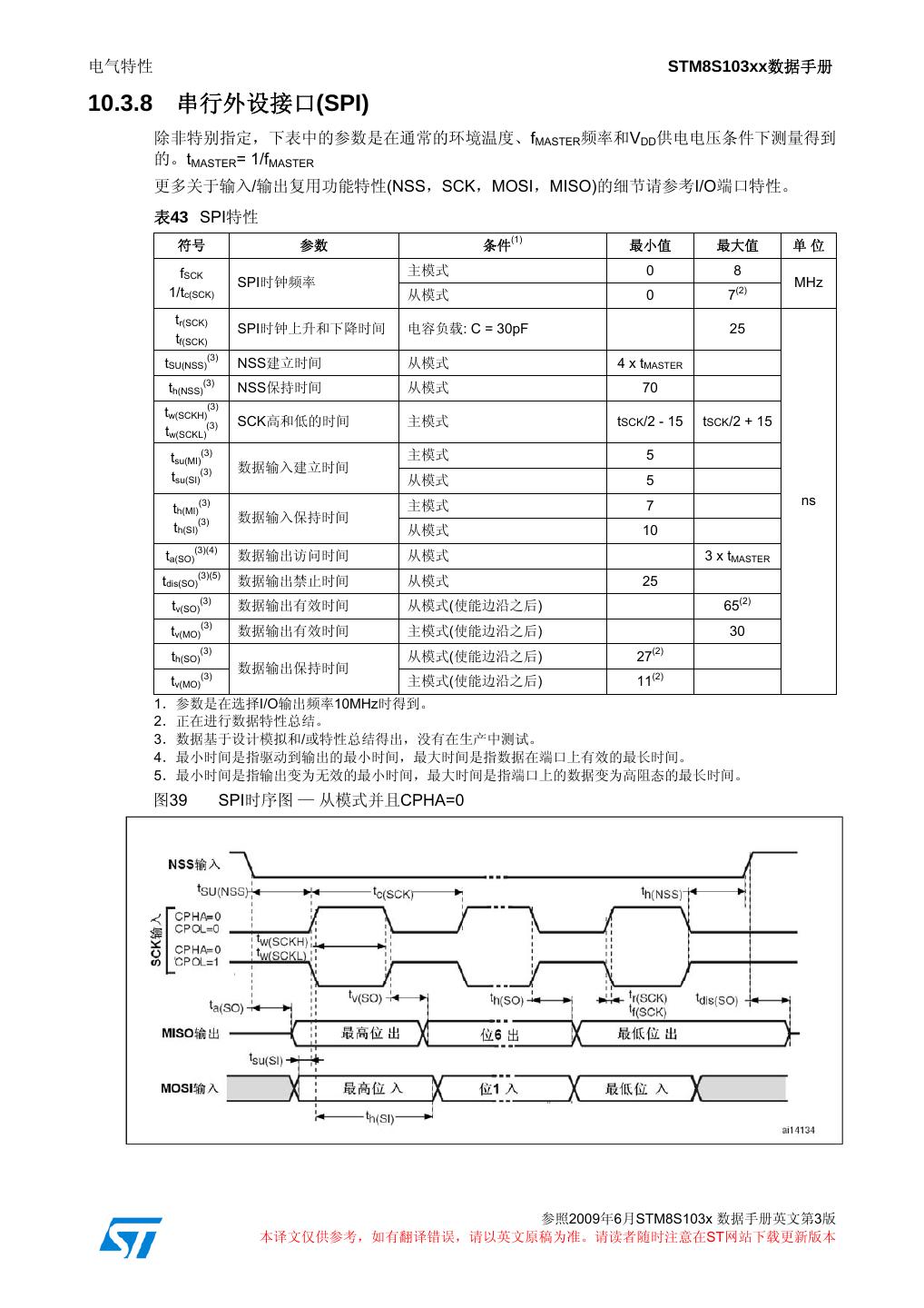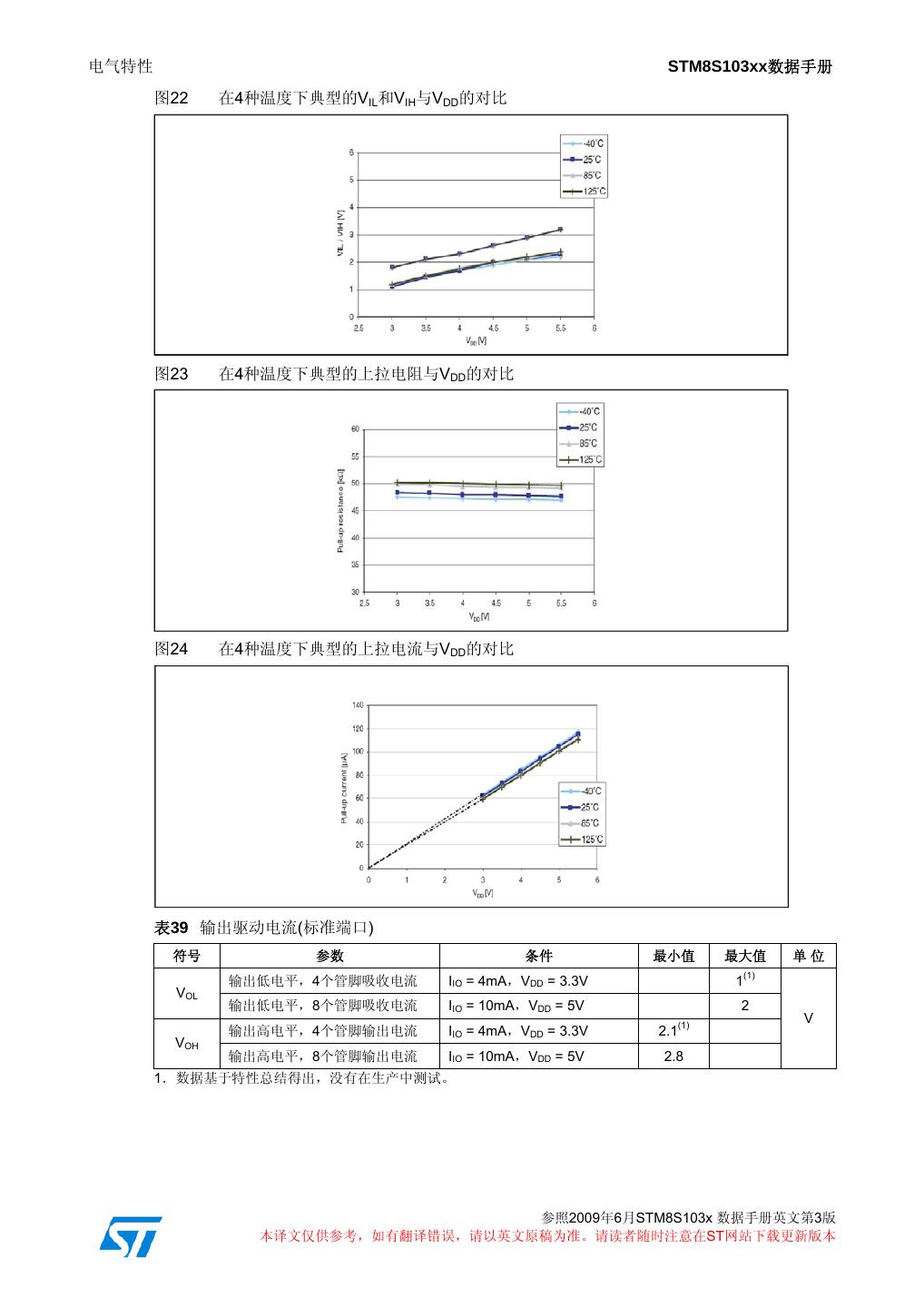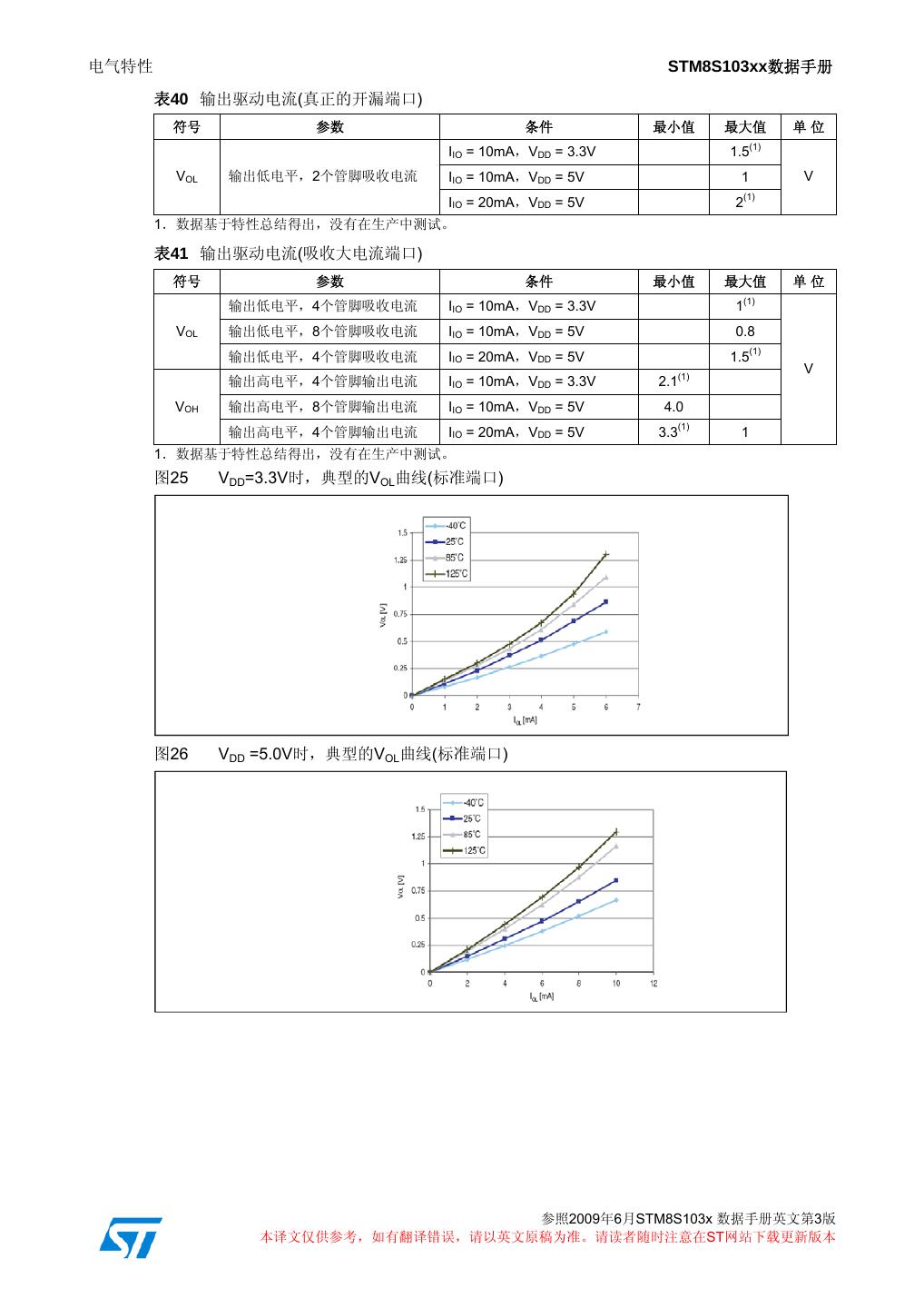 4 .简介 STM8S103xx数据手册 1 简介 这本数据手册描述了STM8S103xx基础型系列单片机的特点、引脚分配、电气特性、机械特性 和订购信息。 ● 如果需要关于STM8S单片机存储器、寄存器和外设等的详细信息,请参考STM8S系列单 片机参考手册(RM0016)。 ● 如果需要关于内部Flash存储器的编程、擦除和保护的信息,请参考STM8S闪存编程手册 (PM0051)。 ● 如果需要关于调试和SWIM(single wire interface module单线接口模块),请参考STM8 SWIM通信协议和调试模块用户手册(UM0470)。 ● 如果需要关于STM8内核的信息,请参考STM8 CPU编程手册(PM0044)。 参照2009年6月 STM8S103x 数据手册英文第3版 本译文仅供参考,如有翻译错误,请以英文原稿为准。请读者随时注意在ST网站下载更新版本