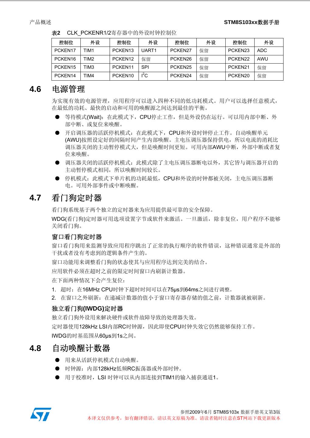 9 .产品概述 STM8S103xx数据手册 图2 Flash存储器结构 读出保护(ROP) 读出保护功能阻止在ICP模式(和调试模式)下对Flash程序存储器和数据EEPROM存储器的读写 操作。一旦读保护功能使能后,任何尝试改变其状态的操作都会将程序和数据存储器全部擦 除。尽管没有保护被认为是完全不可破解的,这个功能还是为通用的单片机提供了一个非常高 等级的保护措施。 4.5 时钟控制器 时钟控制器将来自不同振荡器的系统时钟(fMASTER)连接到内核和外设,它也为低功耗模式管理时 钟的选通,并确保时钟的可靠性。 特点: ● 时钟分频:为了在速度和电流消耗之间找到一个最佳的平衡点,可以通过一个可编程的预 分频器来调整CPU和外设的时钟频率。 ● 安全的时钟切换:通过一个配置寄存器,可以在运行的时候安全地切换时钟源。新的时钟 源准备好之前时钟信号不会被切换。这个设计能够保证无故障地切换时钟。 ● 时钟管理:为了减少功耗,时钟控制器可以关闭内核、每个外设或存储器的时钟。 ● 主时钟源:4个不同的时钟源可用来驱动主时钟 ─ 1~16MHz 高速外部晶振(HSE) ─ 最高至 16MHz 的高速外部时钟(HSE) ─ 16MHz 高速内部 RC 振荡器(HSI) ─ 128kHz 低速内部 RC(LSI) ● 启动时钟:复位之后,单片机默认运行在内部2MHz时钟下(HSI/8)。一旦代码开始运行, 应用程序就可以更改预分频比例和时钟源。 ● 时钟安全系统(CSS): 这个功能可以用软件打开。一旦HSE时钟失效,CSS可以自动地将 主时钟切换到内部RC(16MHz/8),并且可以选择产生一个中断。 ● 可配置的主时钟输出(CCO):应用程序可以控制输出一个外部时钟。 参照2009年6月 STM8S103x 数据手册英文第3版 本译文仅供参考,如有翻译错误,请以英文原稿为准。请读者随时注意在ST网站下载更新版本