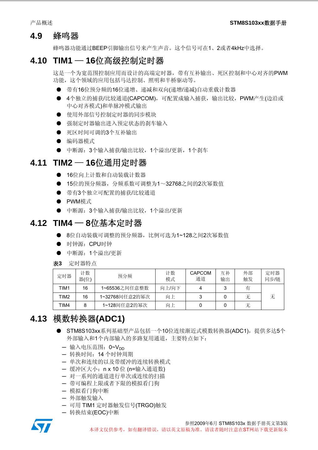 11 .产品概述 STM8S103xx数据手册 4.9 蜂鸣器 蜂鸣器功能通过BEEP引脚输出信号来产生声音。这个信号可在1、2或者4kHz中选择。 4.10 TIM1 — 16位高级控制定时器 这是一个为宽范围控制应用而设计的高端定时器,带有互补输出、死区控制和中心对齐的PWM 功能,这个领域的应用包括马达控制、照明和半桥驱动等。 ● 带有16位预分频的16位递增、递减和双向(递增/递减)自动重载计数器 ● 4个独立的捕获/比较通道(CAPCOM),可配置成输入捕获,输出比较,PWM产生(边沿或 中心对齐模式)和单脉冲模式输出 ● 使用外部信号控制定时器的同步模块 ● 强制定时器输出进入预定状态的刹车输入 ● 死区时间可调的3个互补输出 ● 编码器模式 ● 中断源:3个输入捕获/输出比较,1个溢出/更新,1个刹车 4.11 TIM2 — 16位通用定时器 ● 16位向上计数和自动装载计数器 ● 15位的预分频器,分频系数可调整为1~32768之间的2次幂数值 ● 带有3个独立可配置的捕获/比较通道 ● PWM模式 ● 中断源:3个输入捕获/输出比较,1个溢出/更新 4.12 TIM4 — 8位基本定时器 ● 8位自动装载可调整的预分频器,比例可选为1~128之间2次幂数值 ● 时钟源:CPU时钟 ● 中断源:1个溢出/更新 表3 定时器特点 计数 计数 CAPCOM 互补 外部 定时器 定时器 预分频 器(位) 模式 通道 输出 触发 同步/链 TIM1 16 1~65536之间任意整数 向上/向下 4 3 有 TIM2 16 1~32768间任意2的幂次 向上 3 0 无 无 TIM4 8 1~128间任意2的幂次 向上 0 0 无 4.13 模数转换器(ADC1) ● STM8S103xx系列基础型产品包括一个10位连续渐近式模数转换器(ADC1),提供多达5个 外部输入和1个内部输入的多路复用通道,主要特点如下: ─ 输入电压范围:0~VDD ─ 转换时间:14 个时钟周期 ─ 单次和连续的以及带缓冲的连续转换模式 ─ 缓冲区大小:n x 10 位 (n=输入通道数) ─ 对一系列的通道进行单次或连续的扫描 ─ 带可编程上限或者下限的模拟看门狗 ─ 模拟看门狗中断 ─ 外部触发输入 ─ 可用 TIM1 定时器触发信号(TRGO)触发 ─ 转换结束(EOC)中断 参照2009年6月 STM8S103x 数据手册英文第3版 本译文仅供参考,如有翻译错误,请以英文原稿为准。请读者随时注意在ST网站下载更新版本