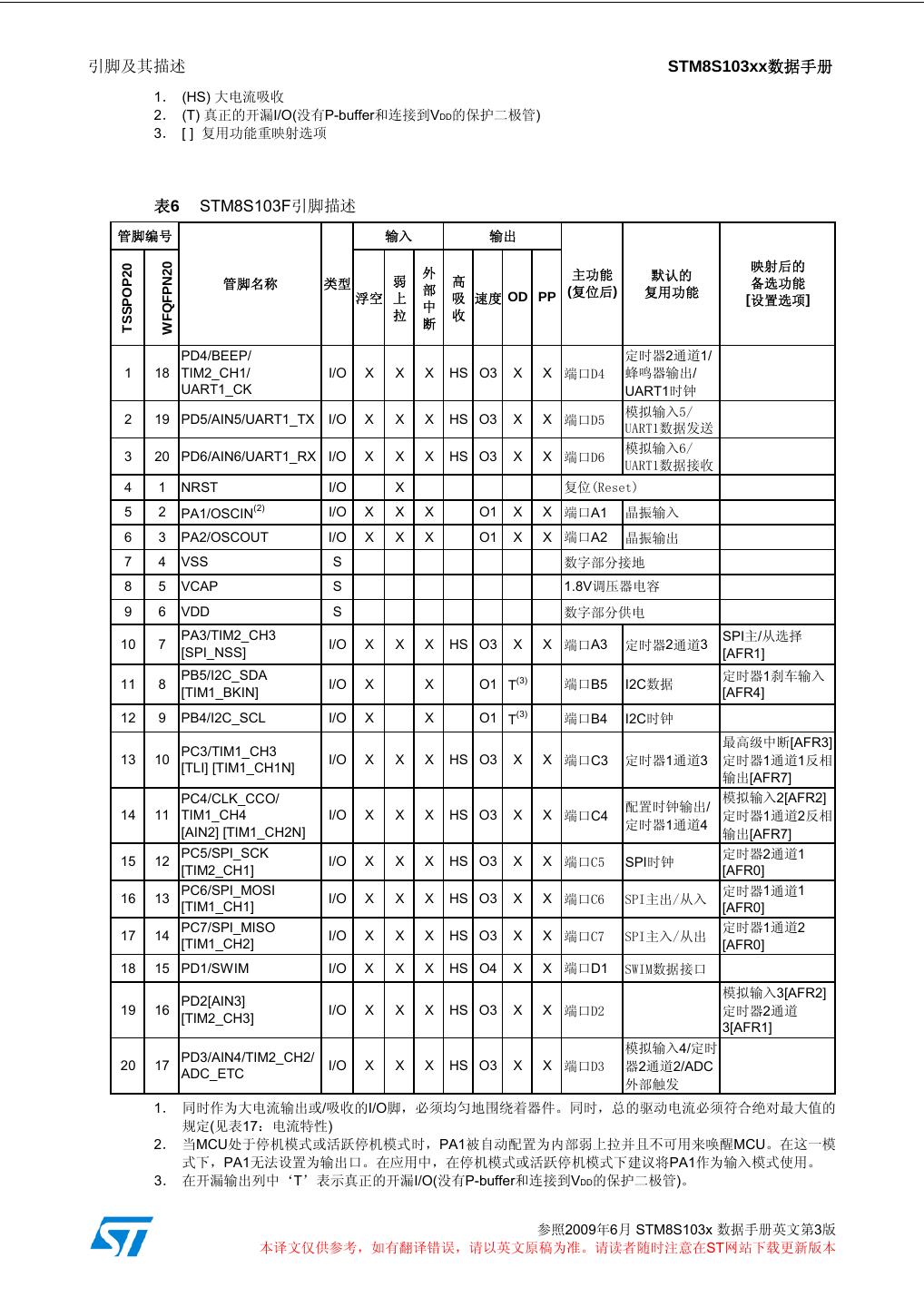 16 .引脚及其描述 STM8S103xx数据手册 1. 同时作为大电流输出或/吸收的I/O脚,必须均匀地围绕着器件。同时,总的驱动电流必须符合绝对最大值的 规定(见表17:电流特性) 2. 当MCU处于停机模式或活跃停机模式时,PA1被自动配置为内部弱上拉并且不可用来唤醒MCU。在这一模 式下,PA1无法设置为输出口。在应用中,在停机模式或活跃停机模式下建议将PA1作为输入模式使用。 3. 在开漏输出列中‘T’表示真正的开漏I/O(没有P-buffer和连接到VDD的保护二极管)。 图4 STM8S103F TSSOP 20引脚 1. (HS) 大电流吸收 2. (T) 真正的开漏I/O(没有P-buffer和连接到VDD的保护二极管) 3. [ ] 复用功能重映射选项 图5 STM8S103F UFQFPN封装引脚 参照2009年6月 STM8S103x 数据手册英文第3版 本译文仅供参考,如有翻译错误,请以英文原稿为准。请读者随时注意在ST网站下载更新版本