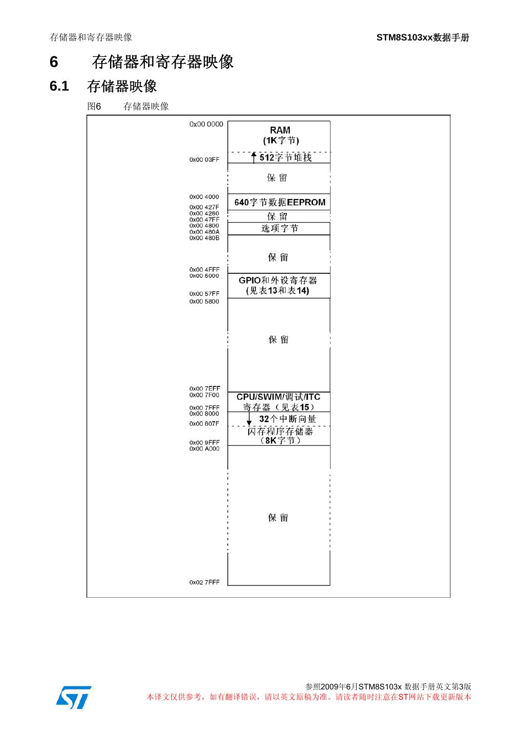 19 .存储器和寄存器映像 STM8S103xx数据手册 6 存储器和寄存器映像 6.1 存储器映像 图6 存储器映像 参照2009年6月STM8S103x 数据手册英文第3版 本译文仅供参考,如有翻译错误,请以英文原稿为准。请读者随时注意在ST网站下载更新版本