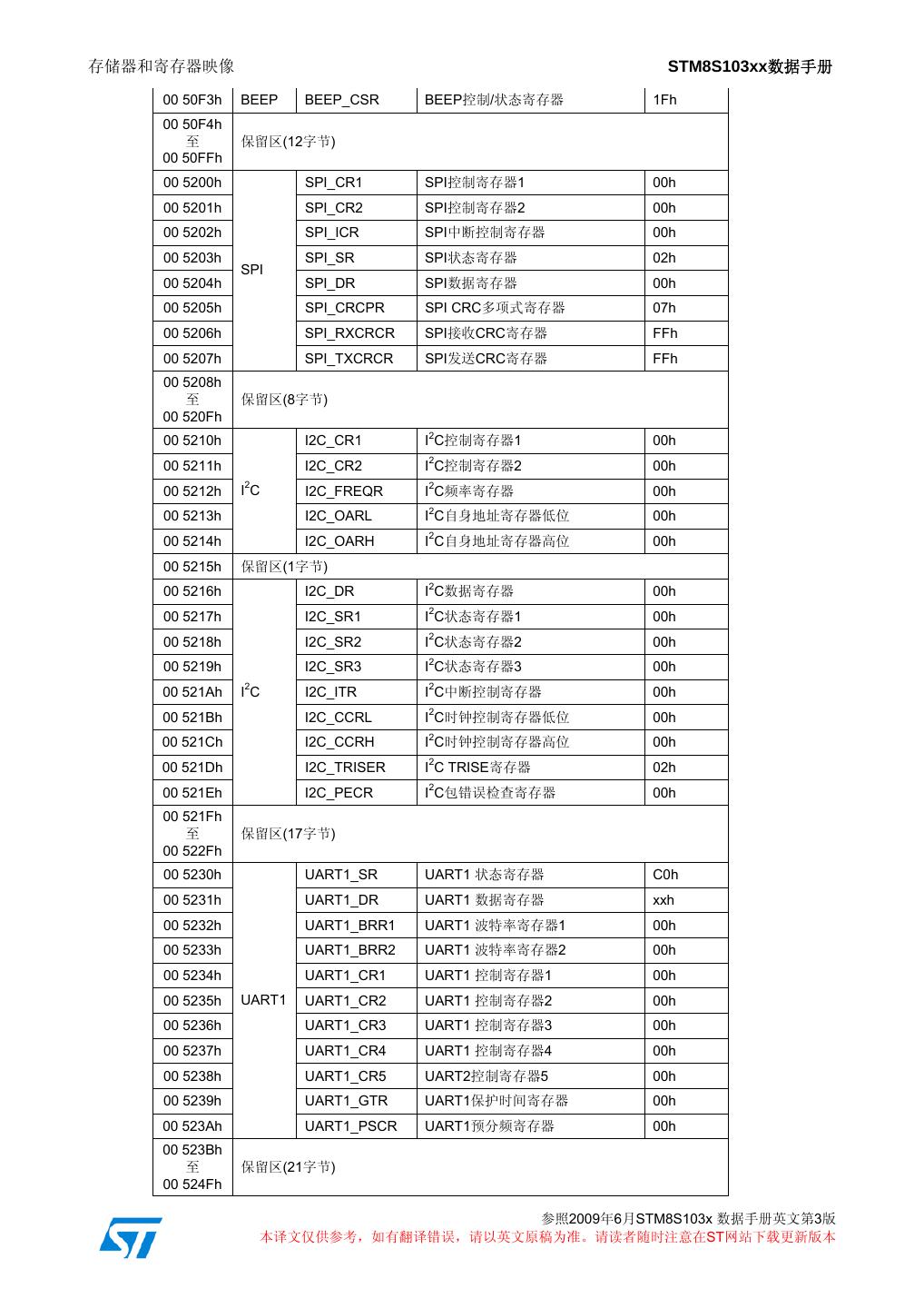 22 .存储器和寄存器映像 STM8S103xx数据手册 00 50F3h BEEP BEEP_CSR BEEP控制/状态寄存器 1Fh 00 50F4h 至 保留区(12字节) 00 50FFh 00 5200h SPI_CR1 SPI控制寄存器1 00h 00 5201h SPI_CR2 SPI控制寄存器2 00h 00 5202h SPI_ICR SPI中断控制寄存器 00h 00 5203h SPI_SR SPI状态寄存器 02h SPI 00 5204h SPI_DR SPI数据寄存器 00h 00 5205h SPI_CRCPR SPI CRC多项式寄存器 07h 00 5206h SPI_RXCRCR SPI接收CRC寄存器 FFh 00 5207h SPI_TXCRCR SPI发送CRC寄存器 FFh 00 5208h 至 保留区(8字节) 00 520Fh 00 5210h I2C_CR1 I2C控制寄存器1 00h 2 00 5211h I2C_CR2 I C控制寄存器2 00h 2 2 00 5212h IC I2C_FREQR I C频率寄存器 00h 2 00 5213h I2C_OARL I C自身地址寄存器低位 00h 2 00 5214h I2C_OARH I C自身地址寄存器高位 00h 00 5215h 保留区(1字节) 00 5216h I2C_DR I2C数据寄存器 00h 2 00 5217h I2C_SR1 I C状态寄存器1 00h 2 00 5218h I2C_SR2 I C状态寄存器2 00h 2 00 5219h I2C_SR3 I C状态寄存器3 00h 2 2 00 521Ah IC I2C_ITR I C中断控制寄存器 00h 2 00 521Bh I2C_CCRL I C时钟控制寄存器低位 00h 2 00 521Ch I2C_CCRH I C时钟控制寄存器高位 00h 2 00 521Dh I2C_TRISER I C TRISE寄存器 02h 2 00 521Eh I2C_PECR I C包错误检查寄存器 00h 00 521Fh 至 保留区(17字节) 00 522Fh 00 5230h UART1_SR UART1 状态寄存器 C0h 00 5231h UART1_DR UART1 数据寄存器 xxh 00 5232h UART1_BRR1 UART1 波特率寄存器1 00h 00 5233h UART1_BRR2 UART1 波特率寄存器2 00h 00 5234h UART1_CR1 UART1 控制寄存器1 00h 00 5235h UART1 UART1_CR2 UART1 控制寄存器2 00h 00 5236h UART1_CR3 UART1 控制寄存器3 00h 00 5237h UART1_CR4 UART1 控制寄存器4 00h 00 5238h UART1_CR5 UART2控制寄存器5 00h 00 5239h UART1_GTR UART1保护时间寄存器 00h 00 523Ah UART1_PSCR UART1预分频寄存器 00h 00 523Bh 至 保留区(21字节) 00 524Fh 参照2009年6月STM8S103x 数据手册英文第3版 本译文仅供参考,如有翻译错误,请以英文原稿为准。请读者随时注意在ST网站下载更新版本